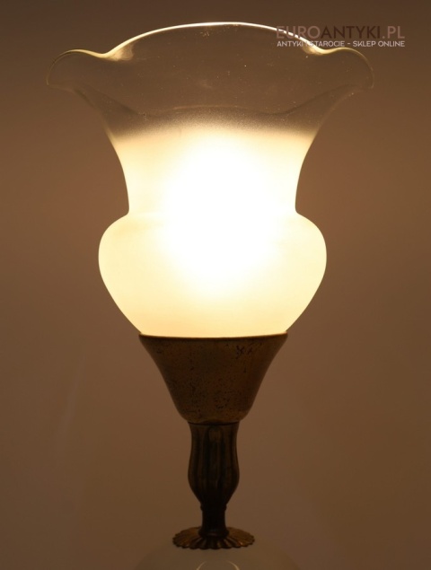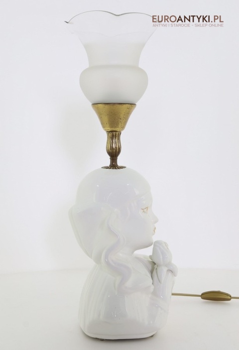 Wykonana z wysokiej jakości ceramiki szkliwionej, z ręcznie złoconymi detalami – brwiami, ustami, paznokciami i guzikiem. Klosz z matowego szkła o pięknie falowanym brzegu, osadzony na detalach z mosiądzu. Takie materiały jak ceramika i mosiądz są obecnie rzadko spotykane w produkcji masowej ze względu na wysokie koszty – to prawdziwa ozdoba, której nie da się podrobić w plastiku.