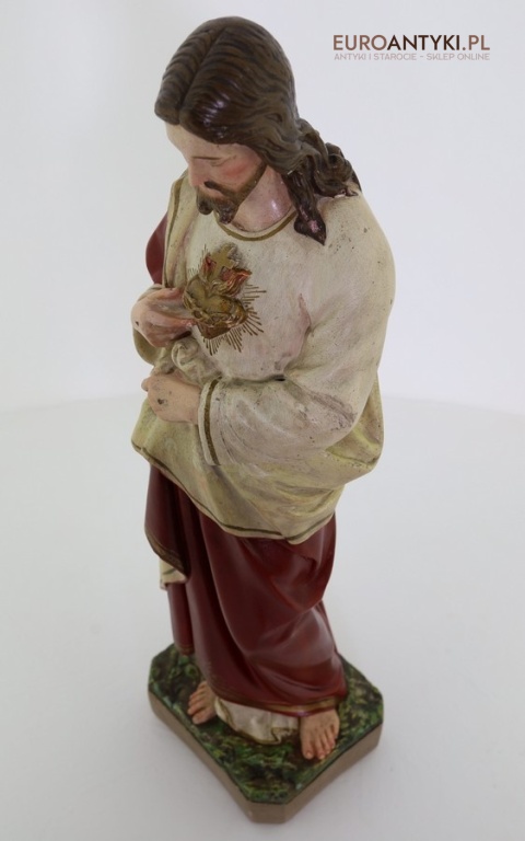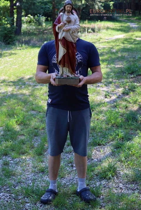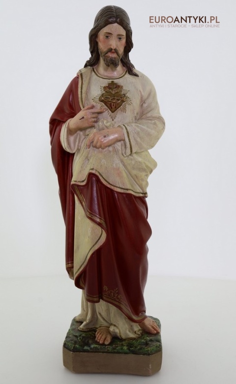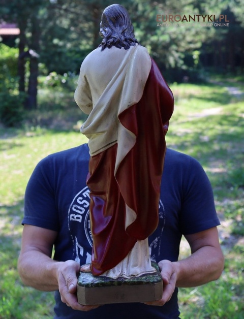 XL! DUŻA! Ręcznie malowana figurka religijna z gipsu, przedstawienie najświętszego serca pana Jezusa - początek XX wieku