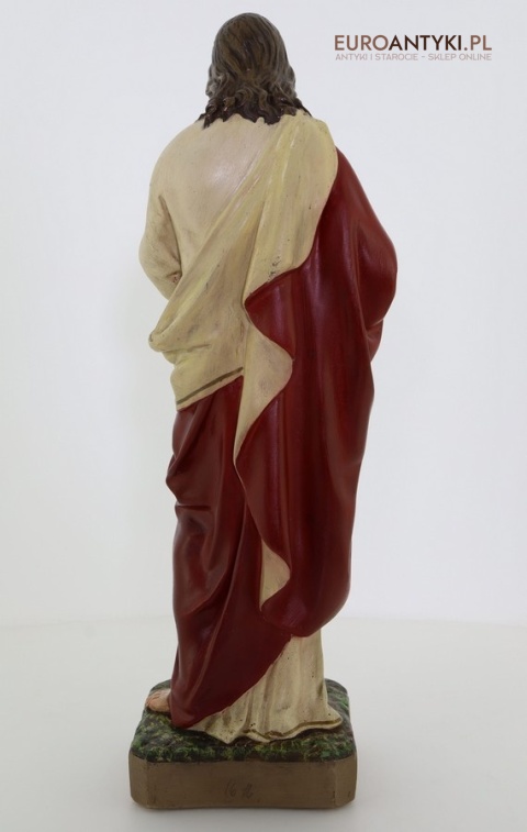 Wyjątkowa, duża figurka gipsowa przedstawiająca Jezusa Chrystusa z symbolem Najświętszego Serca Pana Jezusa na piersi. Pochodzi z Francji, zakupiona na giełdzie antyków w Marsylii. Figurka utrzymana jest w klasycznym francuskim stylu dewocjonalnym, popularnym w okresie międzywojennym (ok. 1920–1940). Styl ten wyróżnia się subtelną polichromią, dbałością o realistyczne detale twarzy i dłoni oraz starannym oddaniem symboliki religijnej. Był szeroko rozpowszechniony w kaplicach, kościołach i domowych ołtarzykach, dziś idealnie sprawdzi się jako dekoracja wnętrza w klimacie retro, sakralnym lub kolekcjonerskim.