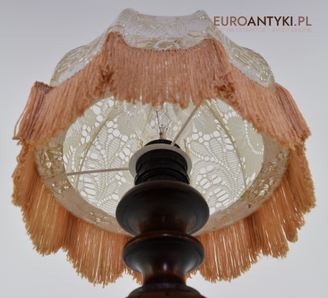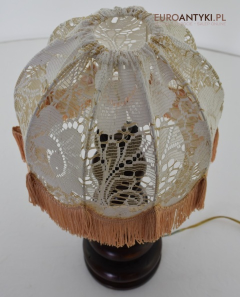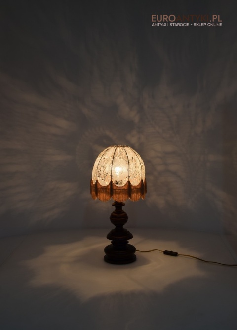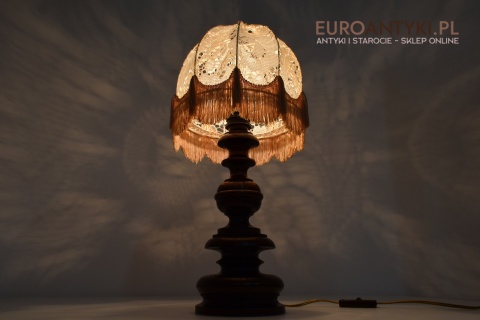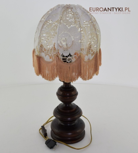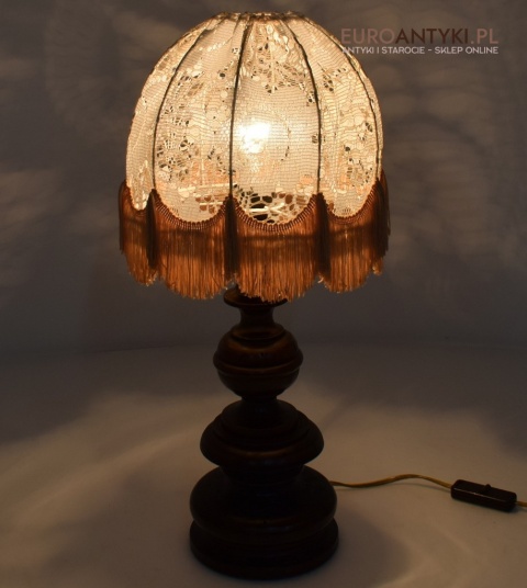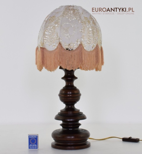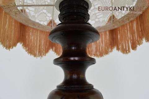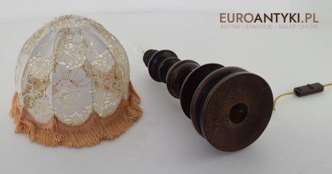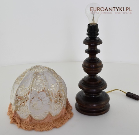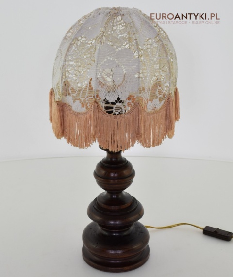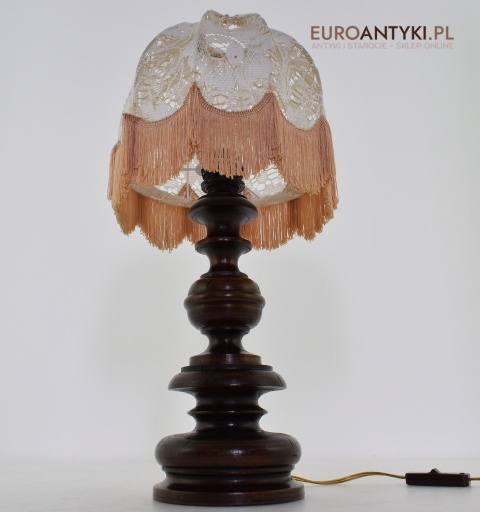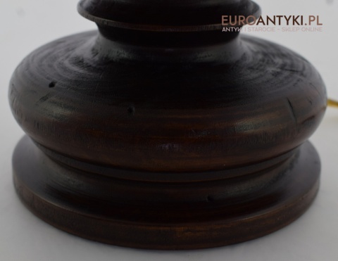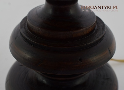 XL! WYSOKA! Prezentujemy rustykalną lampę stołową z litego drewna, pochodzącą z połowy XX wieku, sprowadzoną z Francji. Ta unikalna lampa zachwyca swoim wykonaniem i niepowtarzalnym stylem, który doskonale wpasuje się w klasyczne i rustykalne wnętrza. Lampa jest w bardzo dobrym stanie, a jej elektryka została całkowicie wymieniona na nową, co gwarantuje bezpieczeństwo użytkowania. Abażur ręcznie dziergany w idealnym stanie / wyprany i jest jak nowy.