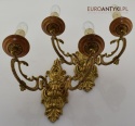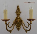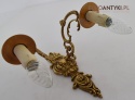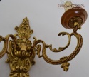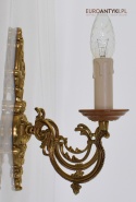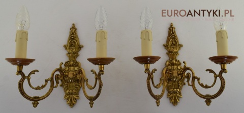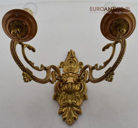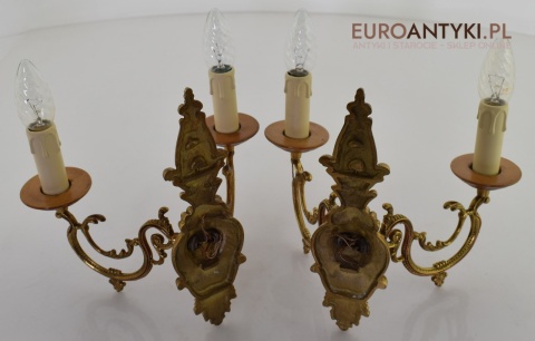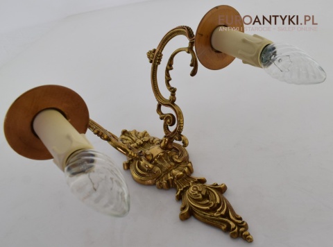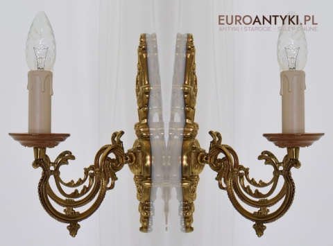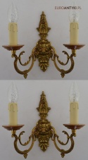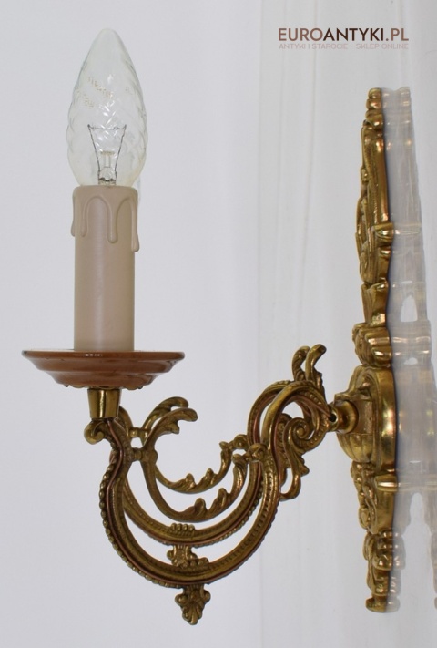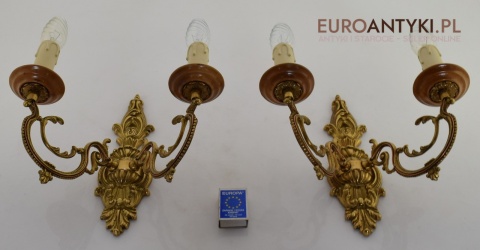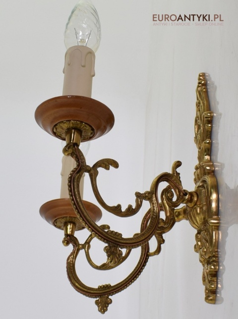 Para starodawnych kinkietów mosiężnych w dworskim klimacie. Sprowadzone z Francji. Pochodzą z połowy ubiegłego wieku. Wykonane z pięknych odlewów mosiężnych i drewnianych rozetek pod gilzami. Z tyłu rozet jest specjalne miejsce na zawieszenie na ścianie.