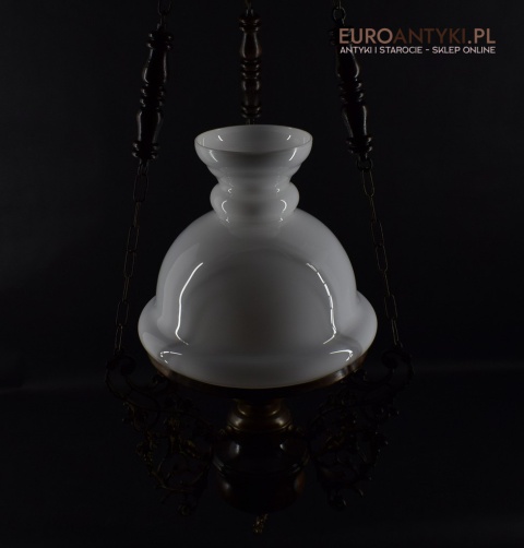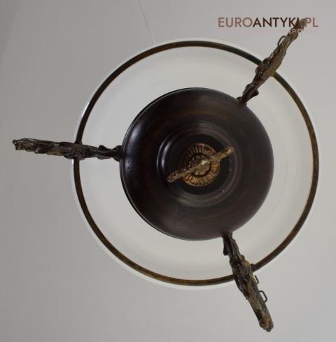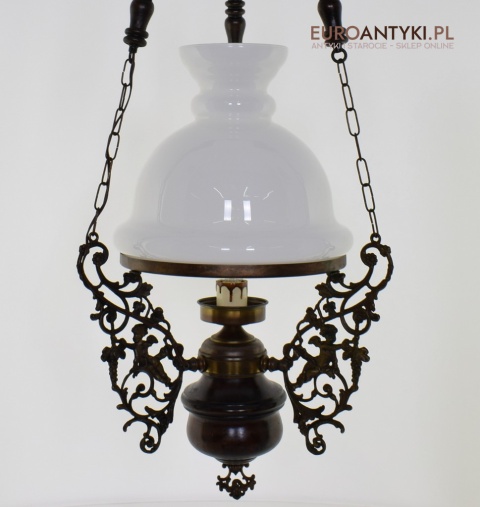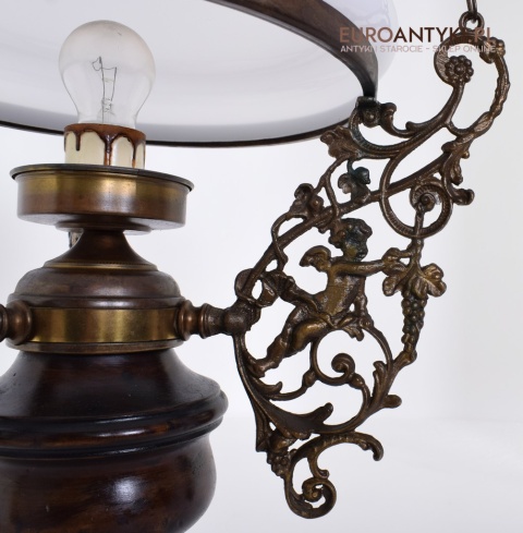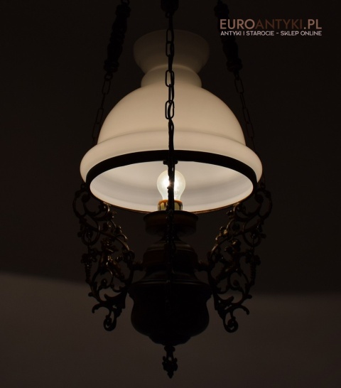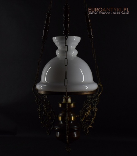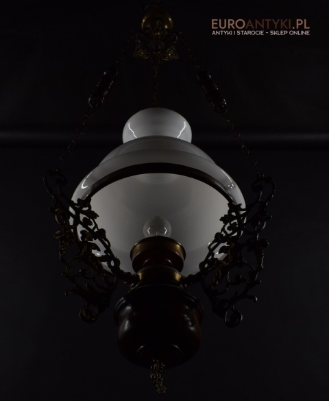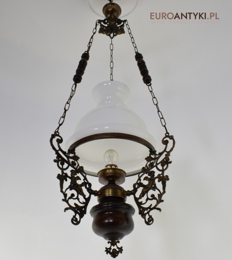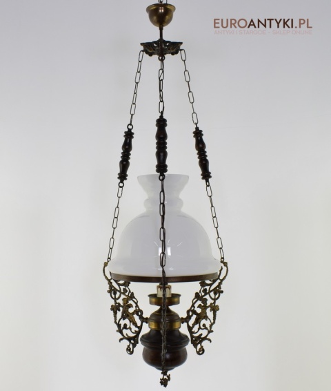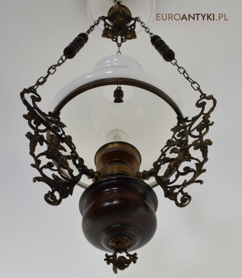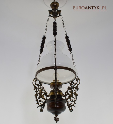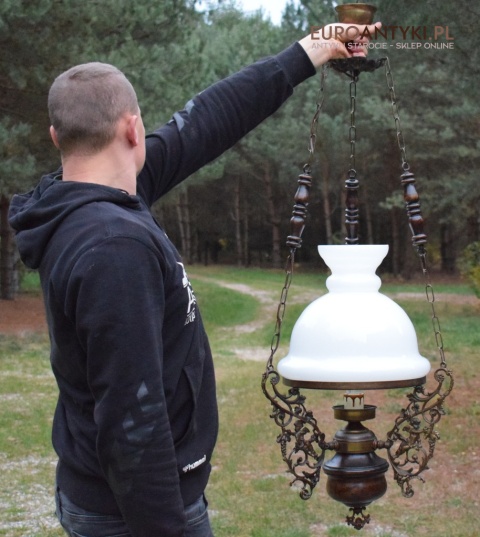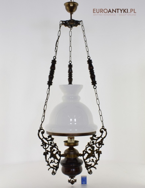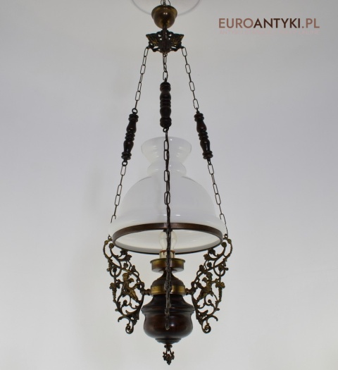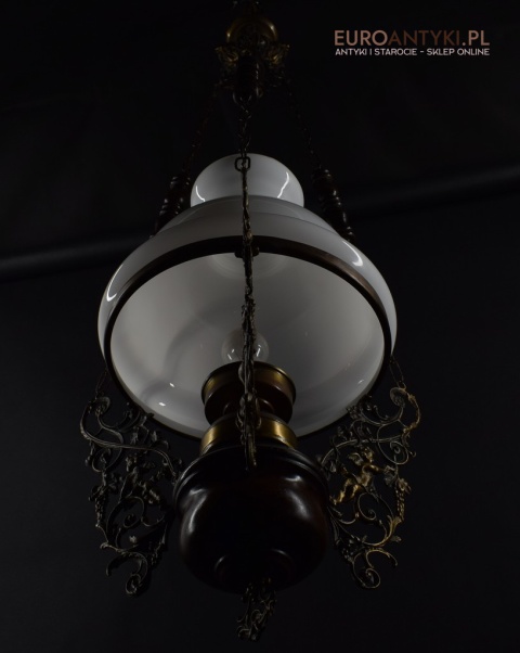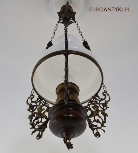 Sprowadzone z Francji, ale tego lampy były typowe w Beneluxie. Wykonane z litego drewna, masywnego mosiądzu + szklany mleczny klosz w idealnym stanie.