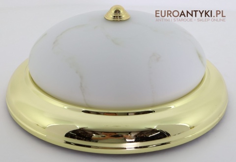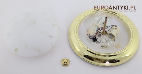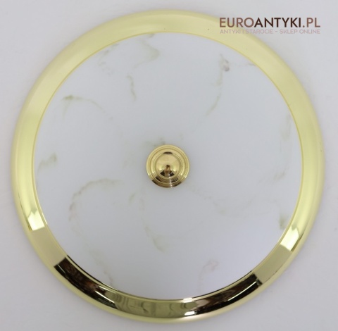 ✅ Plafon utrzymany w stylu retro-klasycznym, typowym dla wysokiej jakości oświetlenia z przełomu lat 60/70 – styl prosty, ale bardzo elegancki. Wyróżnia się złotym metalowym pierścieniem i kloszem o szklistym alabastrowym wykończeniu, które daje przyjemne, równomierne światło. Klosz został zabarwiony podczas produkcji szkła i wygląda jak bybył z alabastru.