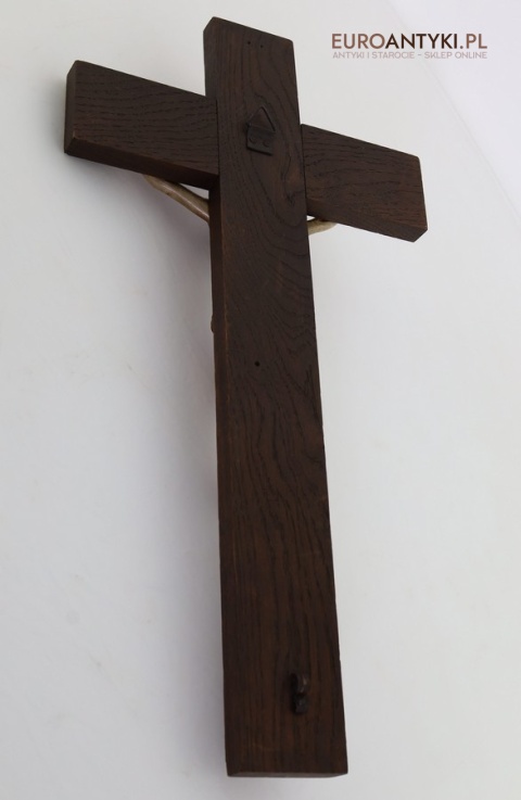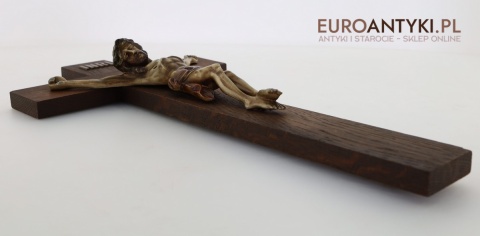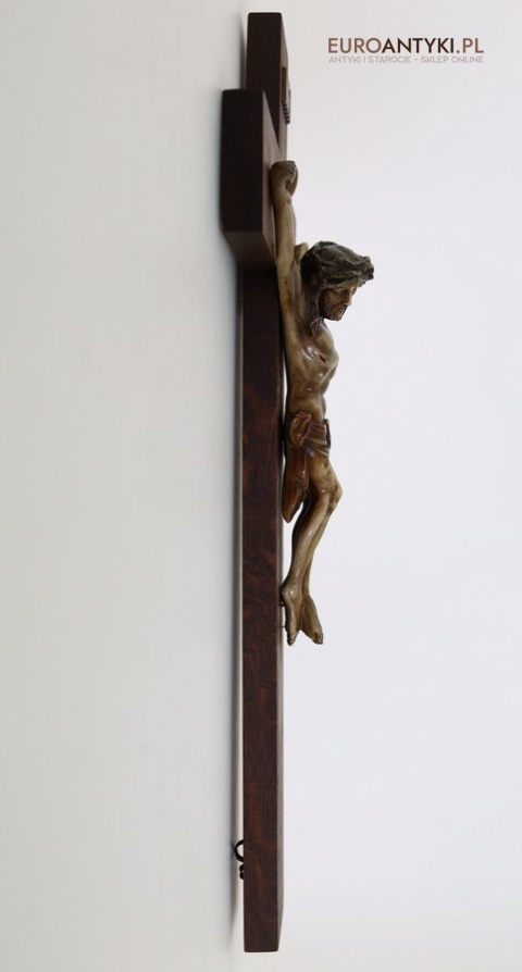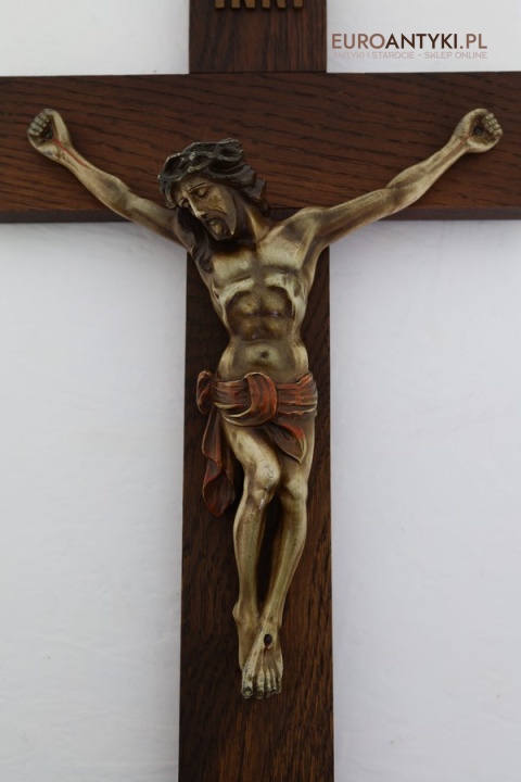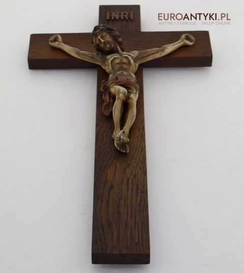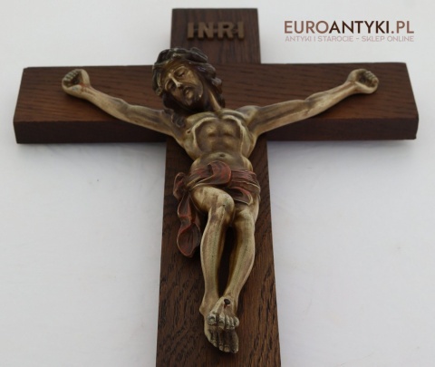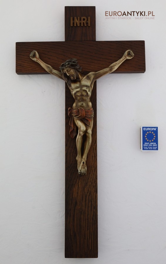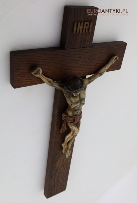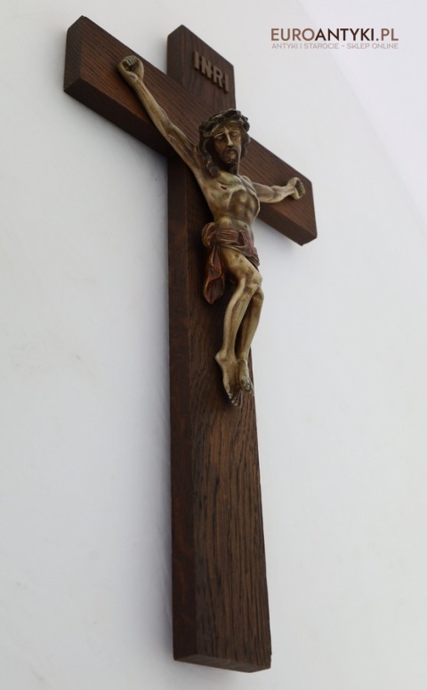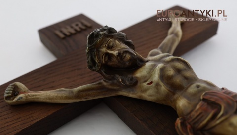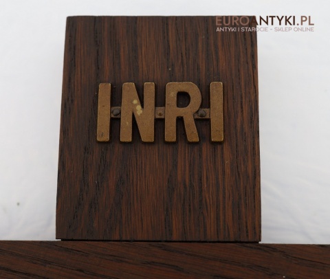 Przedstawiamy starodawny krucyfiks z końca XX wieku, wykonany z litego drewna oraz masywnego tworzywa sztucznego, przedstawiający postać Jezusa Chrystusa ukrzyżowanego. Nad głową Zbawiciela umieszczona jest tabliczka z napisem "INRI", co jest skrótem od łacińskiego wyrażenia: