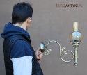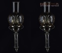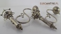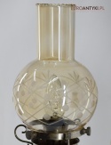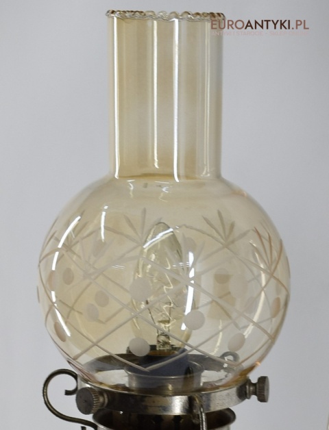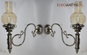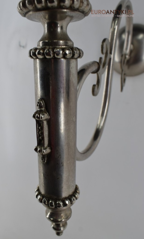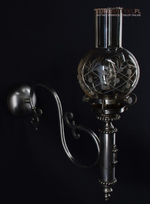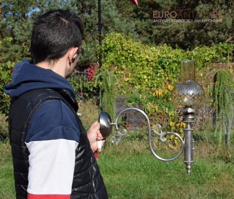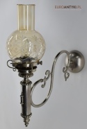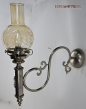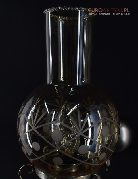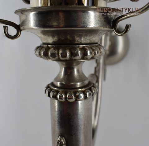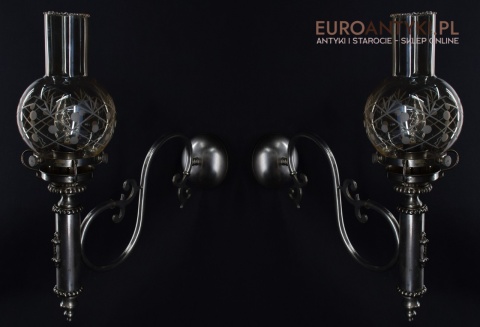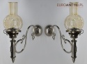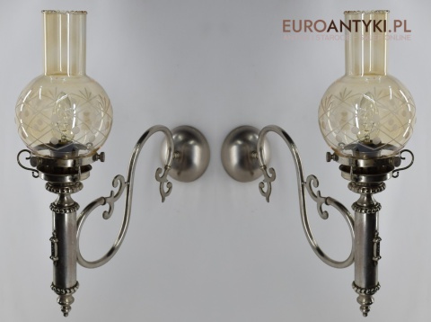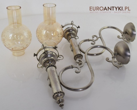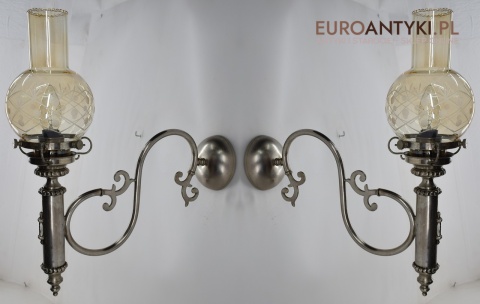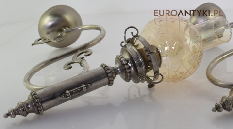 Sprowadzone z Austrii. Pochodzą z drugiej połowy XX wieku. Wykonane z mosiądzu niklowanego lub galwanizowanego. Celowo nie polerowaliśmy bo ładnie się zestarzały. Nalot, patyna jest czymś co w świecie antyków i staroci jest pożądane. Piękne szklane klosze ręcznie szlifowane w kolorze lekko opalizującym - w super stanie.