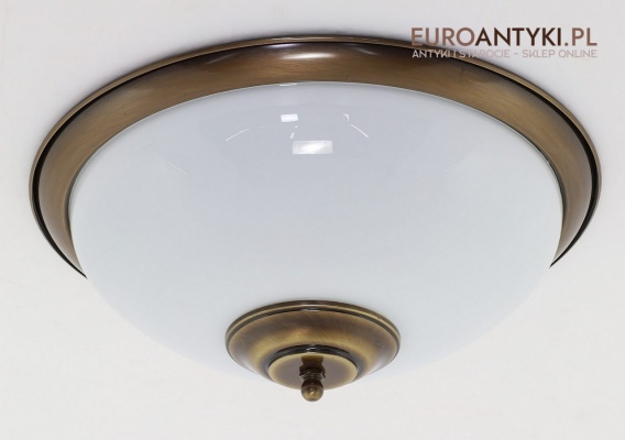 Plafony w stylu rustykalnym były popularne w domach i dworkach, gdzie ciepłe, rozproszone światło tworzyło przytulną atmosferę. Mosiądz, z którego wykonano ten plafon, jest stopem miedzi i cynku, co nadaje mu charakterystyczny, kolor i wyjątkową trwałość. Szklane klosze były cenione za ich zdolność do równomiernego rozpraszania światła, co sprawiało, że wnętrza wyglądały przytulnie i elegancko.