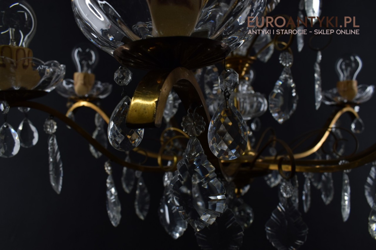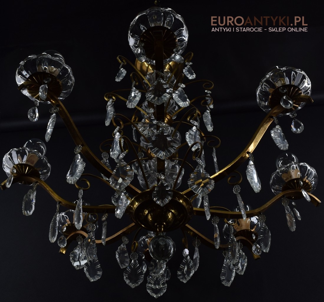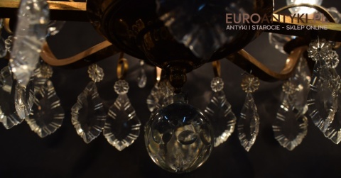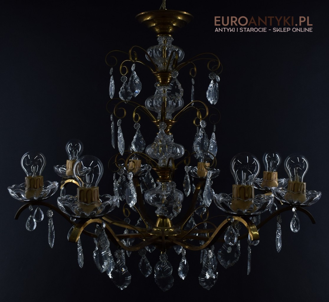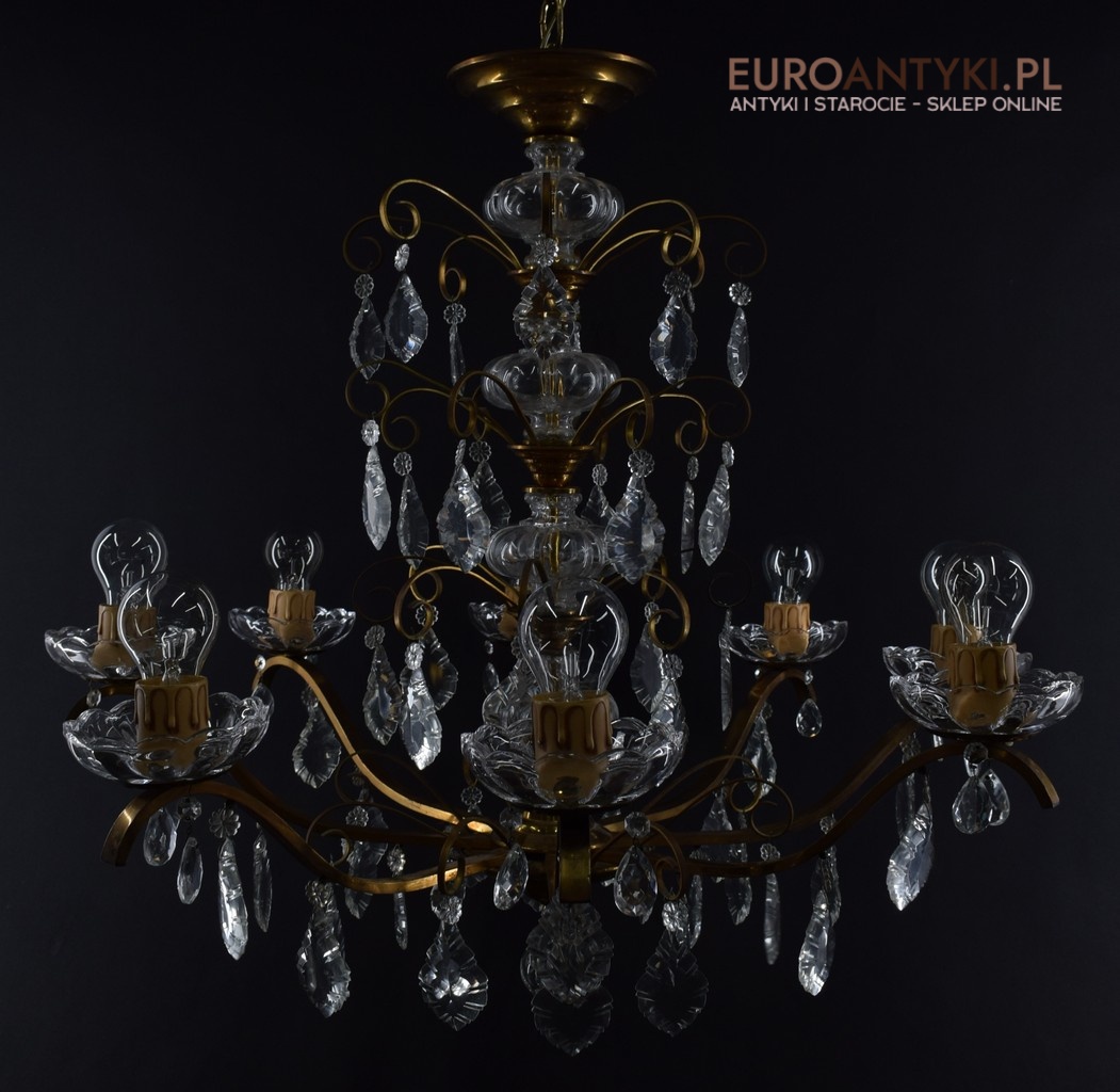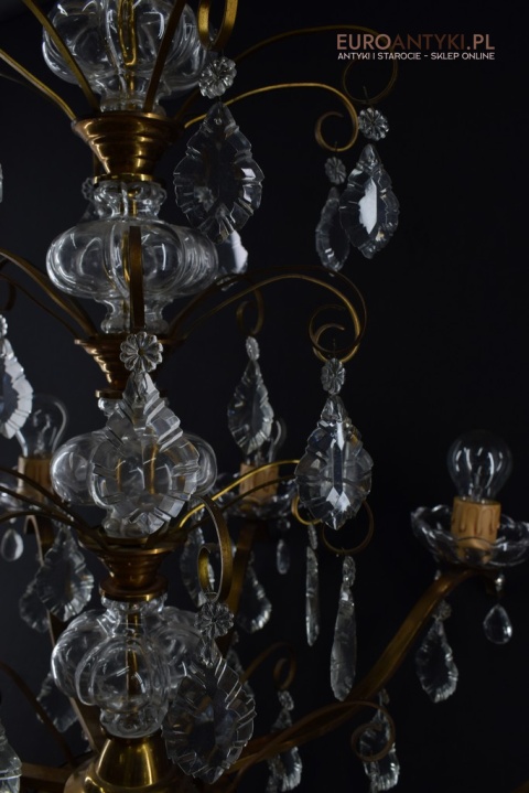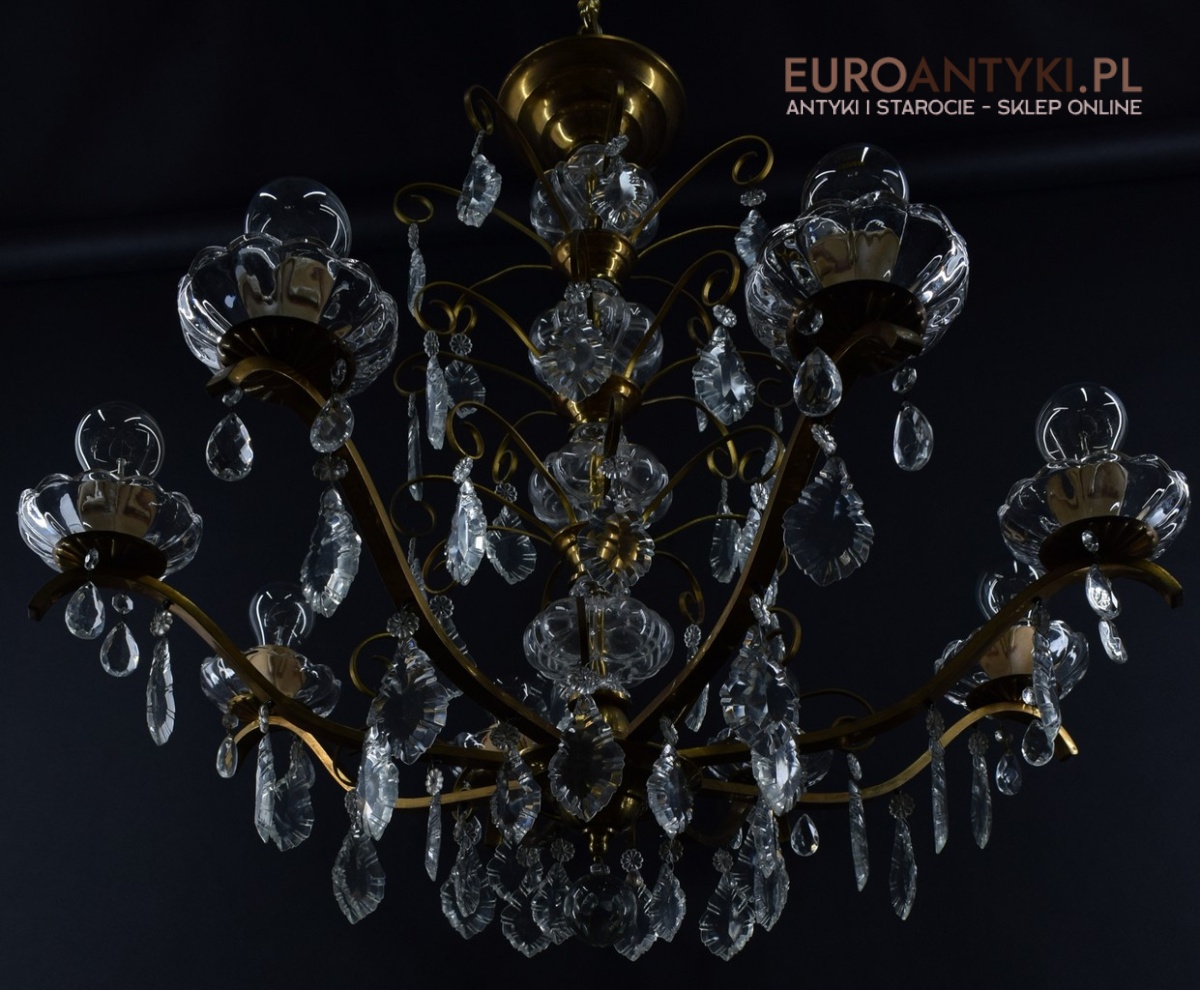 Sprowadzony z Austrii, ale wykonany w Francji. Prawdziwy antyk z mosiądzu + bogate kryształowe zawieszki. Pod gilzami duże i grube szklane rozety, tak samo jak w korpusie żyrandola. Pod spodem szklana kulka. Zero plastiku! Szkło i prawdziwe kryształy.