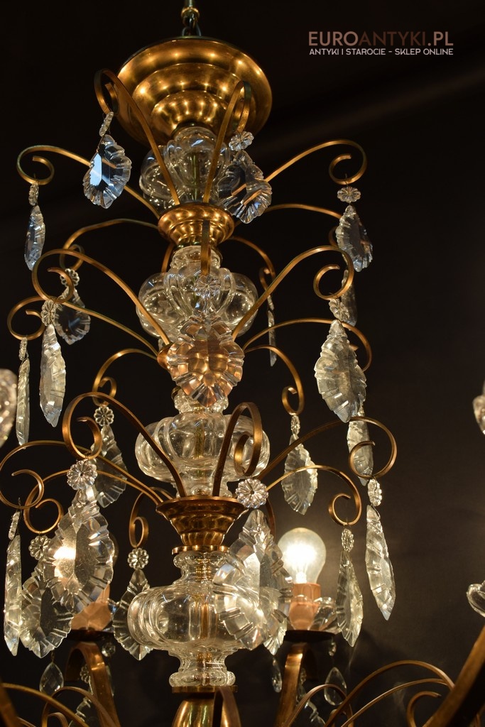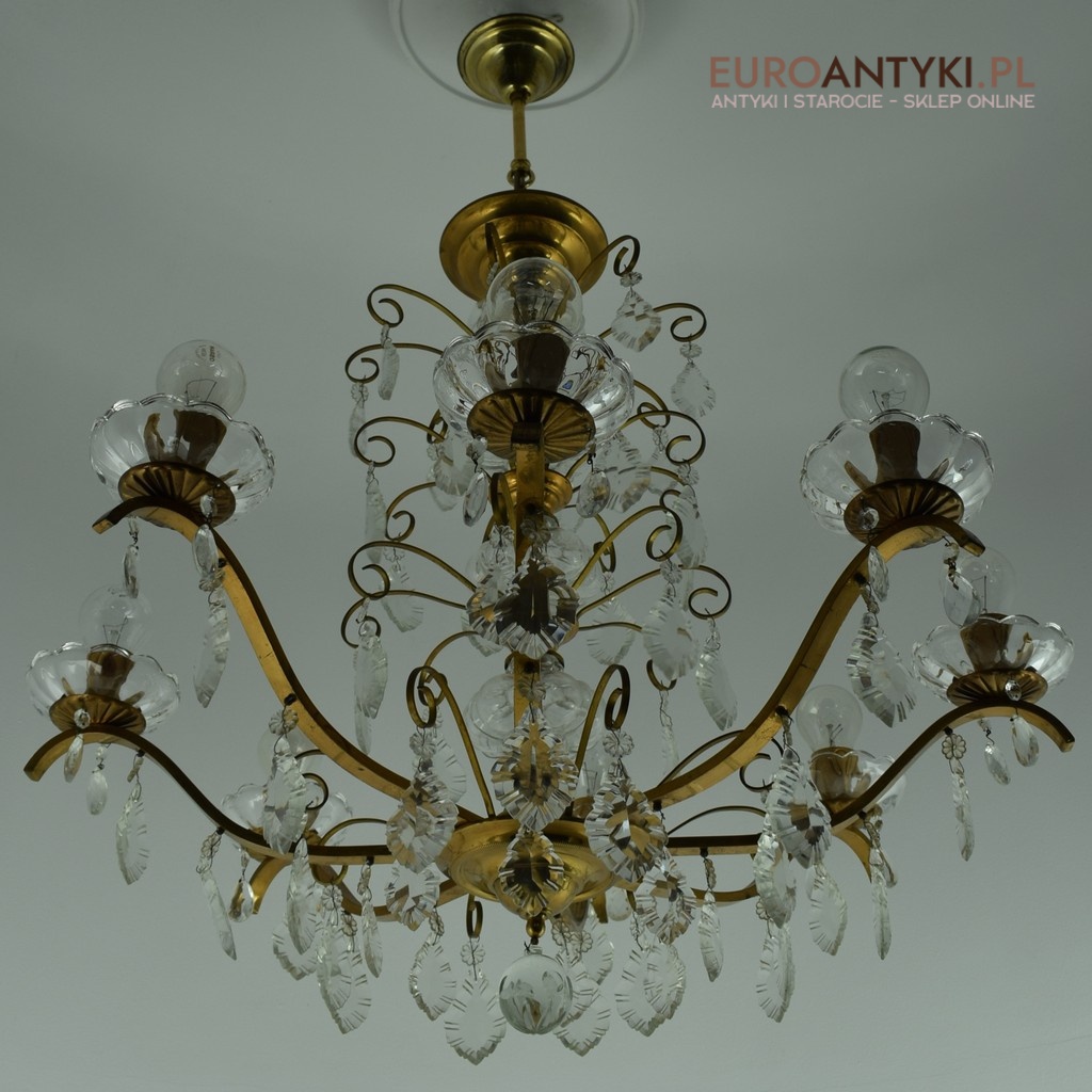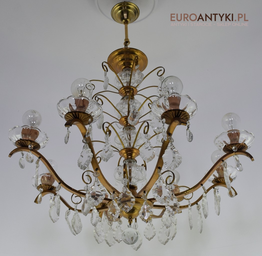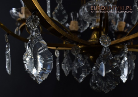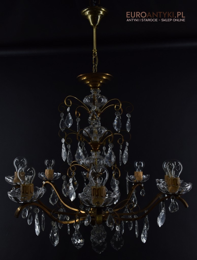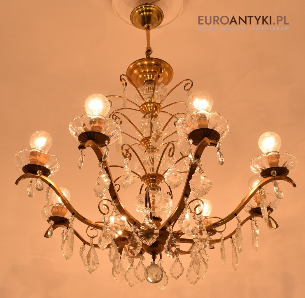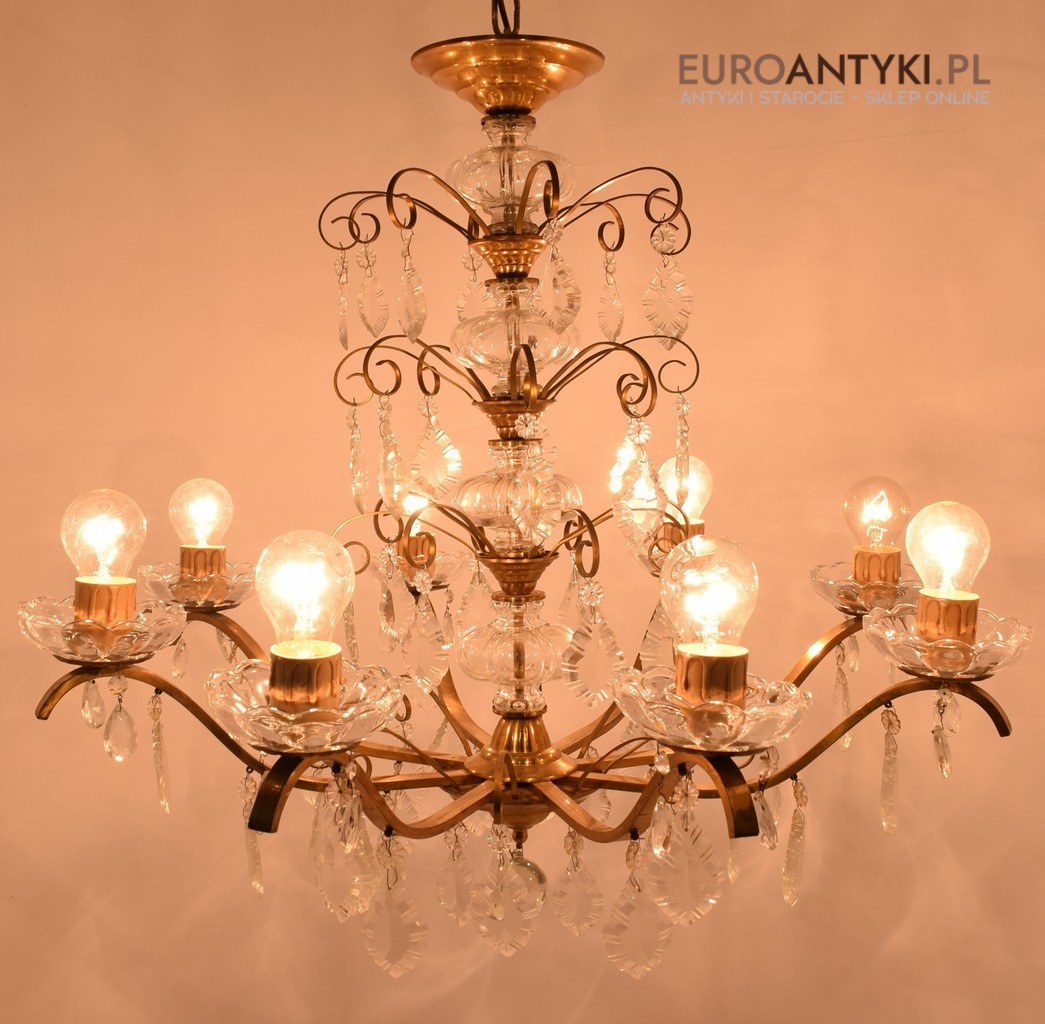 Sprowadzony z Austrii, ale wykonany w Francji. Prawdziwy antyk z mosiądzu + bogate kryształowe zawieszki. Pod gilzami duże i grube szklane rozety, tak samo jak w korpusie żyrandola. Pod spodem szklana kulka. Zero plastiku! Szkło i prawdziwe kryształy.