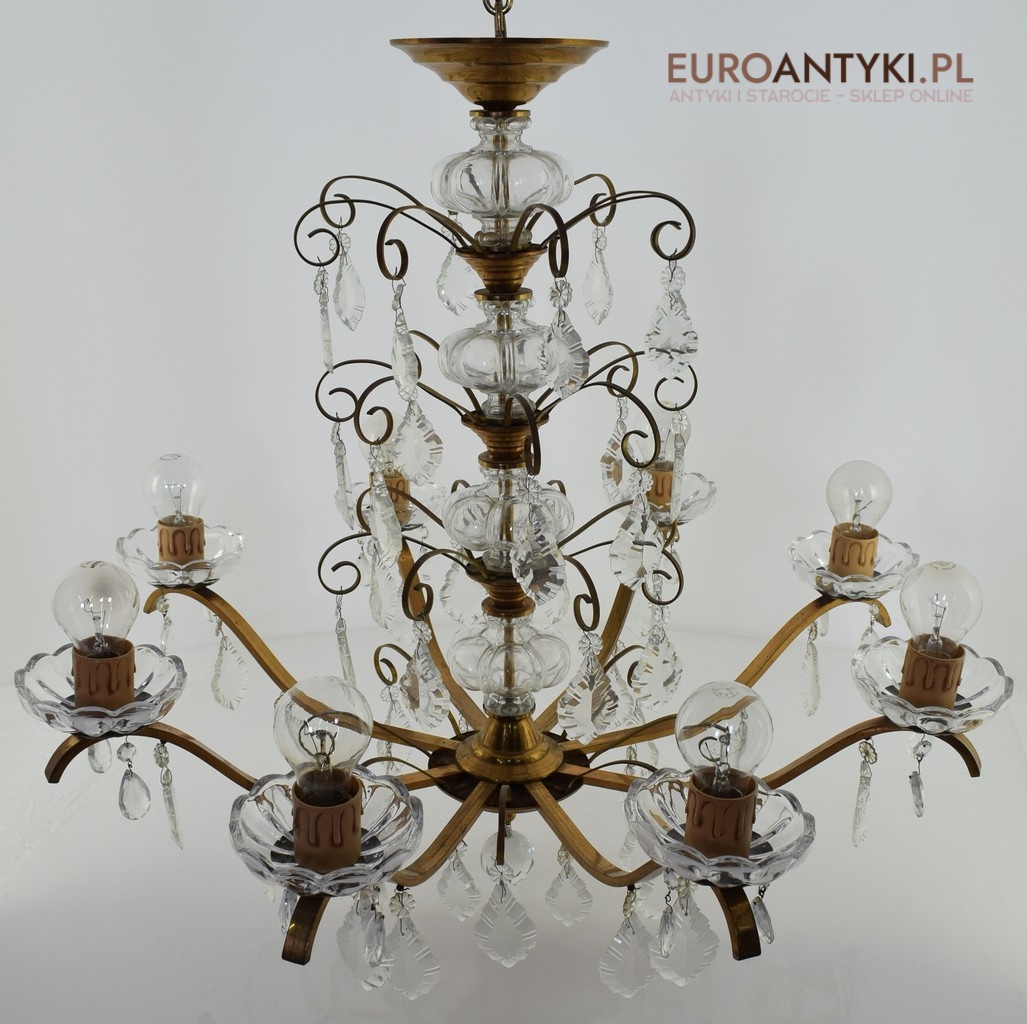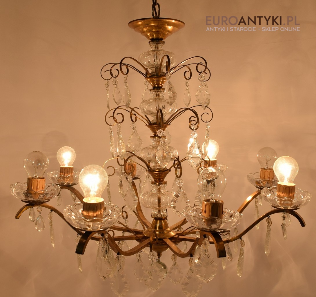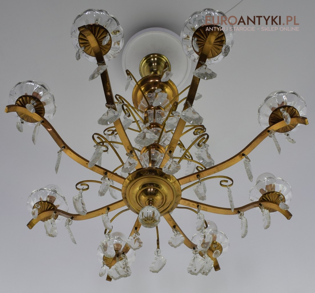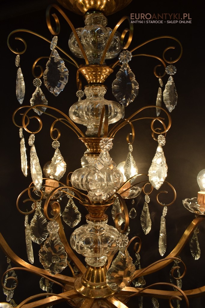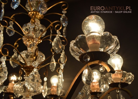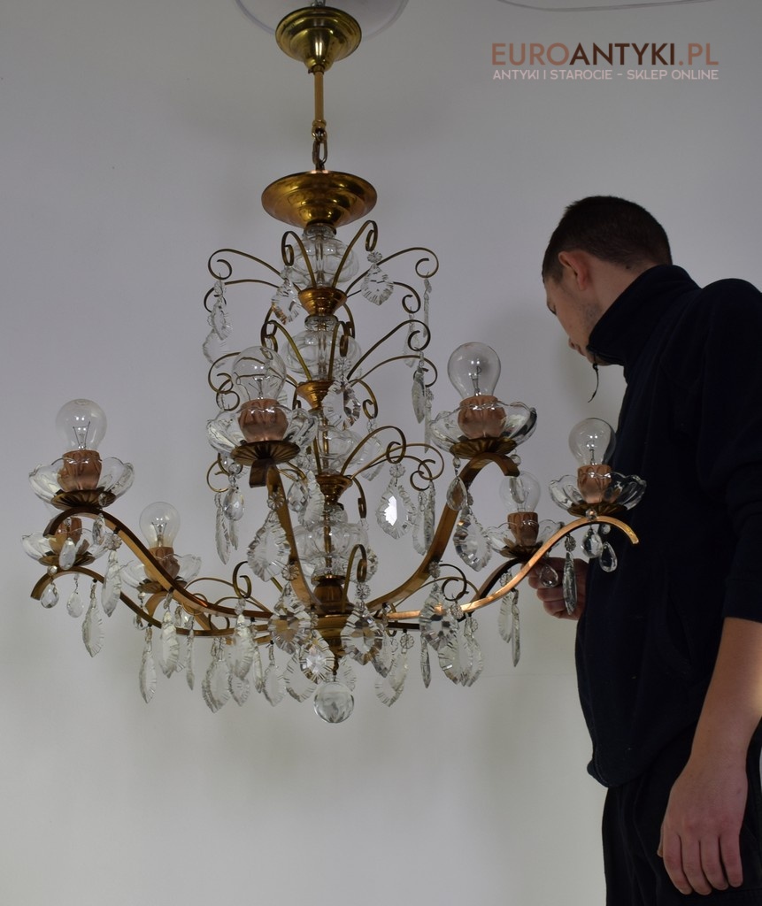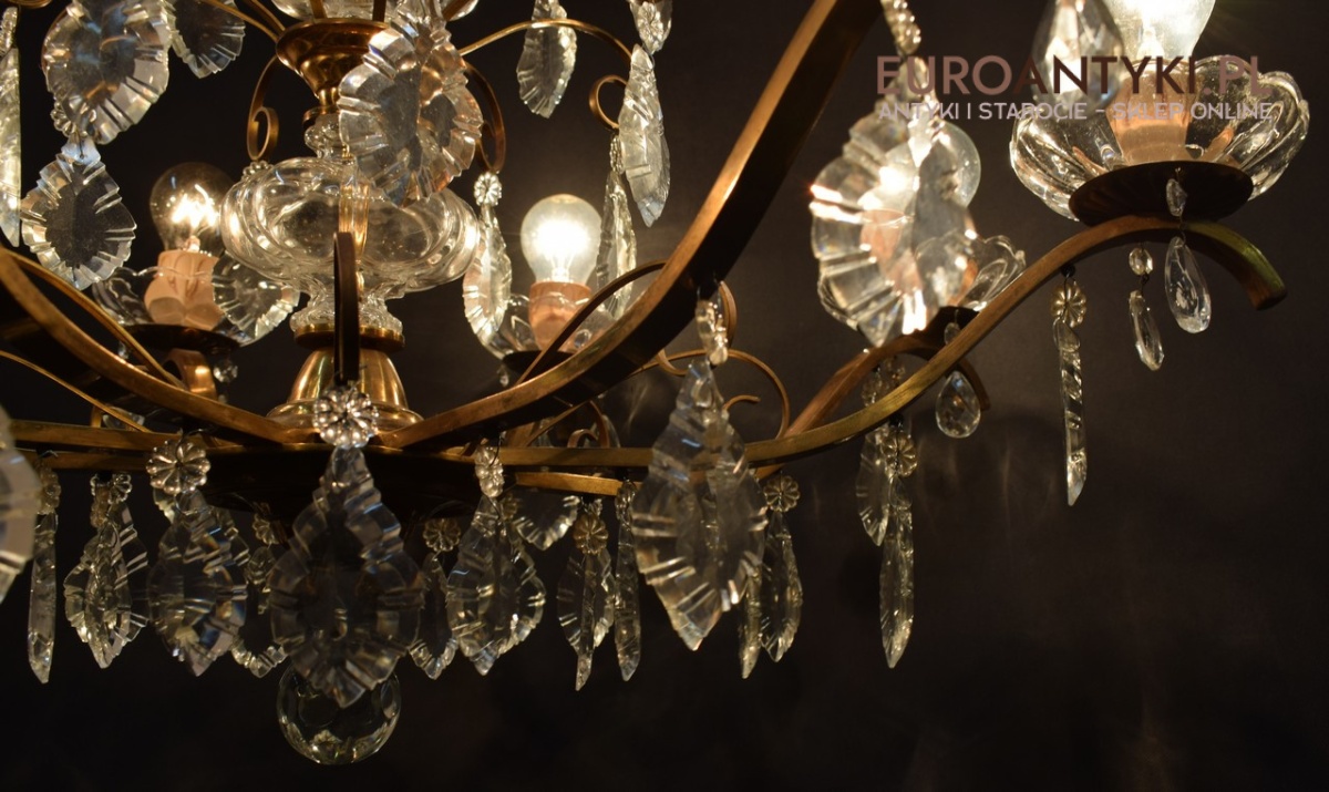 Sprowadzony z Austrii, ale wykonany w Francji. Prawdziwy antyk z mosiądzu + bogate kryształowe zawieszki. Pod gilzami duże i grube szklane rozety, tak samo jak w korpusie żyrandola. Pod spodem szklana kulka. Zero plastiku! Szkło i prawdziwe kryształy.