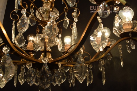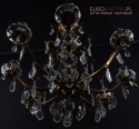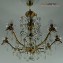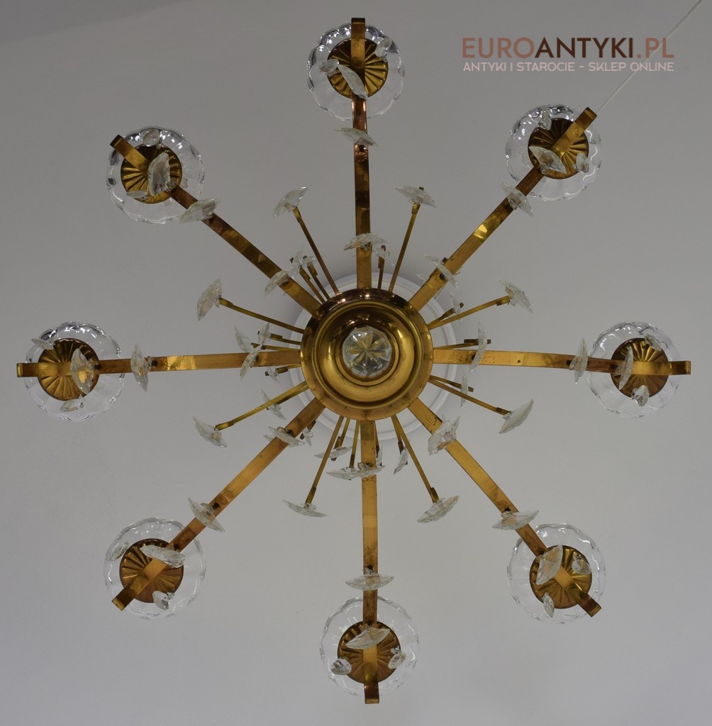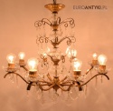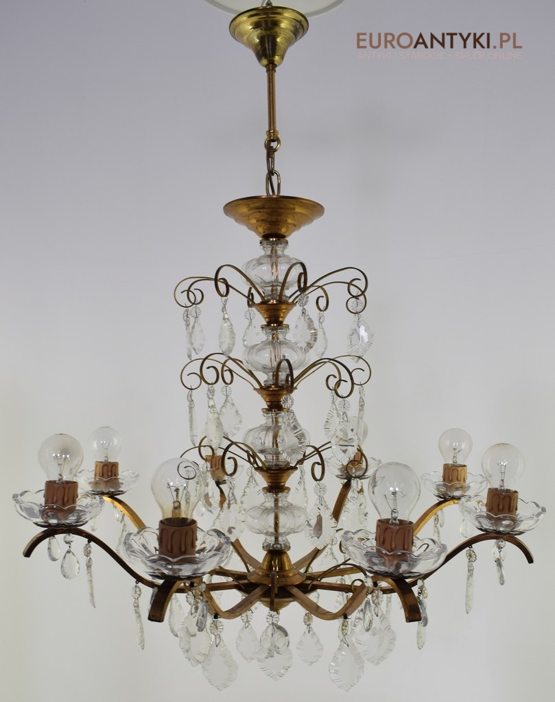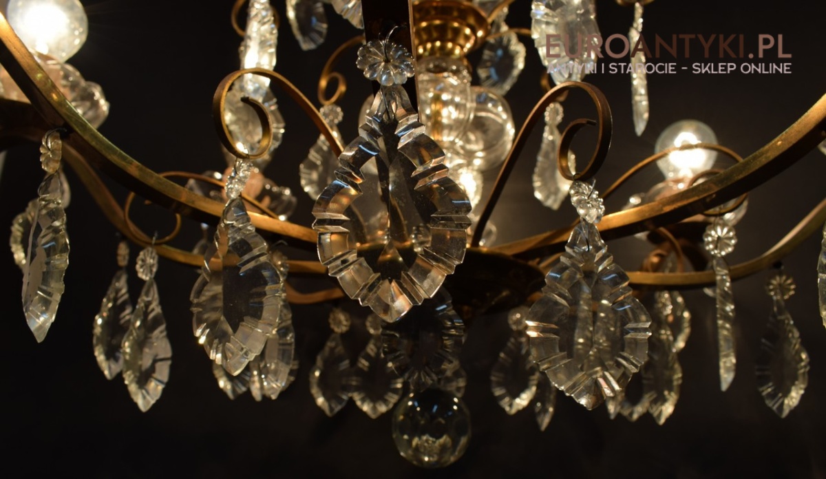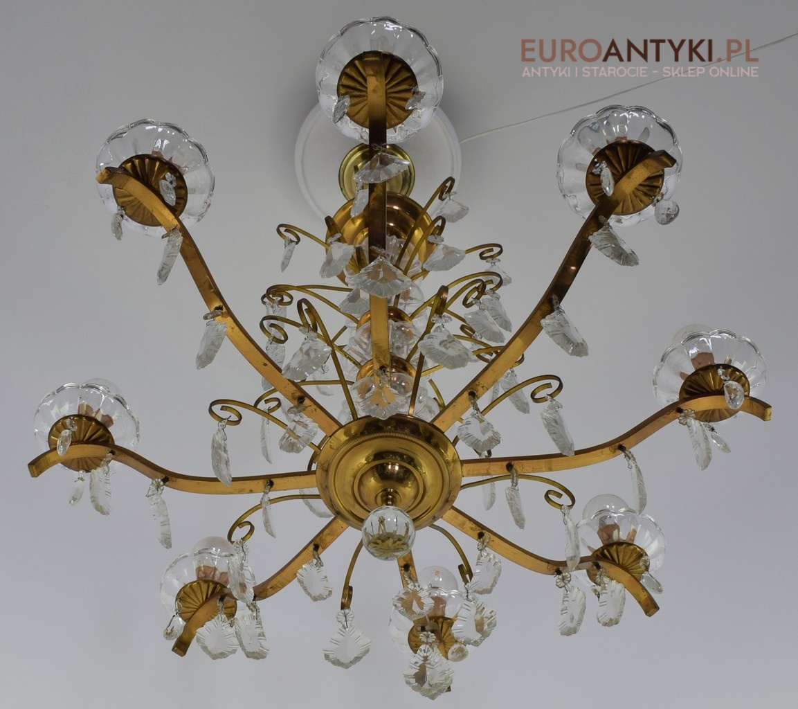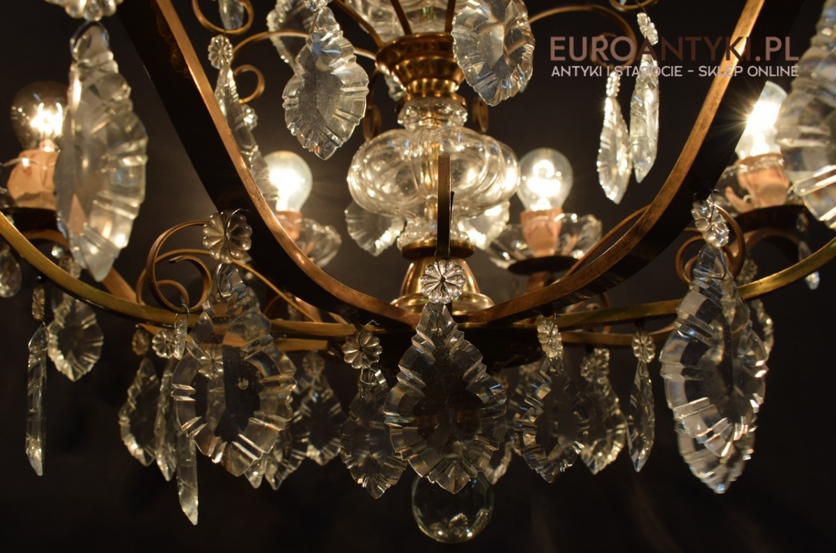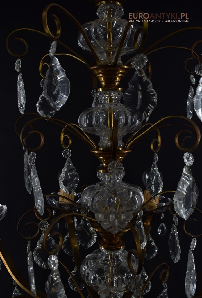 Sprowadzony z Austrii, ale wykonany w Francji. Prawdziwy antyk z mosiądzu + bogate kryształowe zawieszki. Pod gilzami duże i grube szklane rozety, tak samo jak w korpusie żyrandola. Pod spodem szklana kulka. Zero plastiku! Szkło i prawdziwe kryształy.