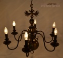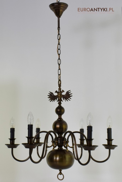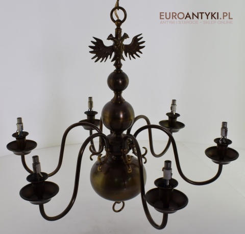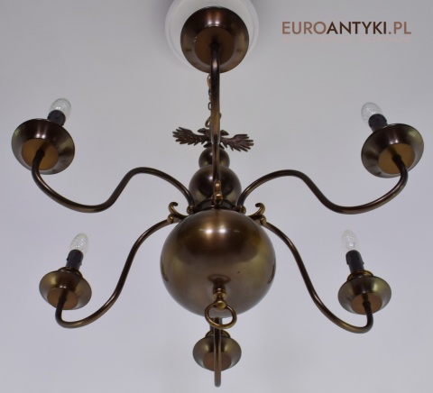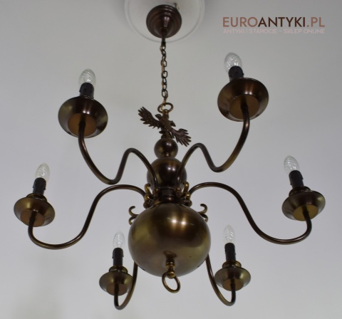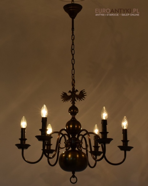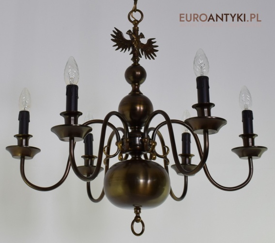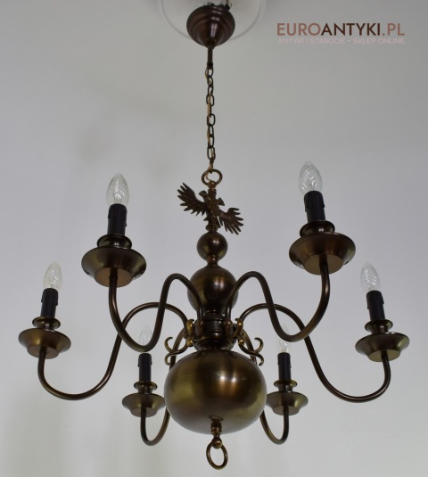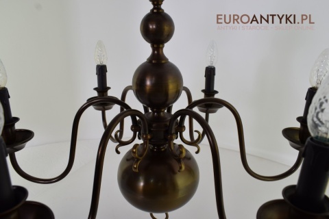 Ten duży, klasyczny żyrandol to idealne rozwiązanie dla Twojego salonu. Wykonany z brązu, pochodzi z połowy ubiegłego wieku i został sprowadzony prosto z Francji. Jego elegancja doda wnętrzu niepowtarzalnego uroku. Wykonany z brązu. Gilzy wymienione na nowe w stylu vintage - retro, o kolorze ciemnego brązu.