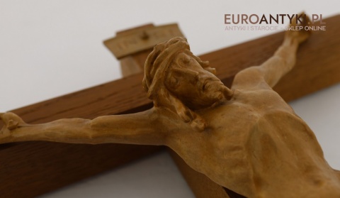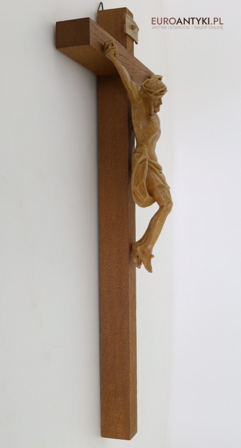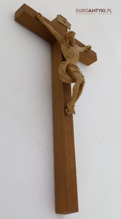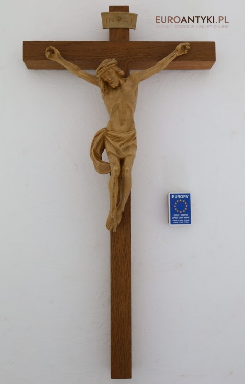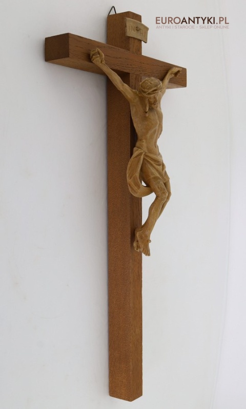 Materiał: lite drewno (krzyż), tworzywo sztuczne stylizowane na drewno (postać Jezusa i tabliczka INRI)