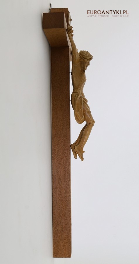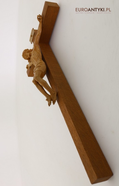 Przedstawiamy oryginalny krucyfiks ścienny sprowadzony z Francji, wykonany w klasycznym stylu sakralnym, typowym dla połowy XX wieku. Krzyż charakteryzuje się masywnym wykonaniem z litego drewna, a postać Chrystusa oraz tabliczka INRI zostały wykonane z wysokiej jakości tworzywa sztucznego, perfekcyjnie imitującego drewno, z dbałością o każdy detal anatomiczny i fakturę materiału.