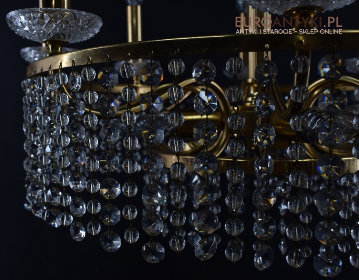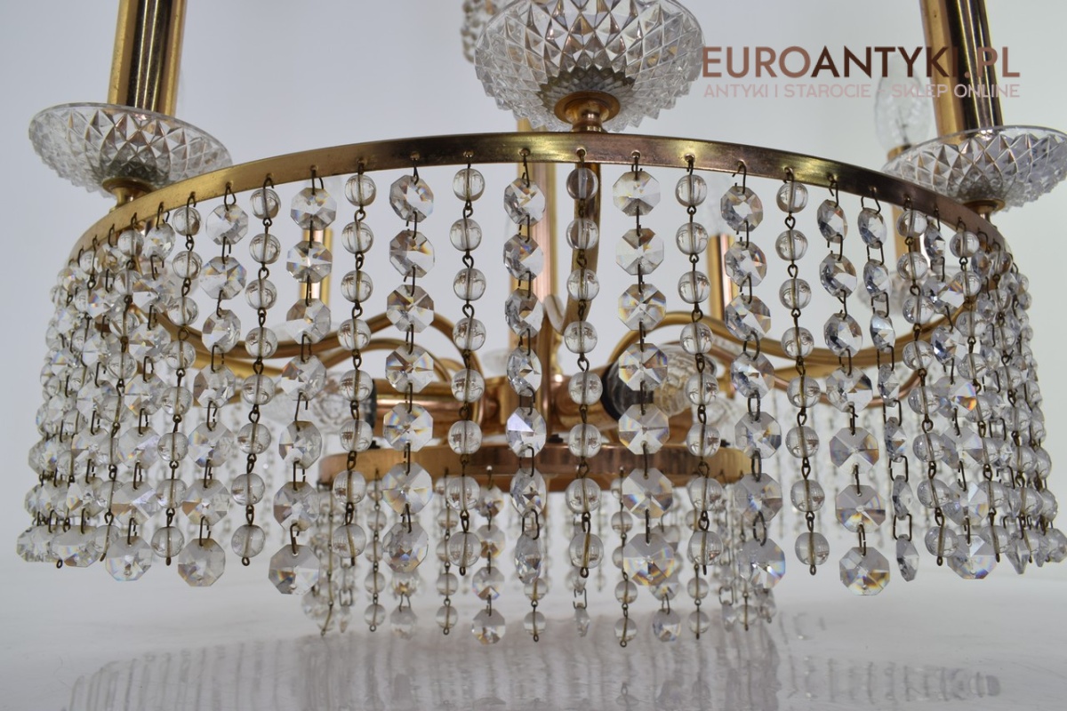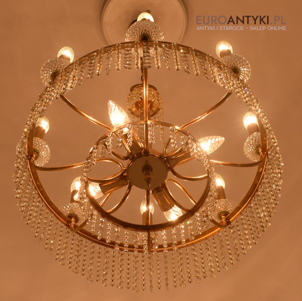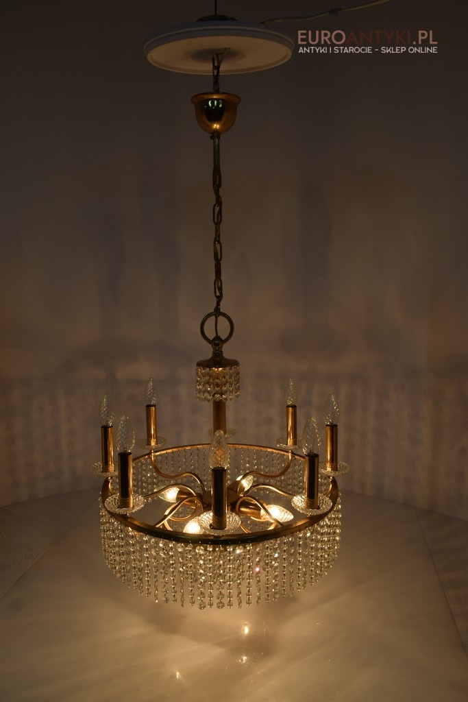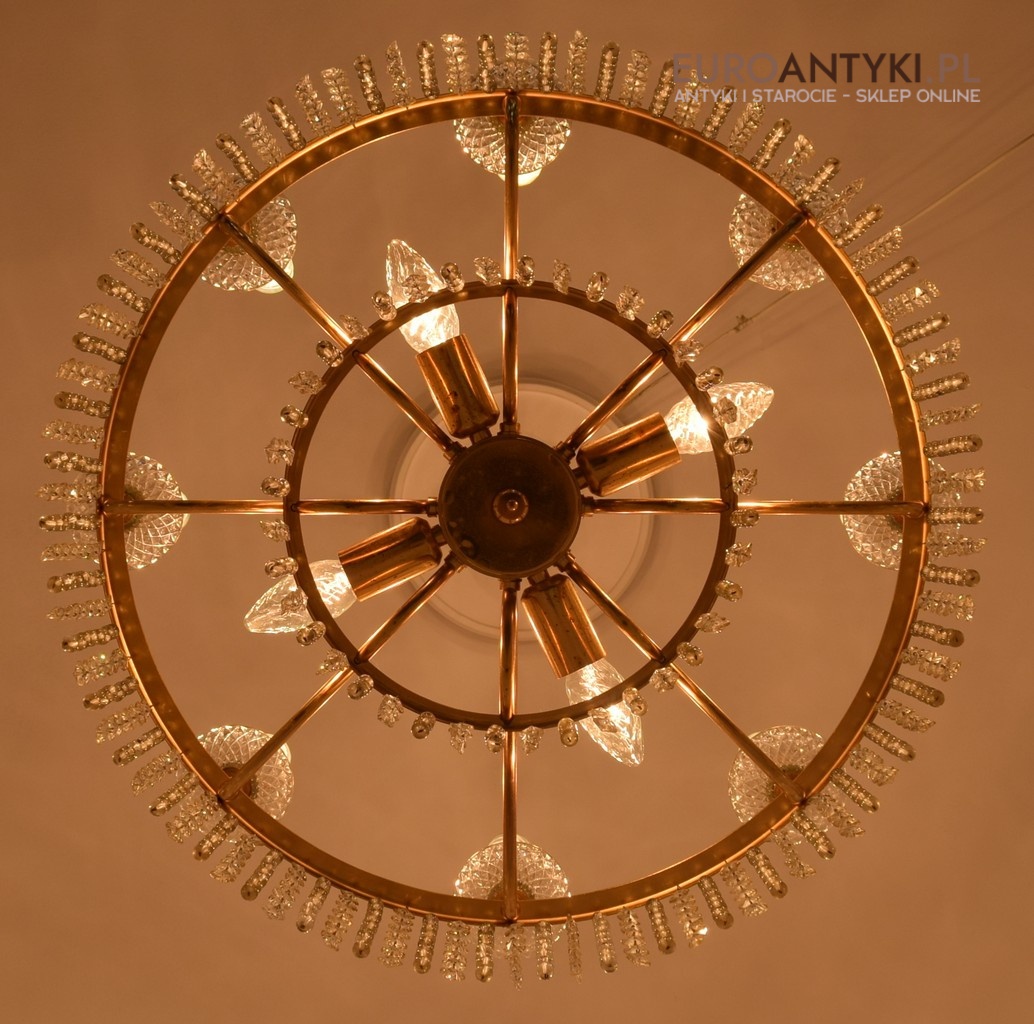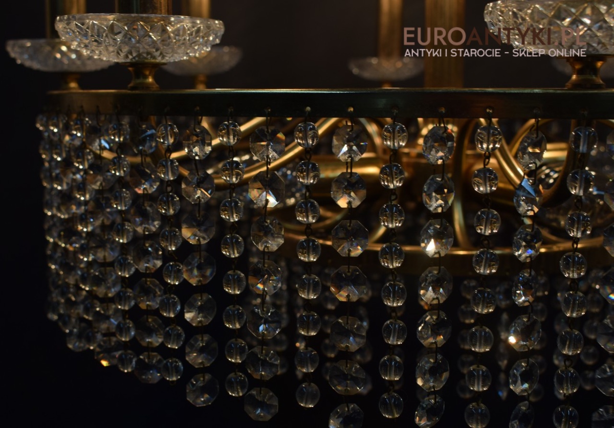 Sprowadzony z Austrii. Pochodzi z połowy ubiegłego wieku. Wykonany z masywnego mosiądzu + kryształowe zawieszki. Zawieszki kryształowe powodują rozszczepienie światła i widać piękne tęczowe kolory. Ciężko ten efekt uchwycić na zdjęciach, ale w realu wygląda to zjawiskowo. 100% kompletne, w bardzo dobrym stanie. Kryształowe talerzyki pod gilzami.