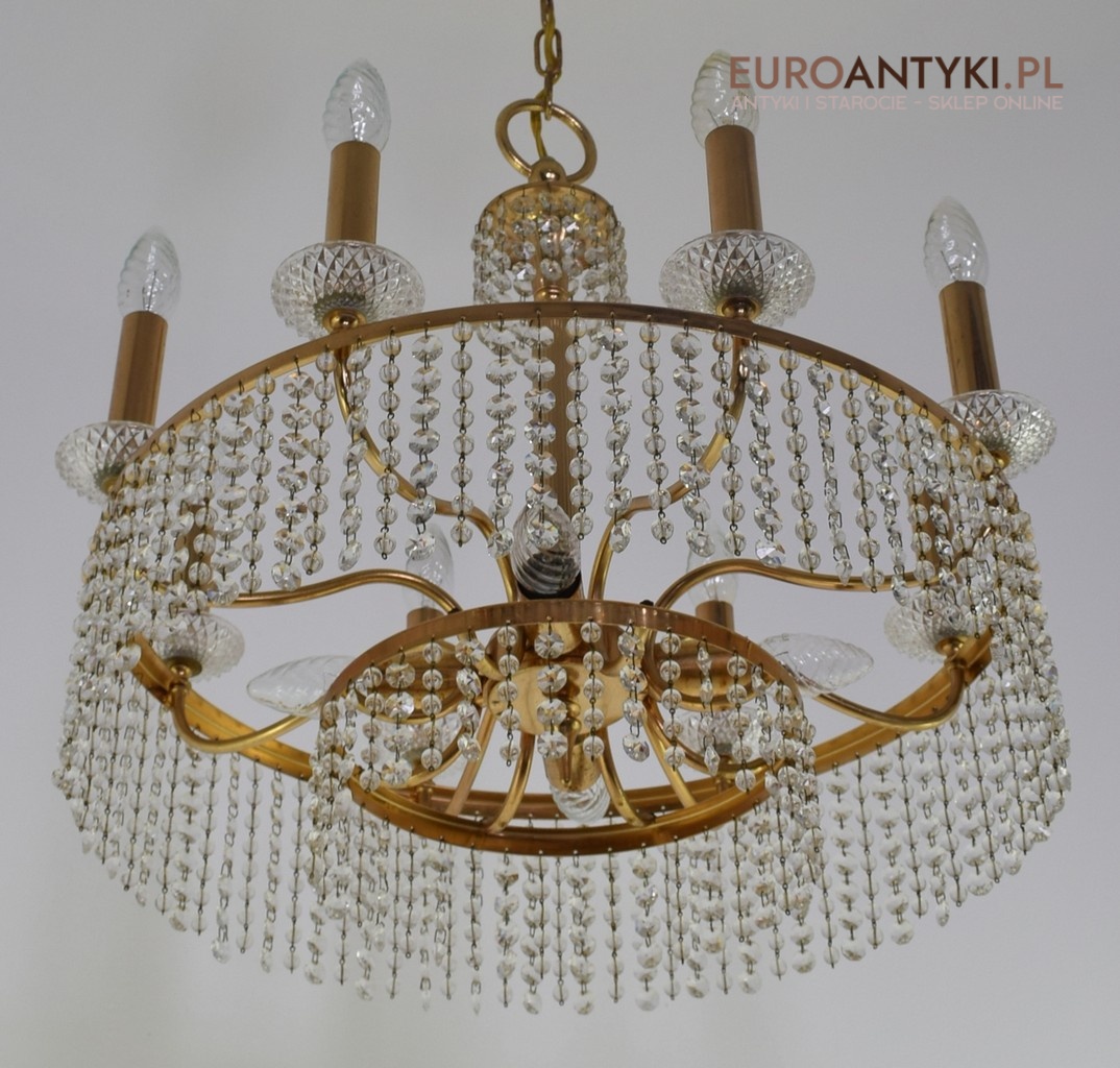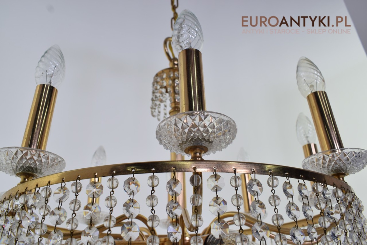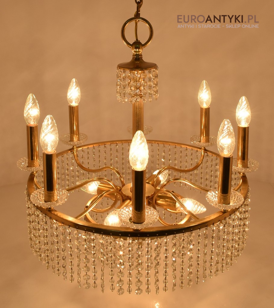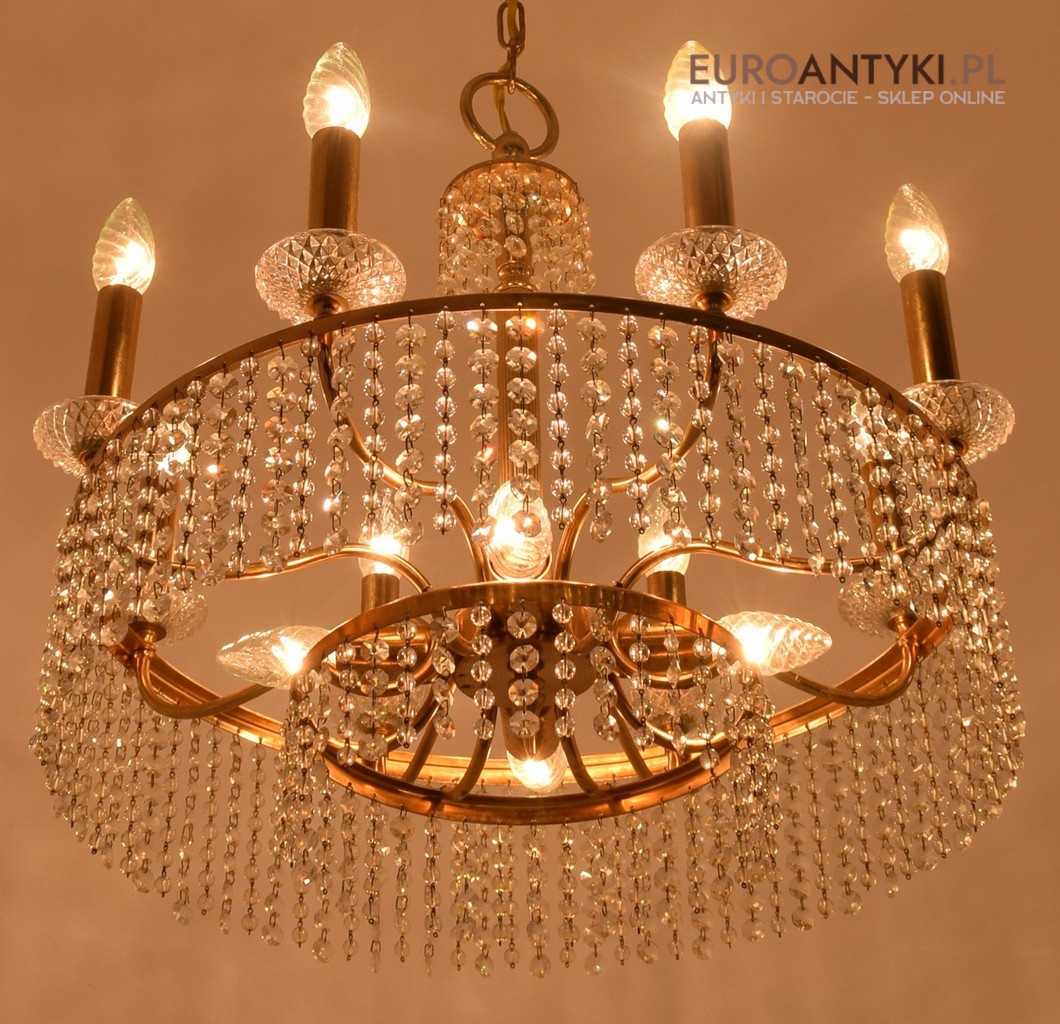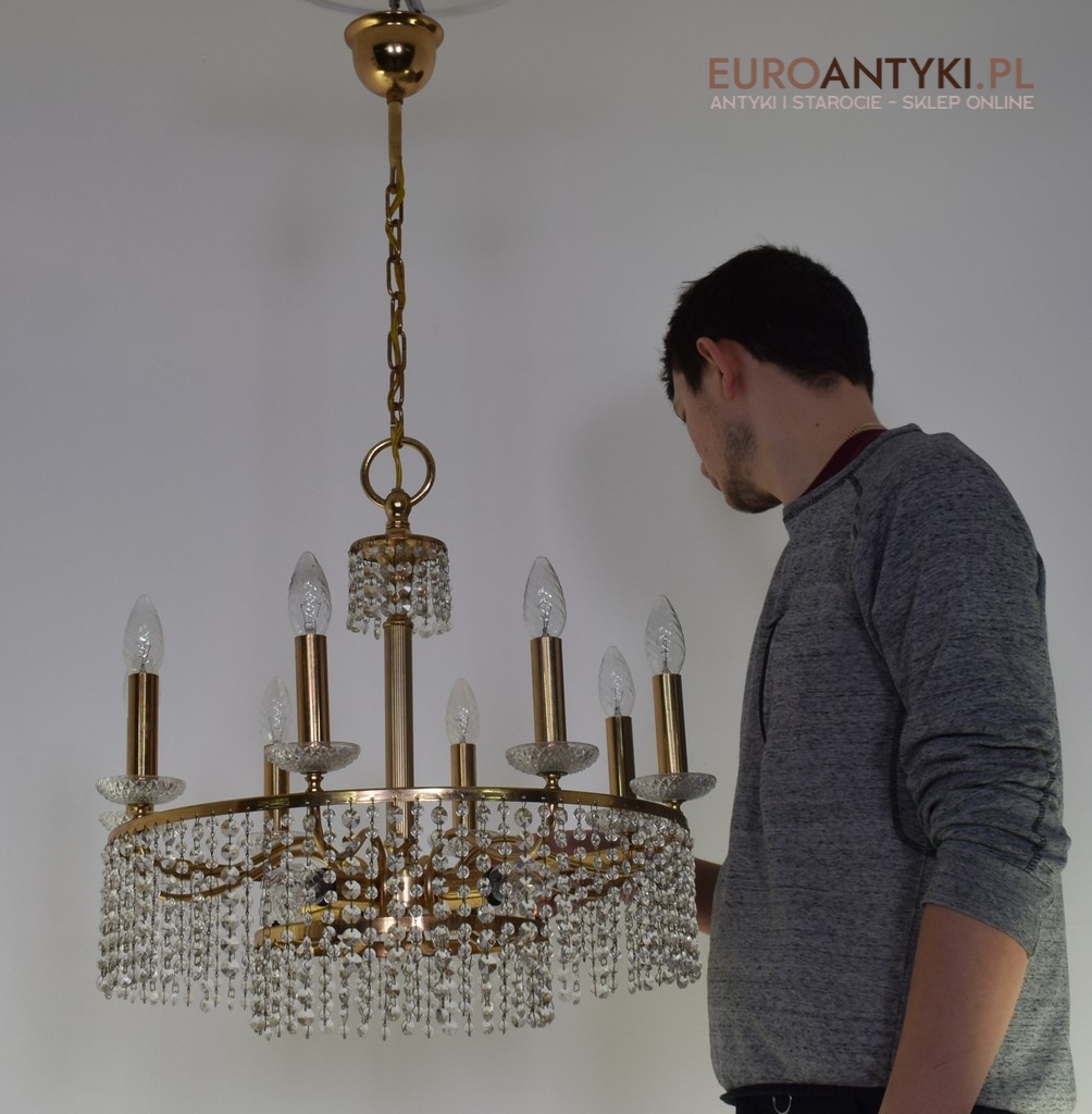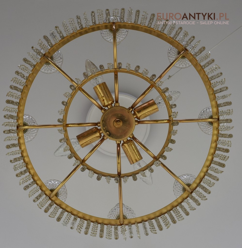 Sprowadzony z Austrii. Pochodzi z połowy ubiegłego wieku. Wykonany z masywnego mosiądzu + kryształowe zawieszki. Zawieszki kryształowe powodują rozszczepienie światła i widać piękne tęczowe kolory. Ciężko ten efekt uchwycić na zdjęciach, ale w realu wygląda to zjawiskowo. 100% kompletne, w bardzo dobrym stanie. Kryształowe talerzyki pod gilzami.