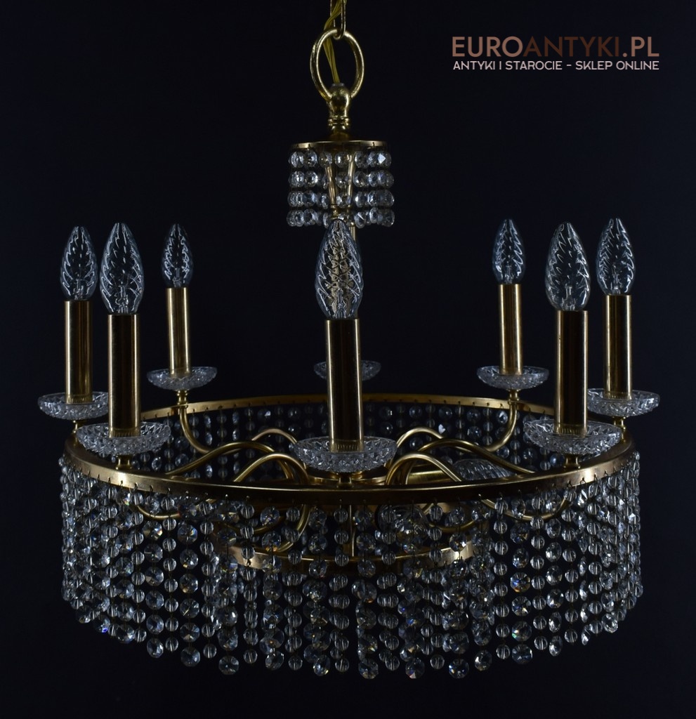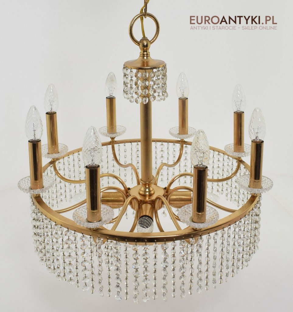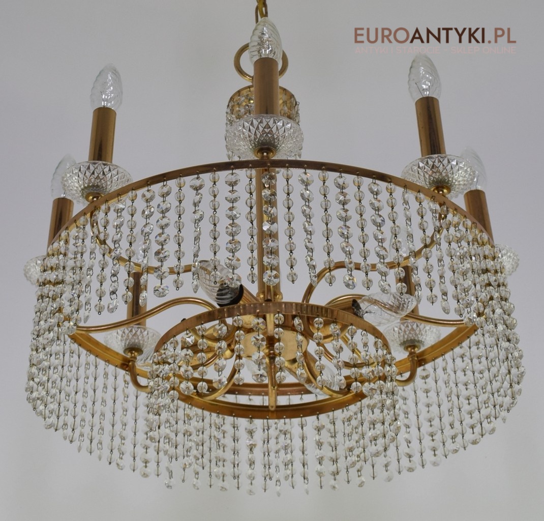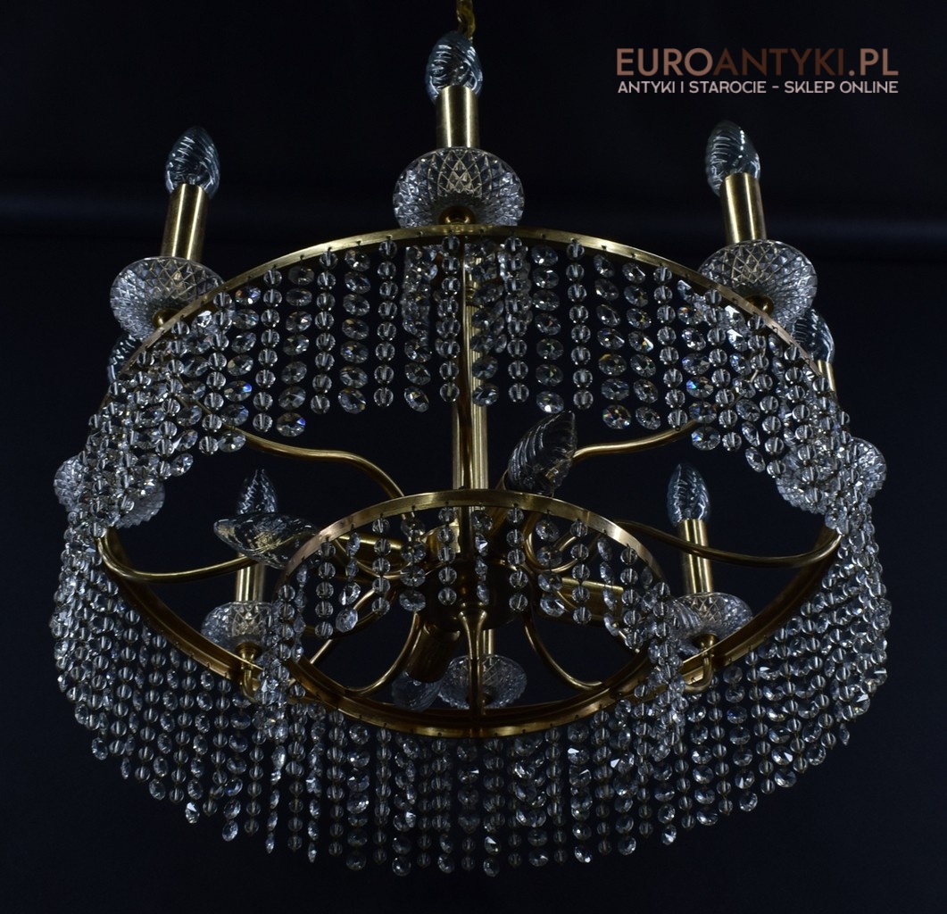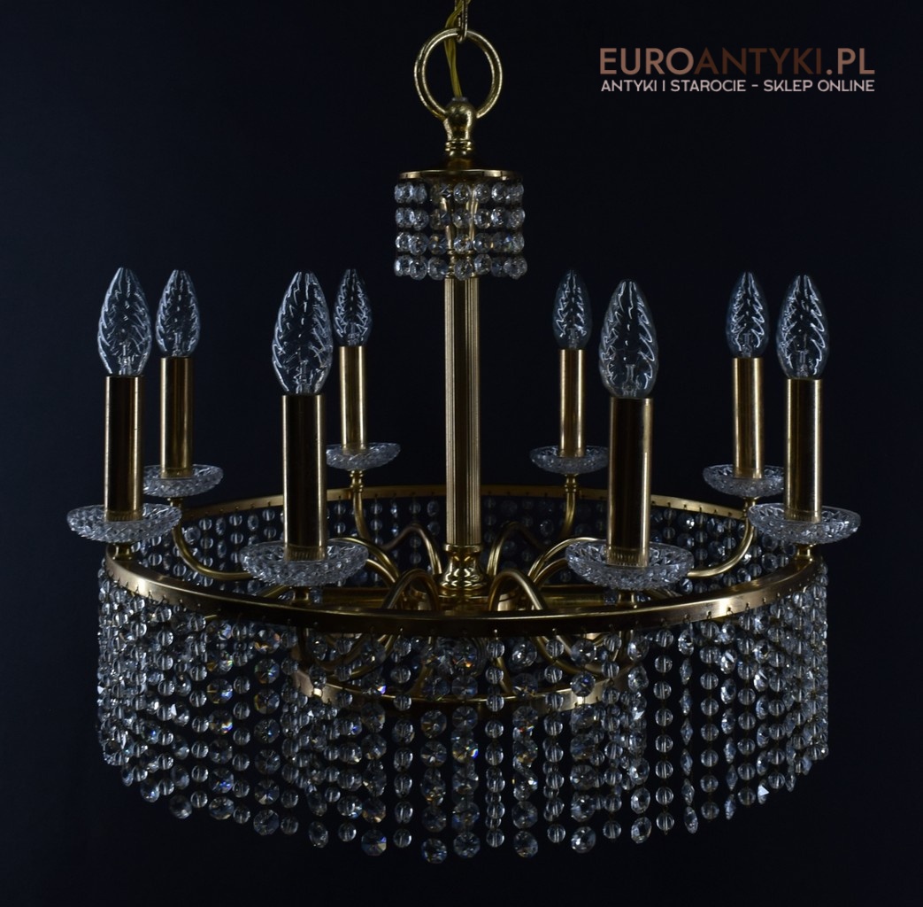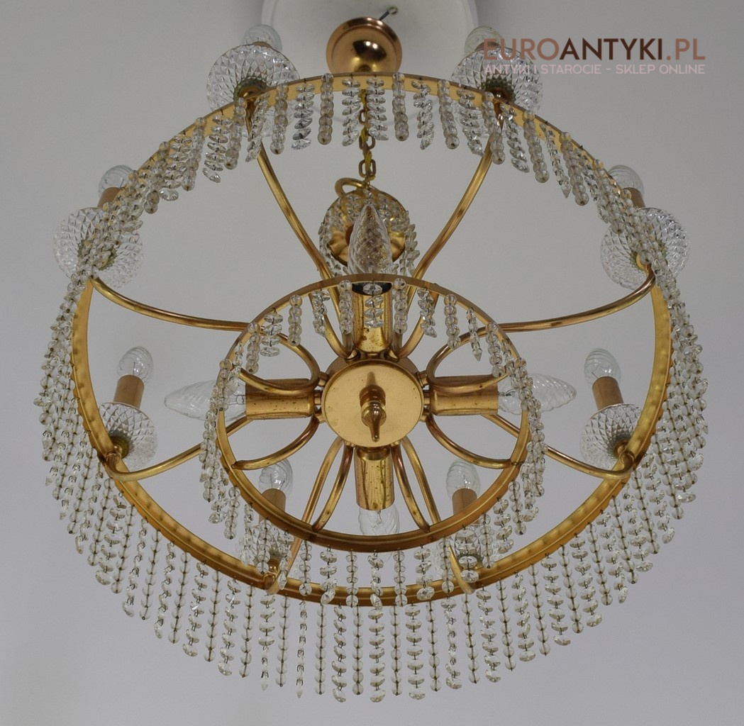 Sprowadzony z Austrii. Pochodzi z połowy ubiegłego wieku. Wykonany z masywnego mosiądzu + kryształowe zawieszki. Zawieszki kryształowe powodują rozszczepienie światła i widać piękne tęczowe kolory. Ciężko ten efekt uchwycić na zdjęciach, ale w realu wygląda to zjawiskowo. 100% kompletne, w bardzo dobrym stanie. Kryształowe talerzyki pod gilzami.