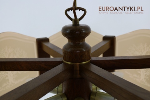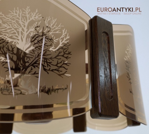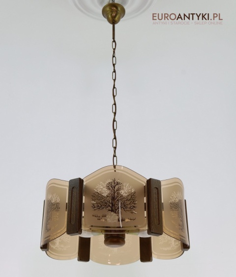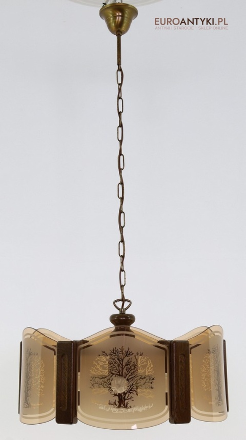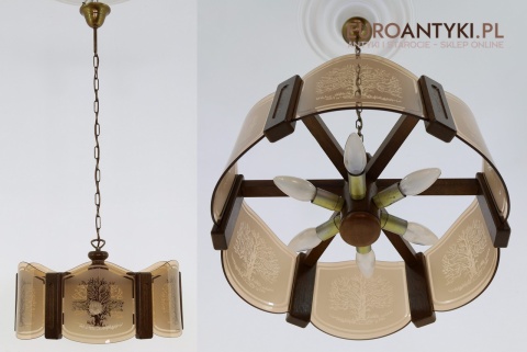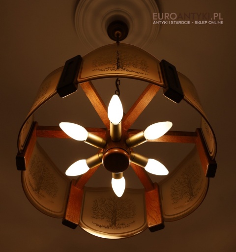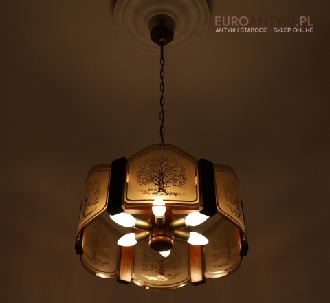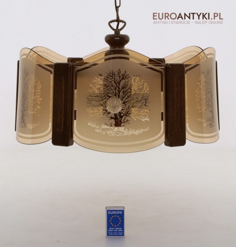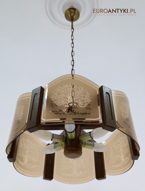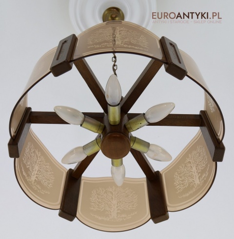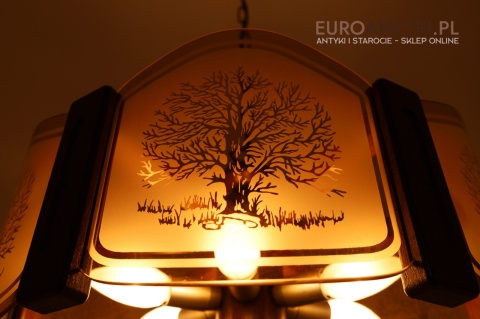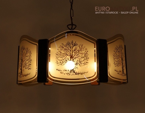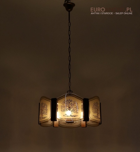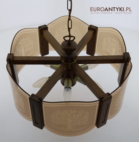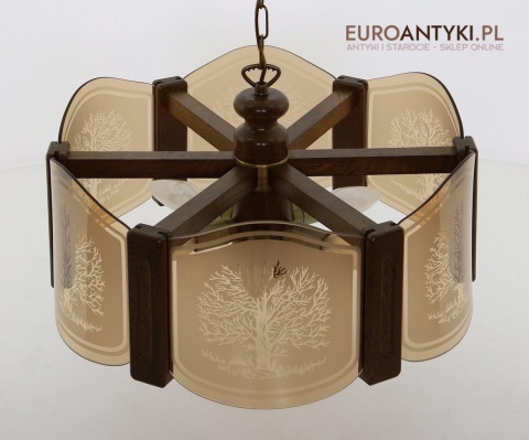 DUŻY! Rustykalny żyrandol z końca XX wieku – drewniana konstrukcja i szkło z motywem drzew