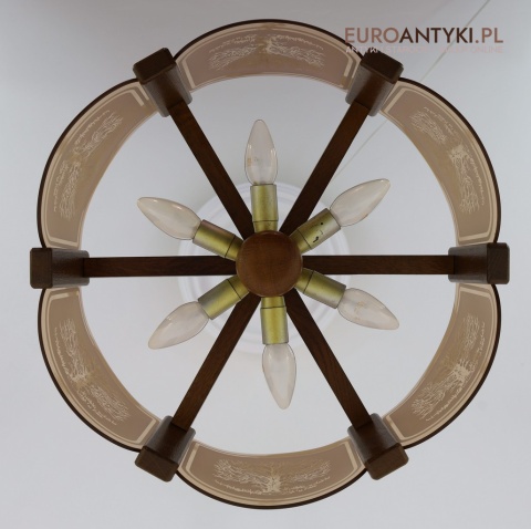 Prezentujemy duży żyrandol rustykalny w stylu retro vintage, sprowadzony z Francji. Żyrandol pochodzi z końca XX wieku i łączy elegancję naturalnego drewna z unikalnym pięknem szkła. Szklane szybki o półokrągłym kształcie zdobione są delikatnymi wzorami drzew, co dodaje całości wyrafinowanego, rustykalnego uroku. To idealny element oświetlenia do wnętrz inspirowanych naturą, które cenią styl rustykalny oraz ciepły, przytulny klimat.