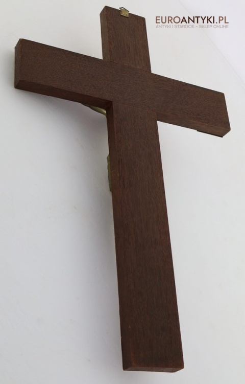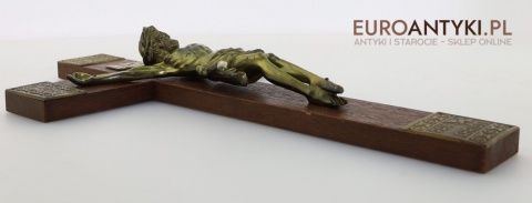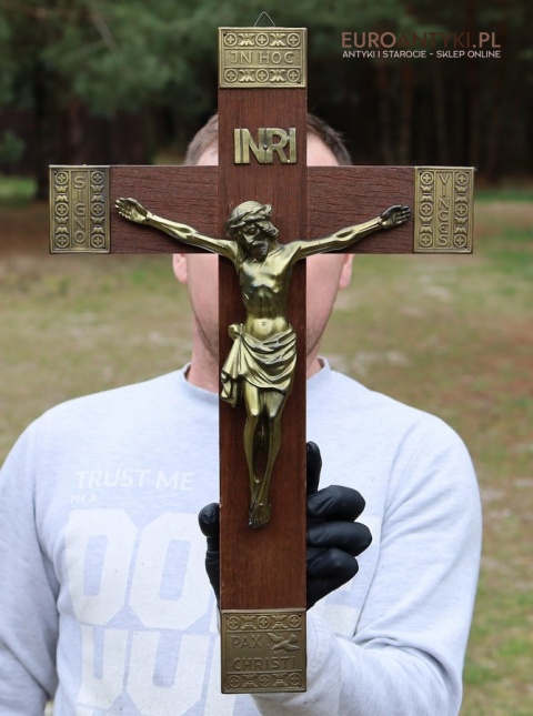 Przedstawiamy wyjątkowy, duży krzyż ścienny w stylu klasycystycznym, pochodzący z połowy XX wieku – sprowadzony z Francji. Wykonany z litego drewna, z bogatymi elementami z mosiądzu. Na krzyżu znajduje się mosiężna figura Jezusa Chrystusa oraz dekoracyjne płyty z łacińskimi inskrypcjami.