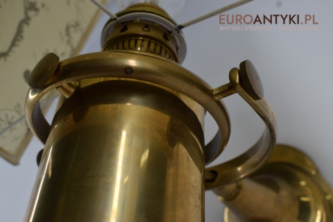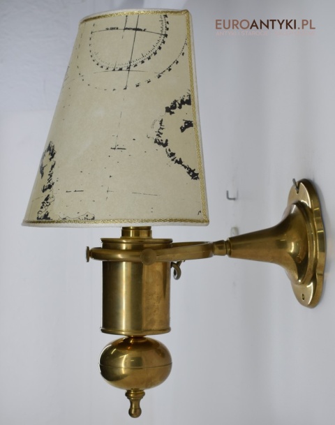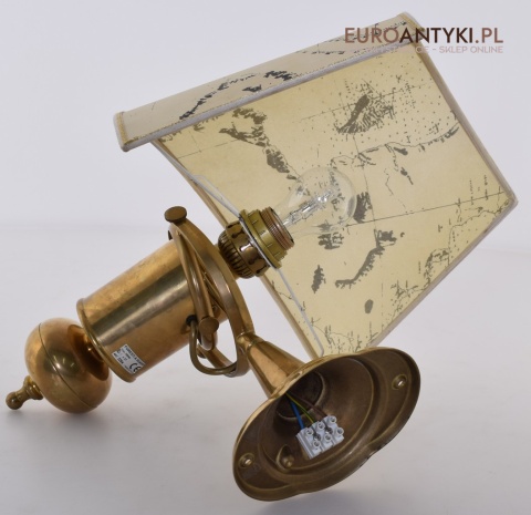 Kinkiet marynistyczny, ruchomy w pionie, został zaprojektowany w stylu dawnych lamp okrętowych, które dostosowywały się do ruchów statku na falach, dzięki czemu płomień zawsze pozostawał w pionie. Jest to produkt premium z końca XX wieku, wykonany we Włoszech. Lampa zachowała się w bardzo dobrym stanie, a jej solidna konstrukcja z mosiądzu gwarantuje długowieczność.