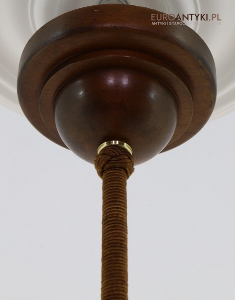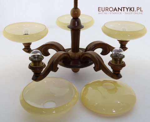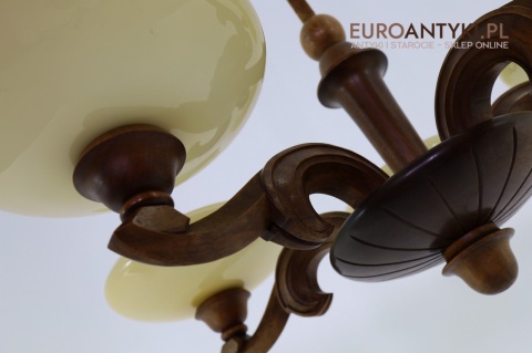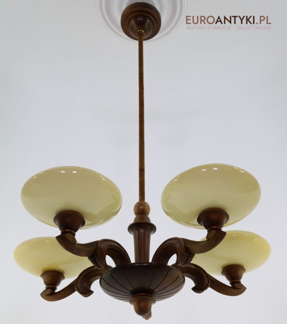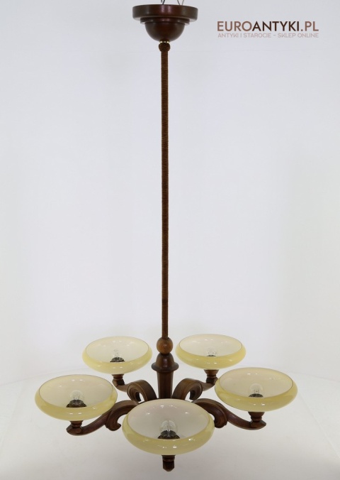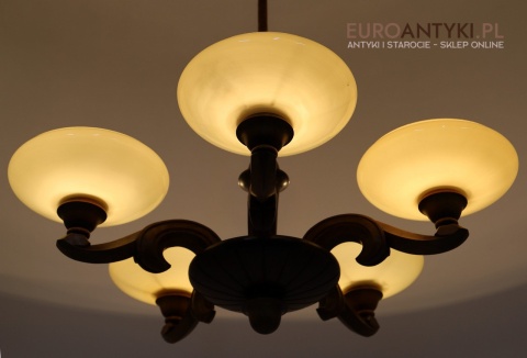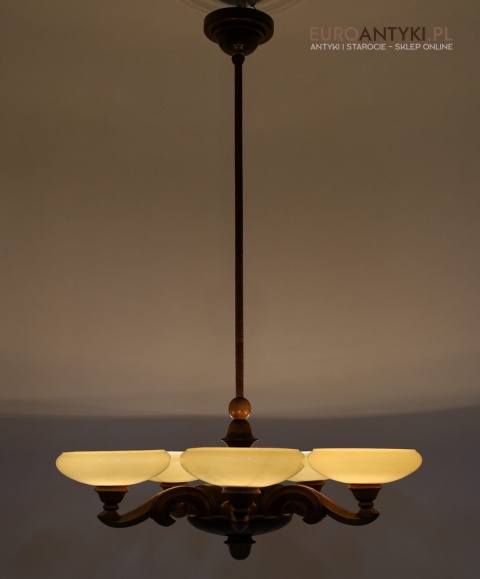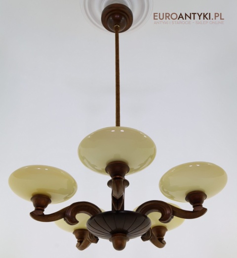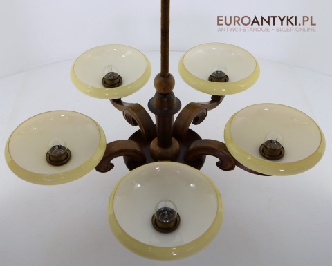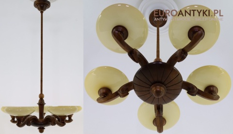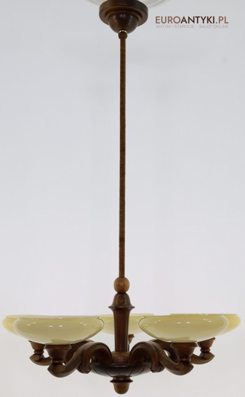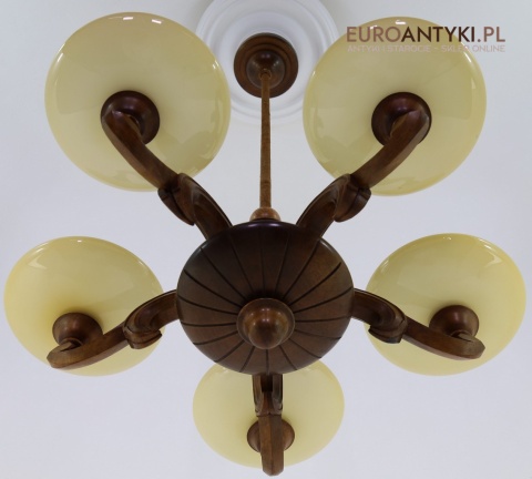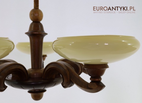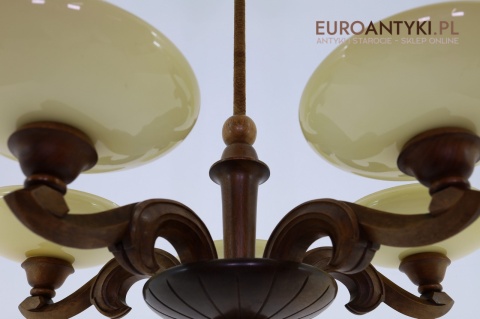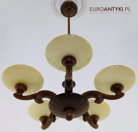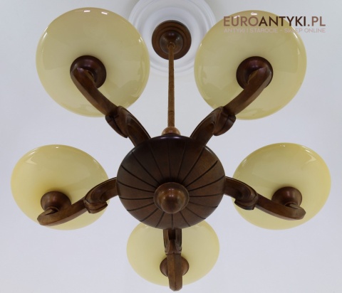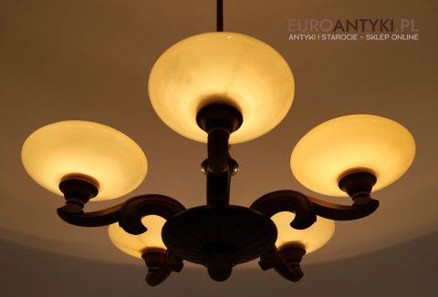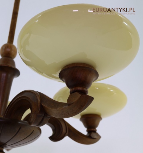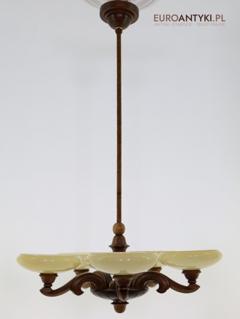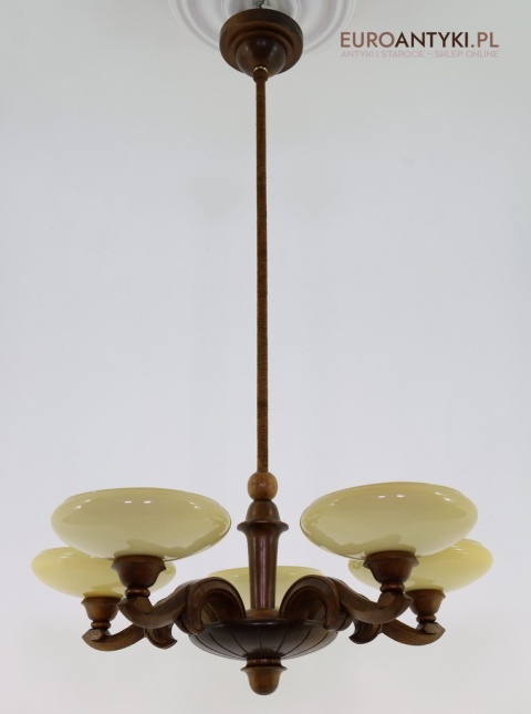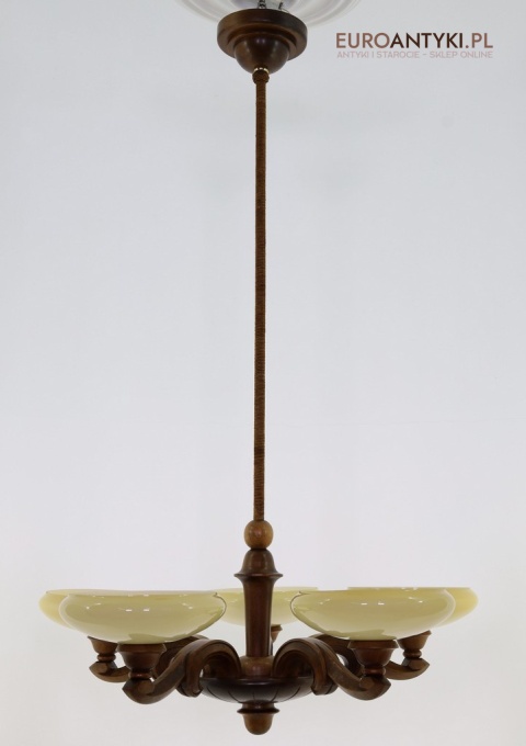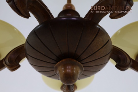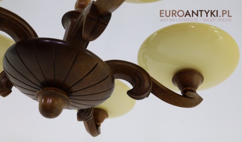 Sprowadzony z Francji, imponujący oryginalny żyrandol z epoki Art Deco, wykonany z litego drewna i wyposażony w oryginalne, szklane klosze w ciepłym, żółtawym odcieniu. Żyrandol pochodzi z początku XX wieku, z epoki, kiedy styl Art Deco dominował w architekturze i wzornictwie, charakteryzując się eleganckimi, geometrycznymi formami i luksusowym wykończeniem. Ten wyjątkowy egzemplarz to idealny wybór dla miłośników antyków oraz dla osób, które pragną dodać wnętrzu ponadczasowej elegancji.