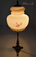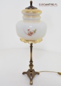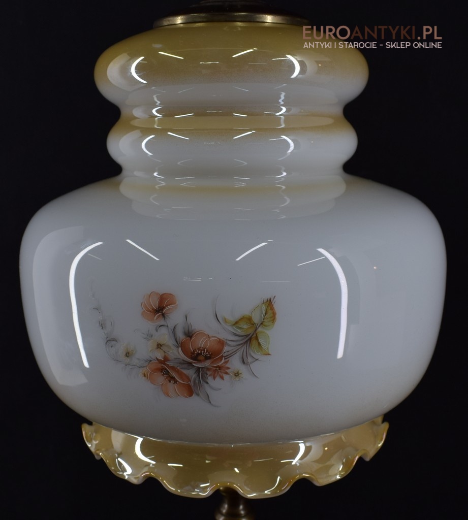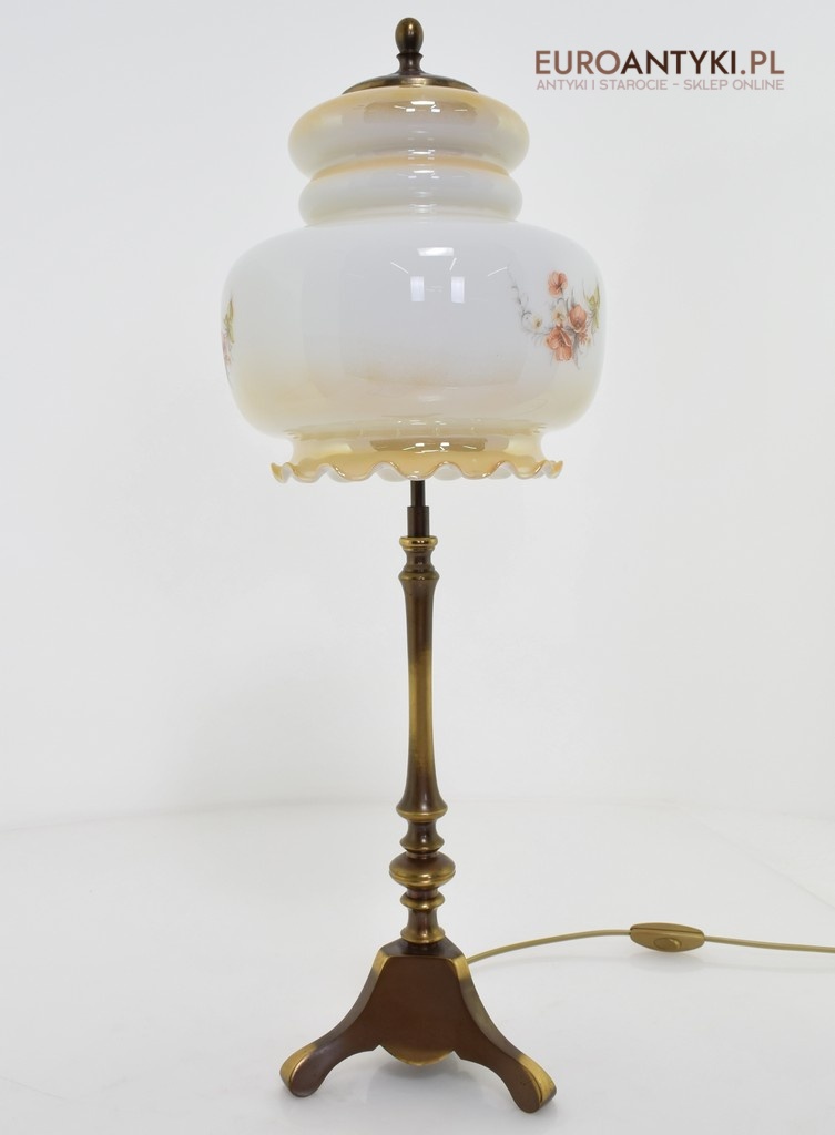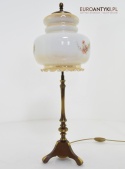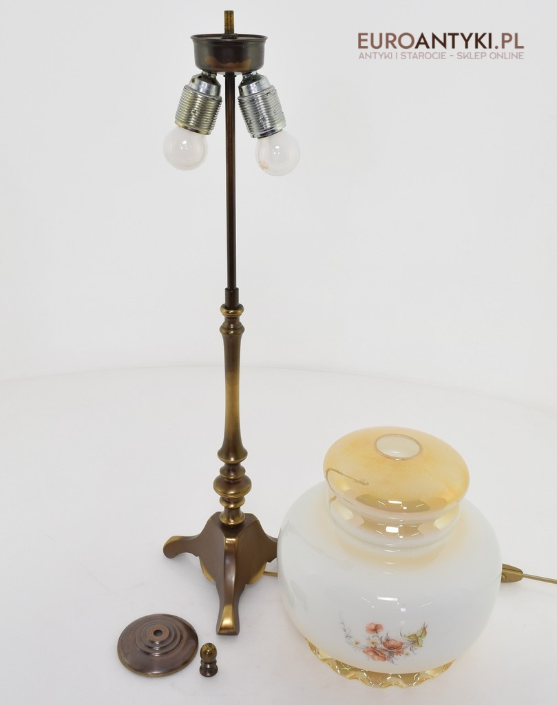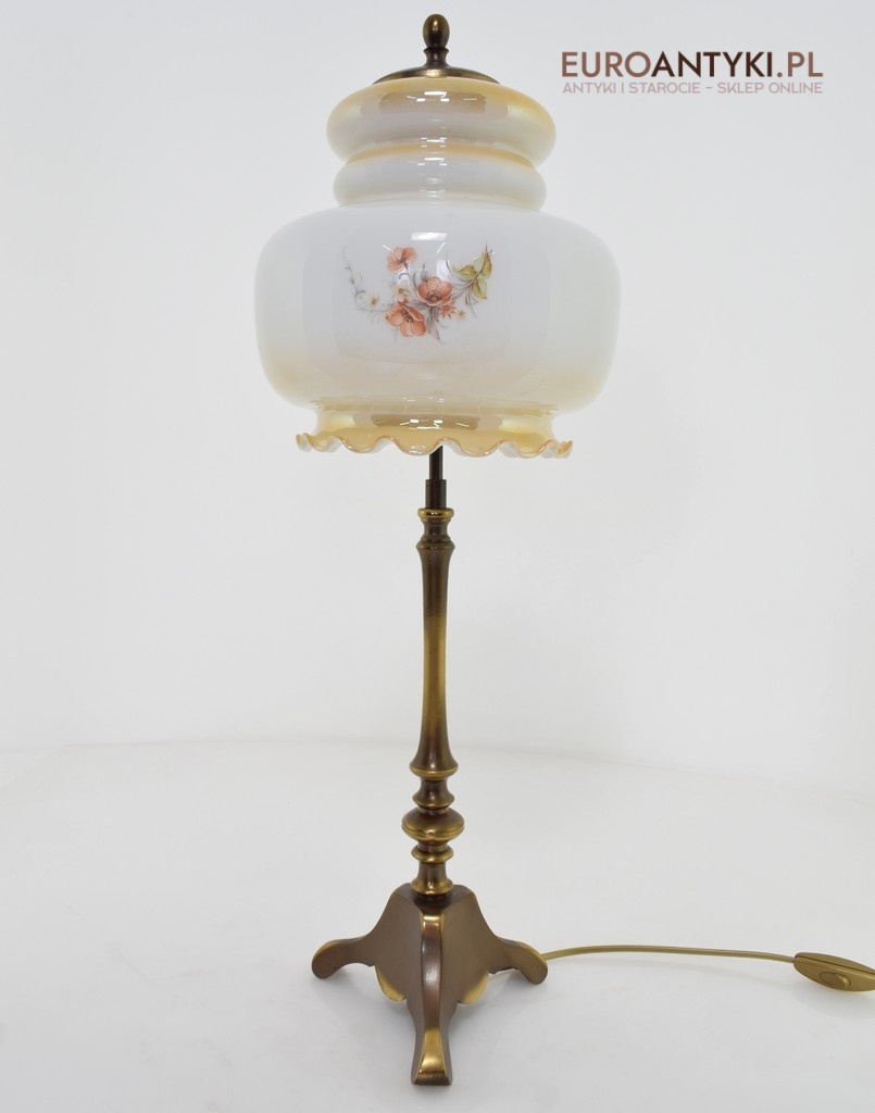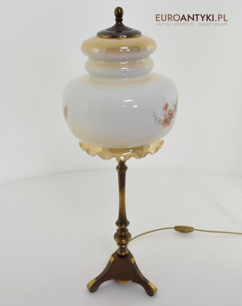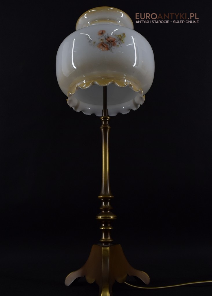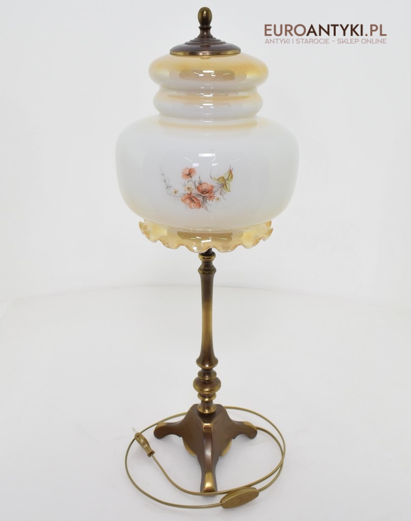 Sprowadzona z Austrii. Pochodzi z połowy ubiegłego wieku. Wykonana z solidnego i masywnego odlewu mosiądzu lub brązu. Klosz szklany w super stanie.