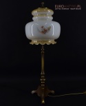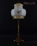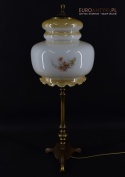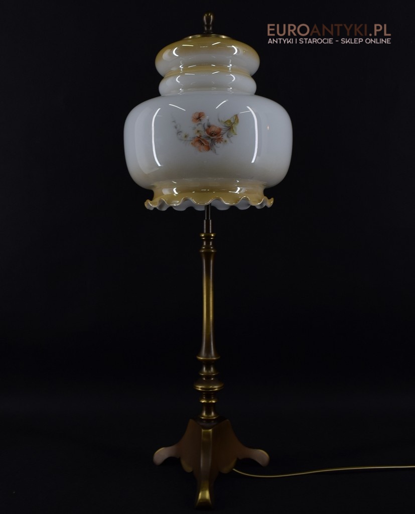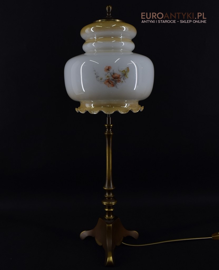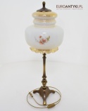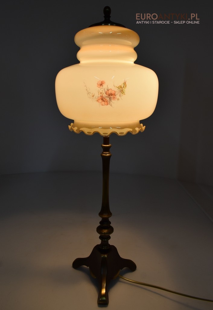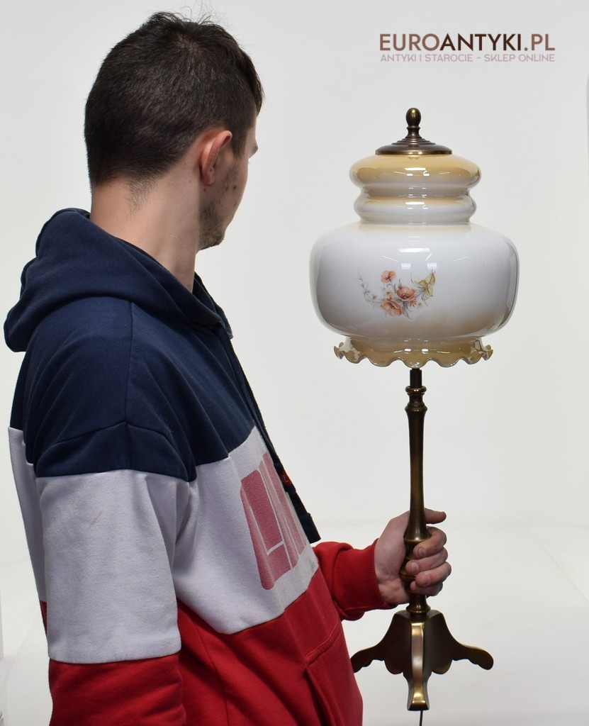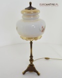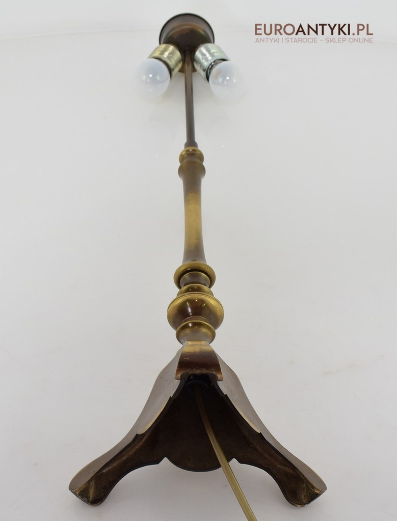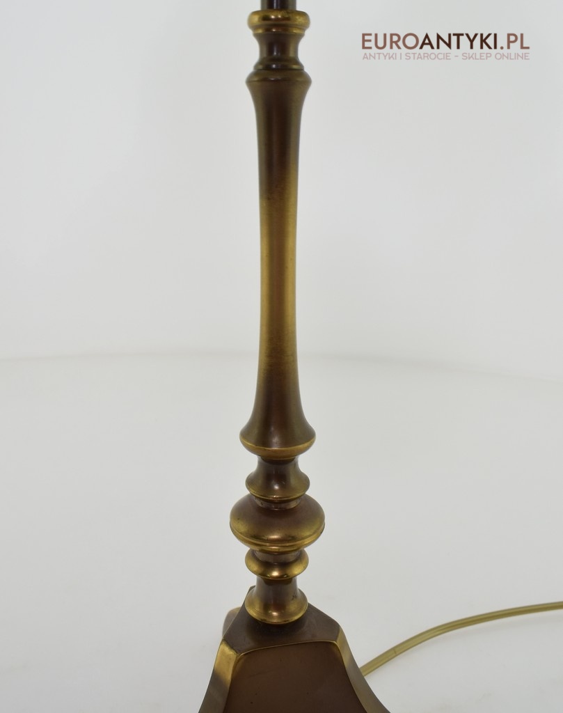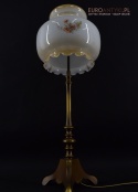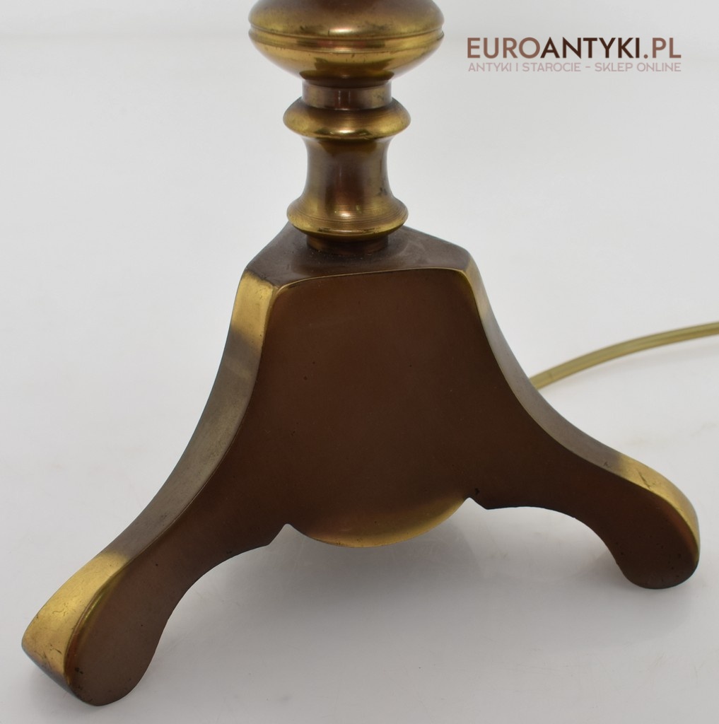 XL! Wysoka antyczna lampa stołowa z mosiądzu z kloszem.
