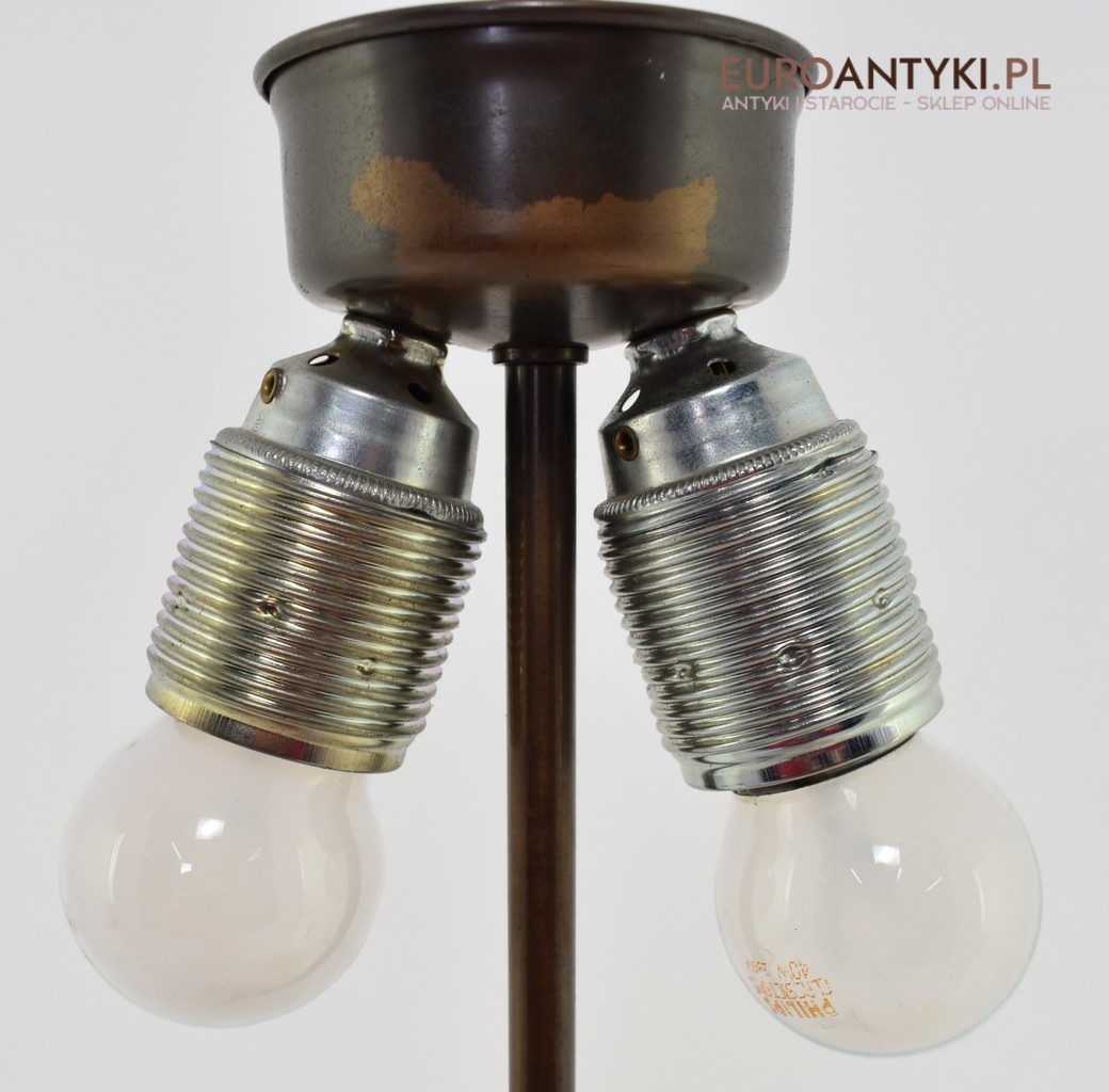 Całość bez uszkodzeń, kompletna. Elektryka sprawna. Standardowe gniazda elektryczne typu E27. Obecnie można kupić żarówki LED o różnym natężeniu i różnej barwie światła. Nawet malutka żarówka może być potężnej mocy i nie pobierać wielu wattów, przez co nie przegrzewa i nie uszkodzi kabli elektrycznych. Wszystkie lampy wysyłamy bez żarówek.