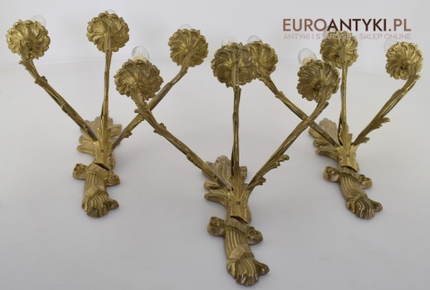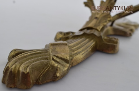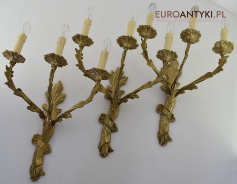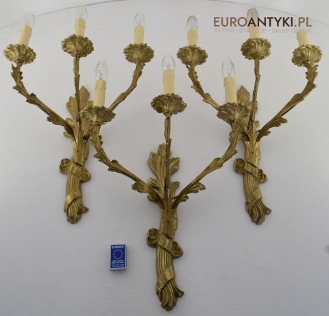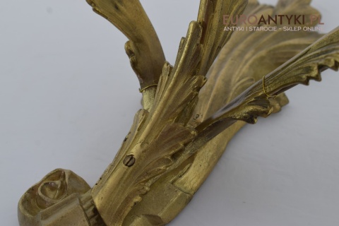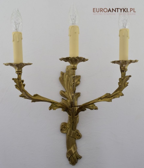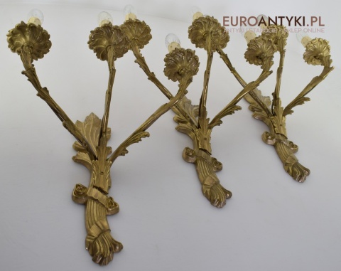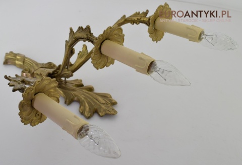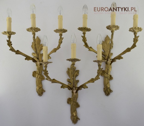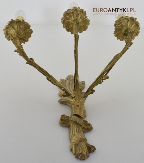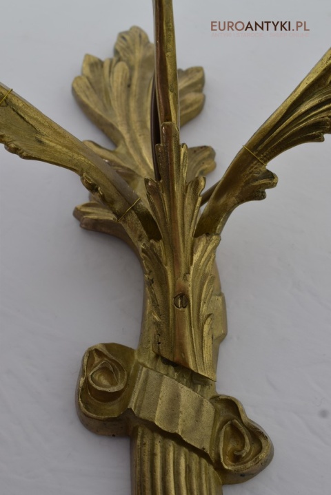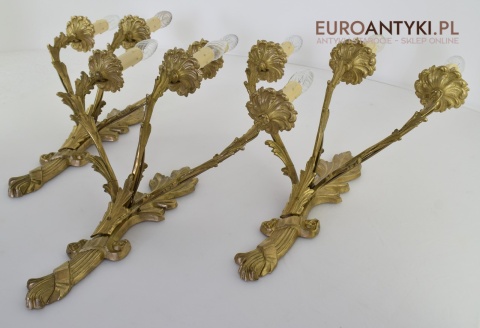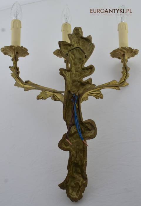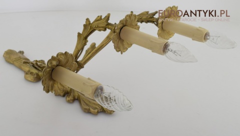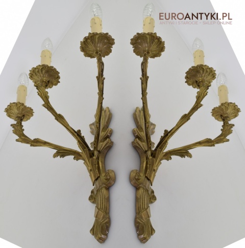 Kinkiety sprowadzone z Francji, pochodzą z drugiej połowy XX wieku. Wykonane z super-masywnych odlewów mosiężnych - waga 1 sztuki to 2,5 kg!!!