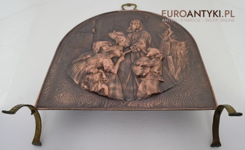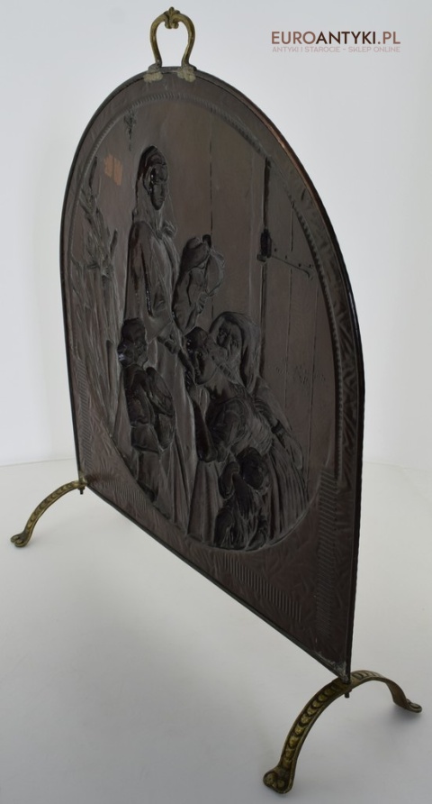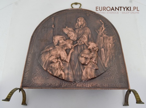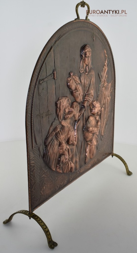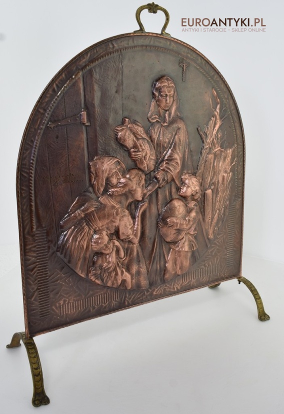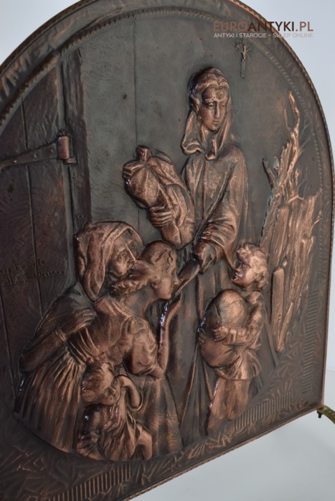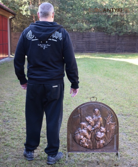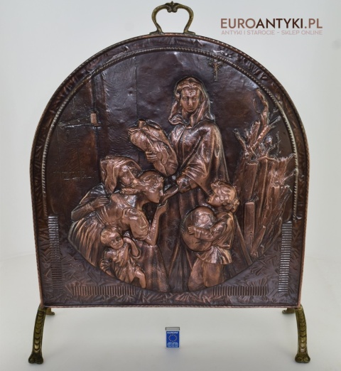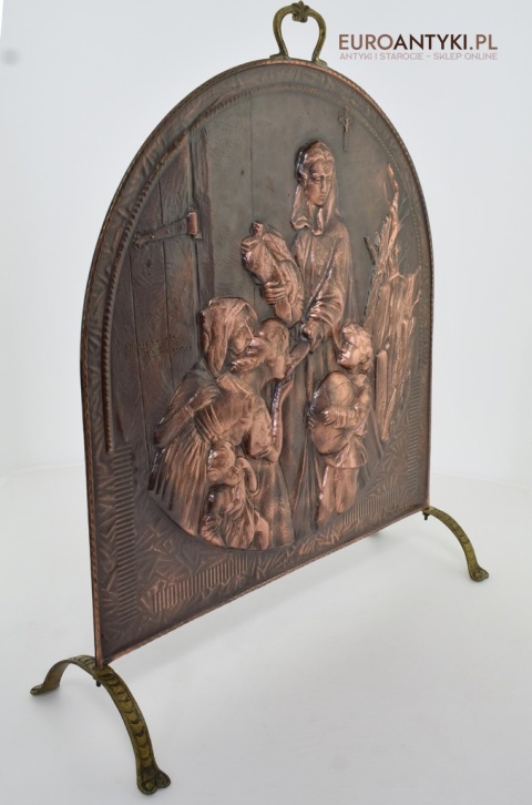 Prezentujemy Państwu niezwykle dekoracyjną i funkcjonalną ozdobę kominkową przedstawiającą wizerunek Matki Boskiej z Dzieciątkiem. Ta unikalna i ręcznie repusowana ( trybowana ) miedziana osłona jest nie tylko praktycznym elementem, zabezpieczającym wnętrze przed iskrami, ale także dziełem sztuki, które dodaje charakteru każdemu kominkowi, zwłaszcza gdy nie jest używany i okopcone ściany w kominku są zasłonięte piękną osłoną antyczna/vintageową. Rączka na górze i nogi są wykonane z masywnego mosiądzu. Ręcznie lutowane.