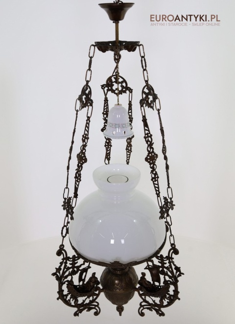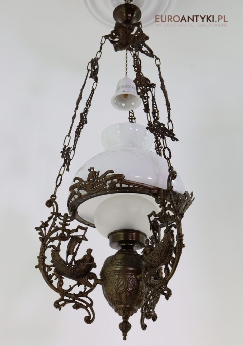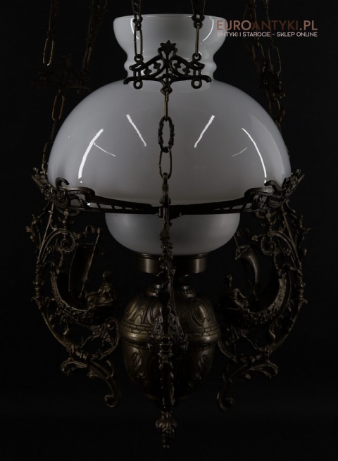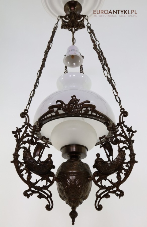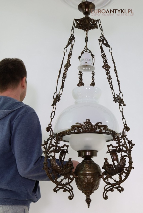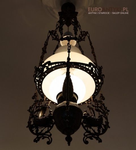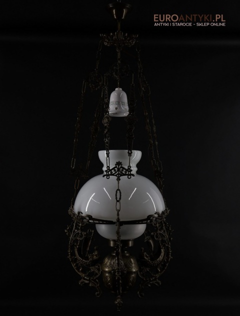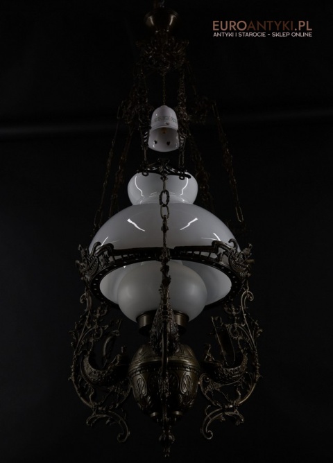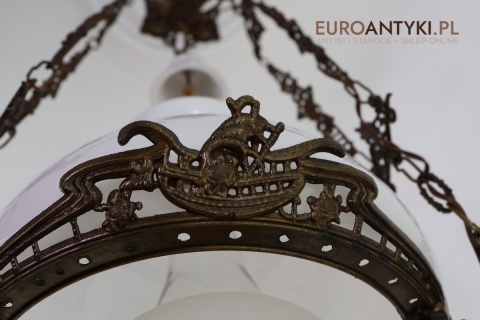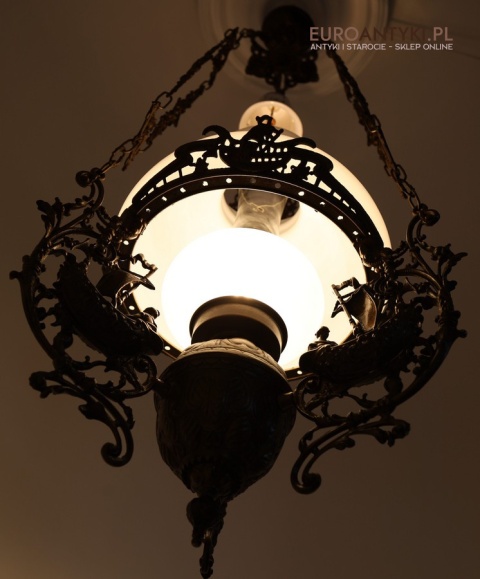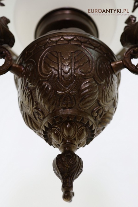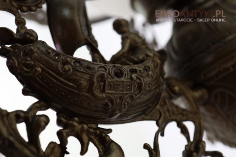 Przedstawiamy imponujący antyczny żyrandol pochodzący z drugiej połowy XX wieku (ok. 1960/70 r.), wykonany z masywnego brązu i szkła. Ten wyjątkowy element oświetlenia zachwyca bogatymi zdobieniami, które nawiązują do neobarokowego stylu, pełnego przepychu i misternie wykonanych detali. W górnej części żyrandola znajduje się porcelanowy dzowneczek. Sprowadzony z Francji, stanowi doskonały przykład kunsztu rzemieślniczego tamtego okresu.