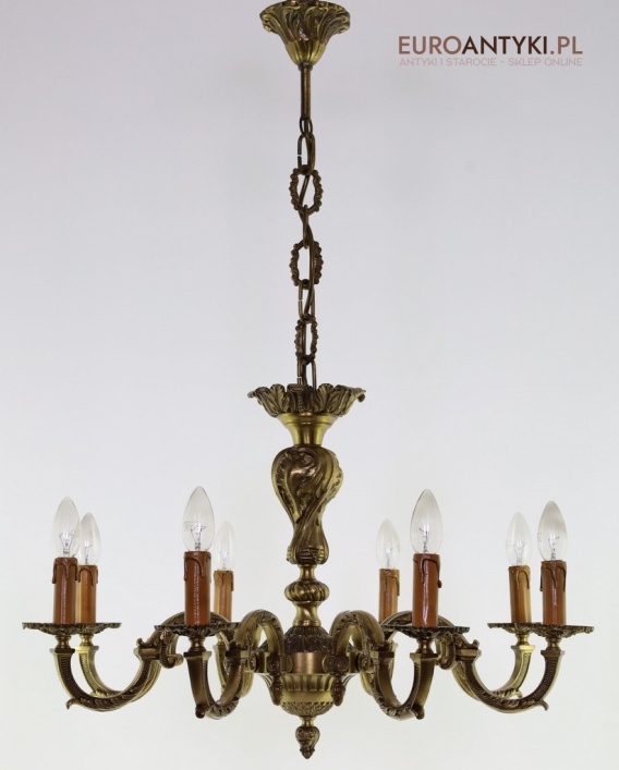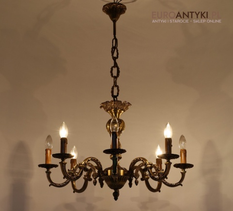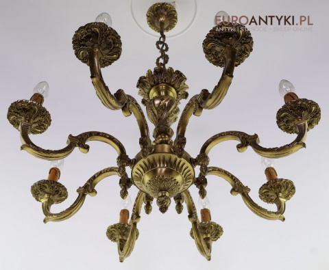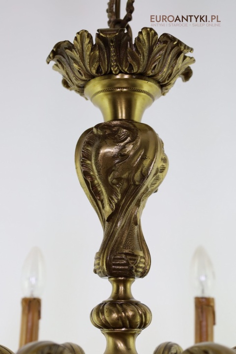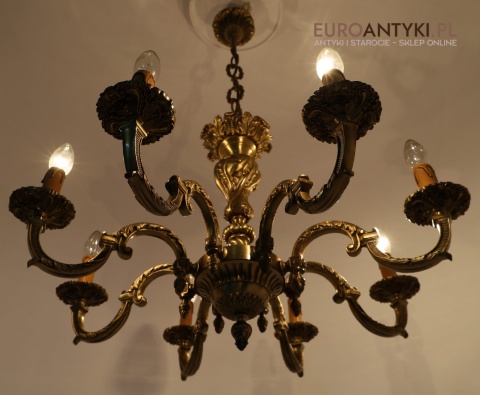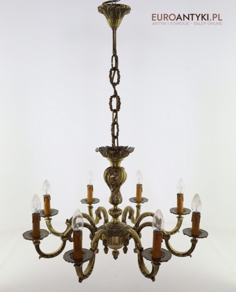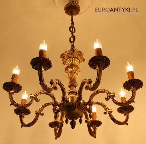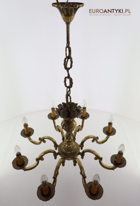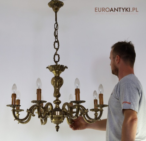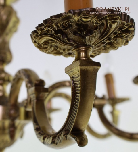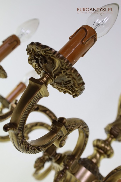 Przedstawiamy wyjątkowy pałacowy żyrandol sprowadzony z Francji, wykonany z masywnego mosiądzu, ważący aż 12,7 kg! Pochodzi z połowy XX wieku. Ten majestatyczny chandelier reprezentuje styl barokowy, cechujący się bogactwem zdobień, elegancją i wyrazistym kunsztem wykonania. Barok, będący symbolem przepychu i królewskiego splendoru, idealnie oddaje charakter tego żyrandola.