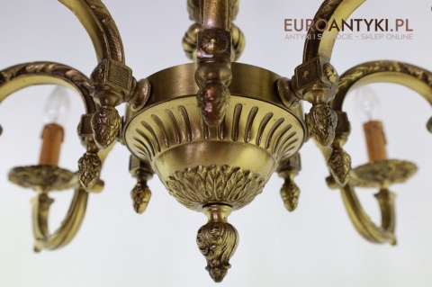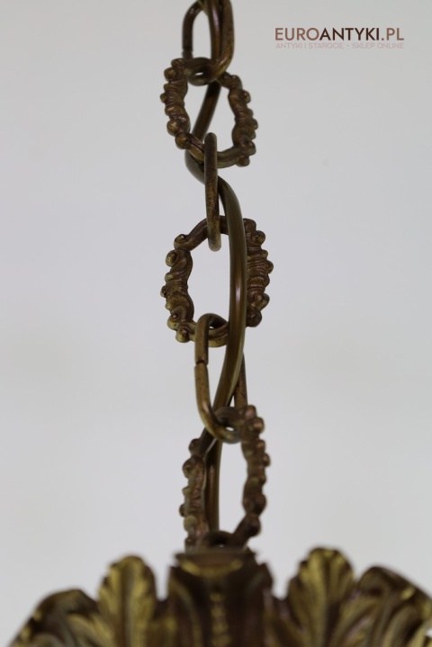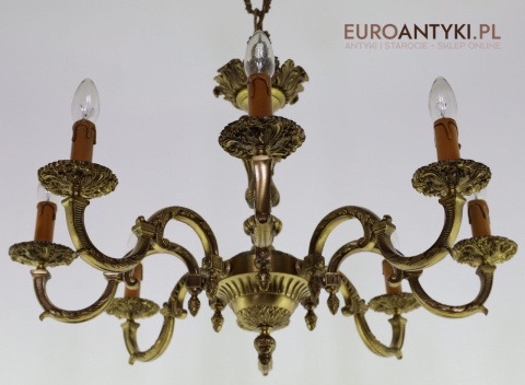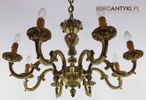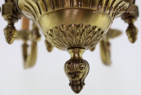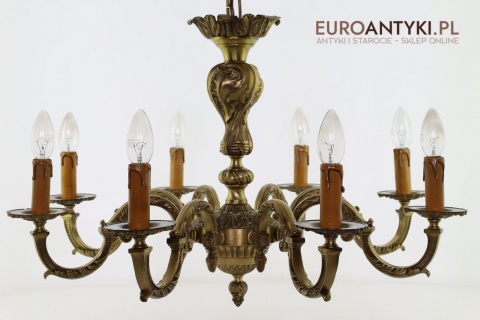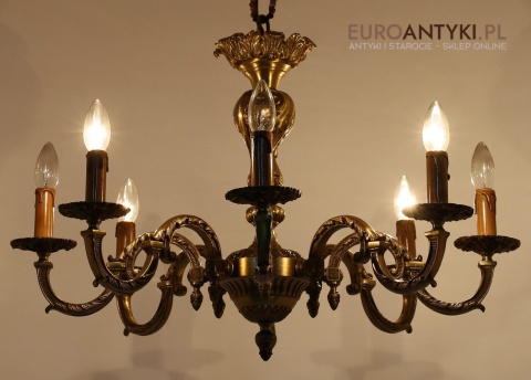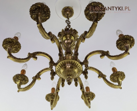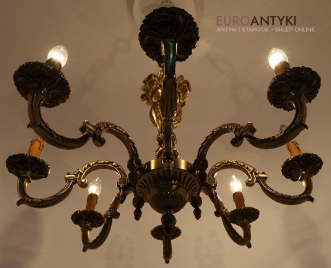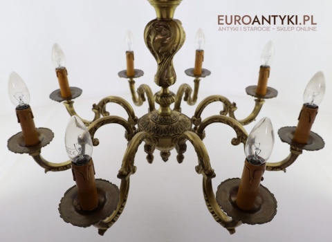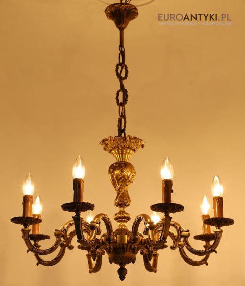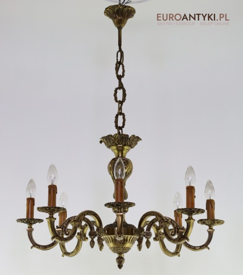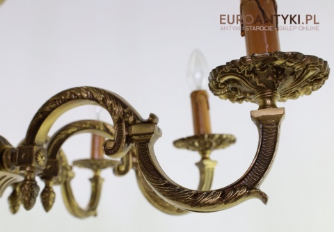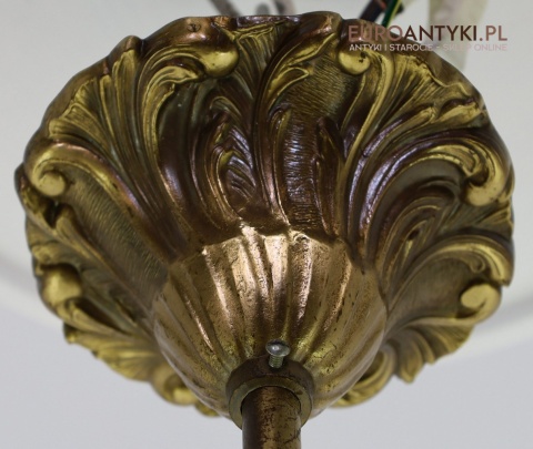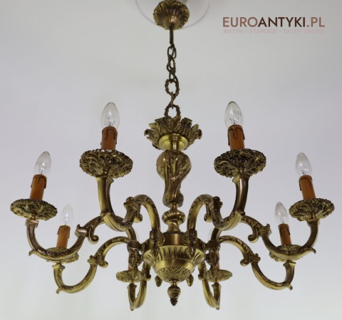 Przedstawiamy wyjątkowy pałacowy żyrandol sprowadzony z Francji, wykonany z masywnego mosiądzu, ważący aż 12,7 kg! Pochodzi z połowy XX wieku. Ten majestatyczny chandelier reprezentuje styl barokowy, cechujący się bogactwem zdobień, elegancją i wyrazistym kunsztem wykonania. Barok, będący symbolem przepychu i królewskiego splendoru, idealnie oddaje charakter tego żyrandola.
