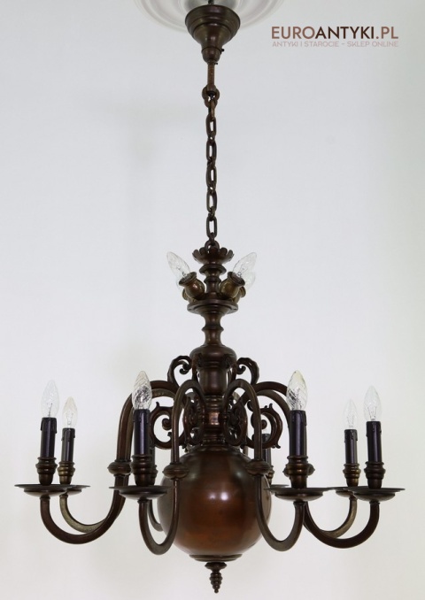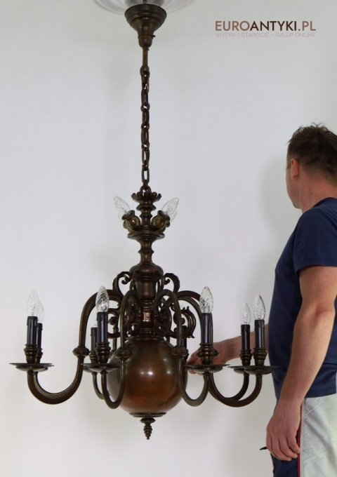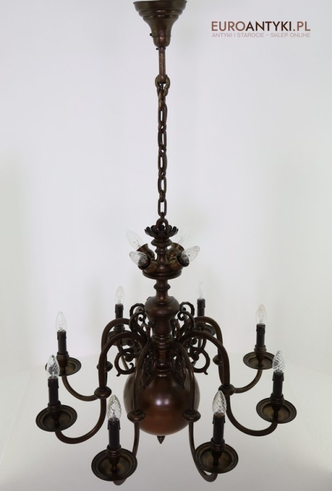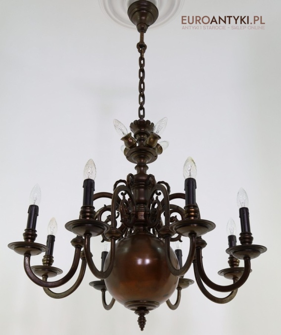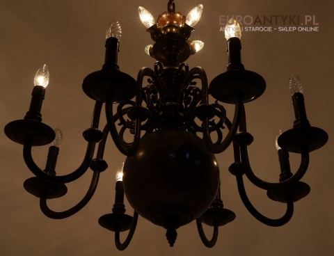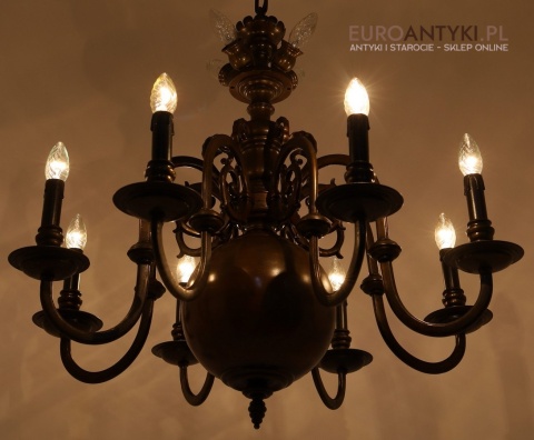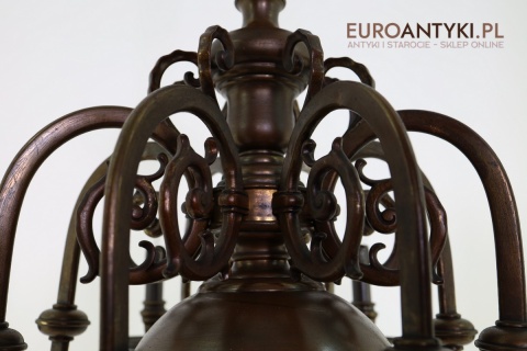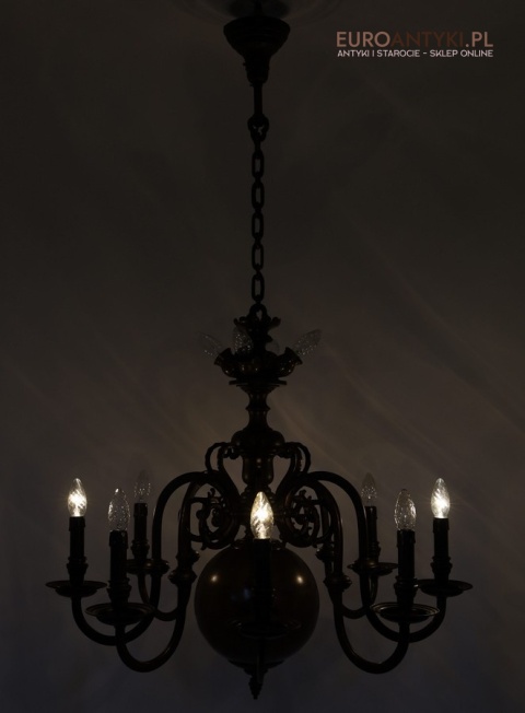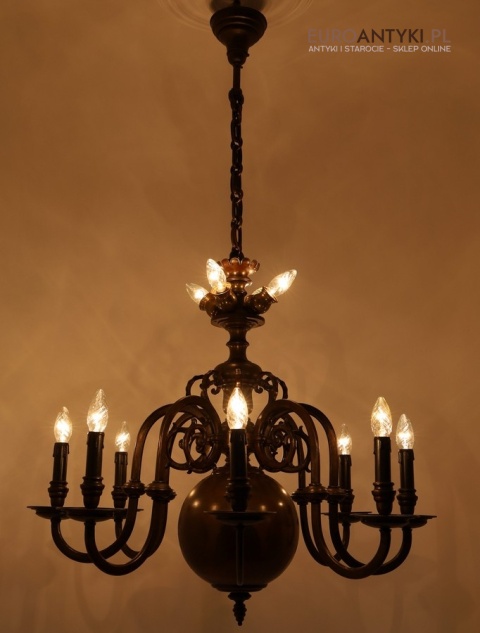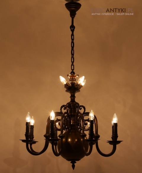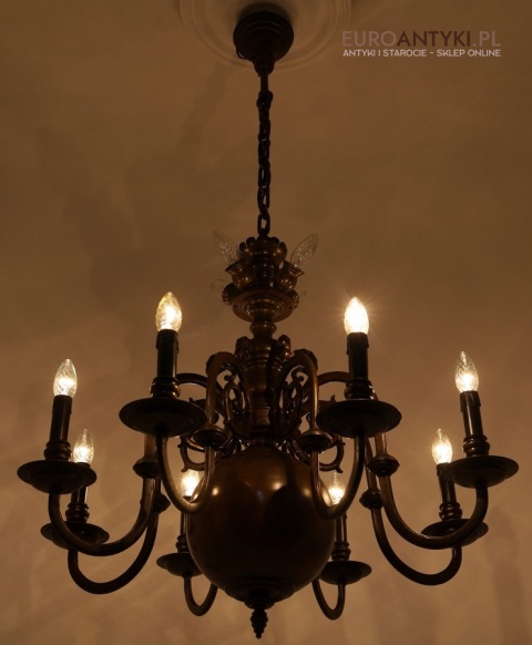 Przedstawiamy stary, antyczny, vintage żyrandol sprowadzony prosto z Francji z pierwszej połowy XX wieku. Solidny, masywny brąz, z łańcuchem i ośmioma ramionami oraz możliwością wielostrefowego zapalenia – 4 żarówki u góry i 8 wokół korony lub co druga wokoło korony. Elektryka w 100% wykonana na nowo!