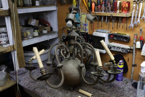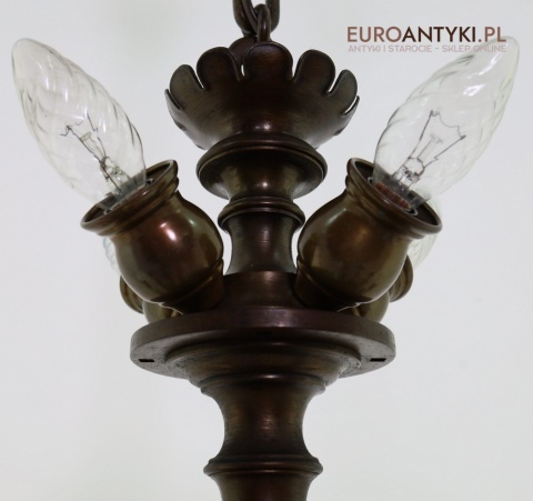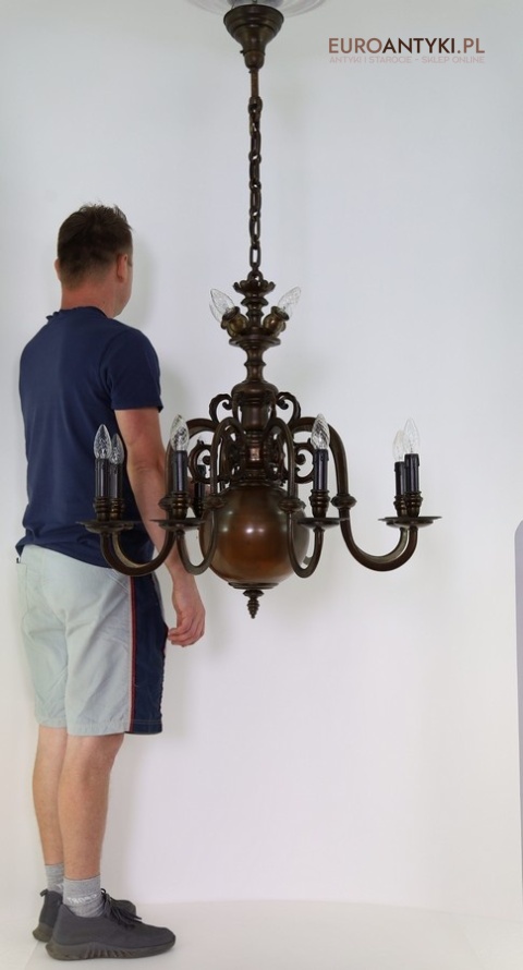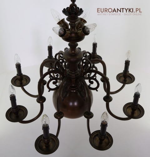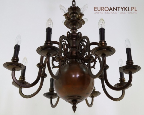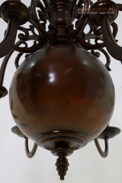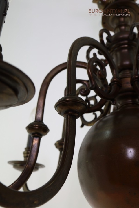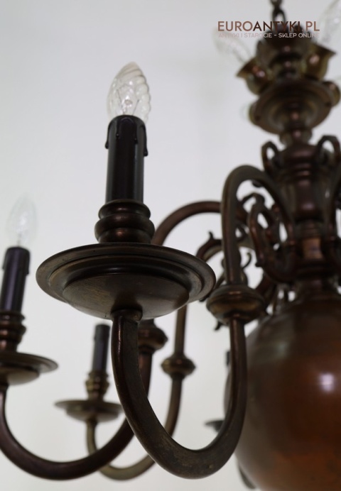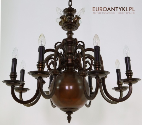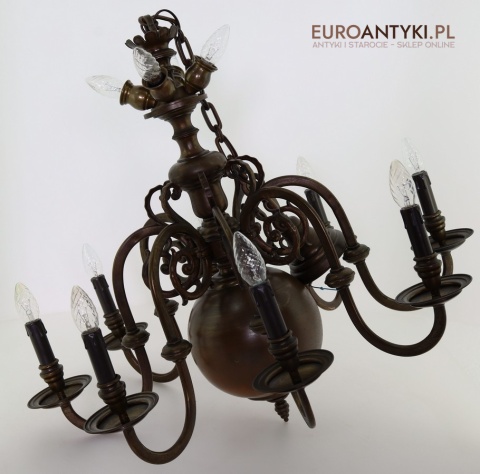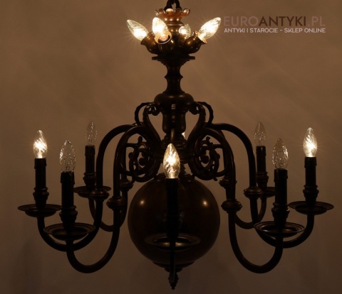 Przedstawiamy stary, antyczny, vintage żyrandol sprowadzony prosto z Francji z pierwszej połowy XX wieku. Solidny, masywny brąz, z łańcuchem i ośmioma ramionami oraz możliwością wielostrefowego zapalenia – 4 żarówki u góry i 8 wokół korony lub co druga wokoło korony. Elektryka w 100% wykonana na nowo!