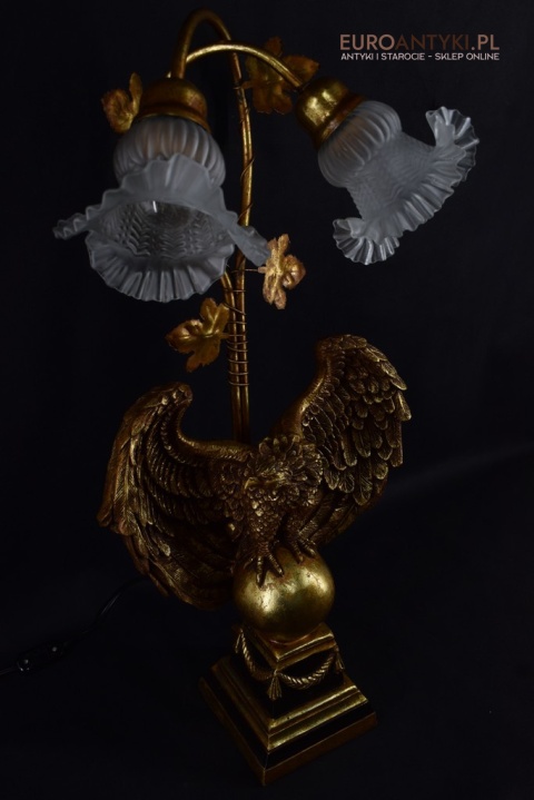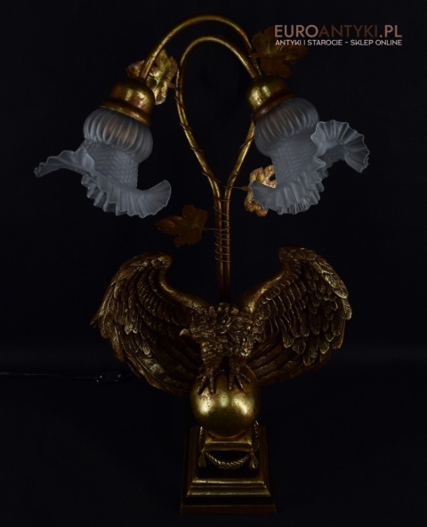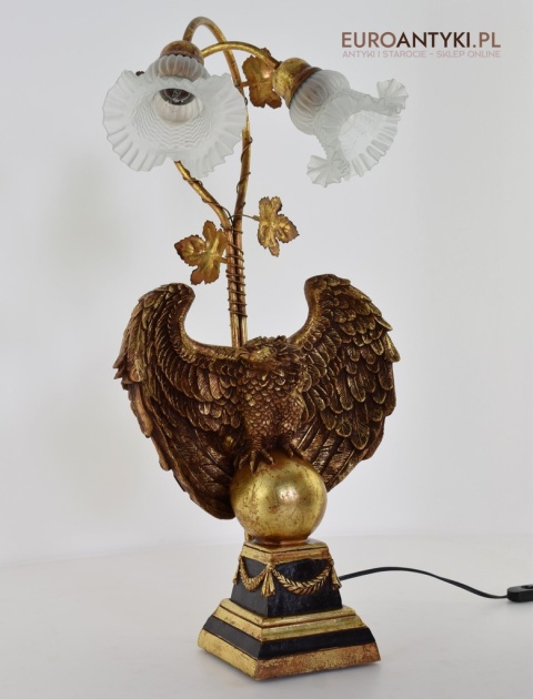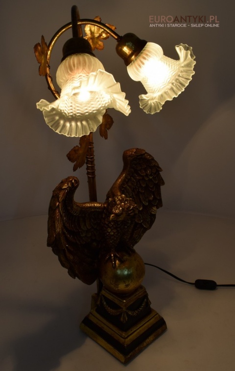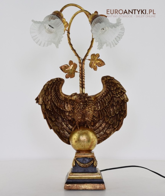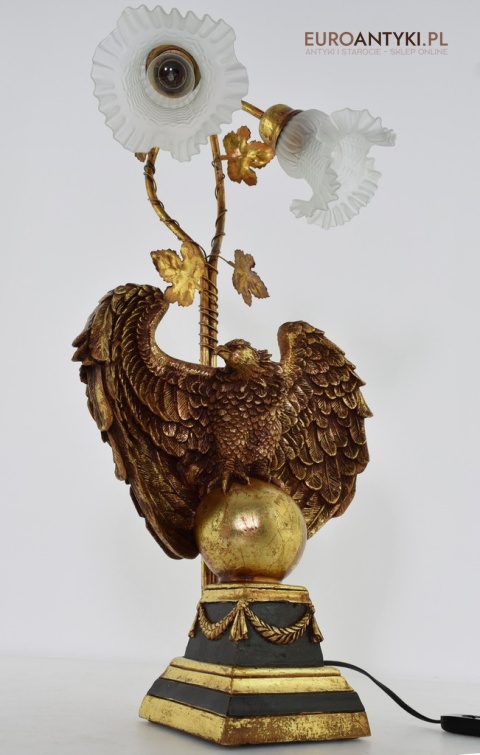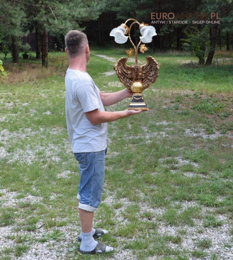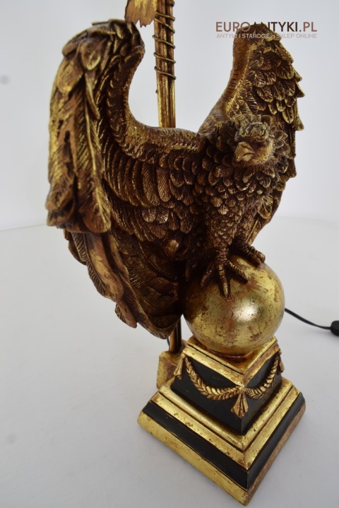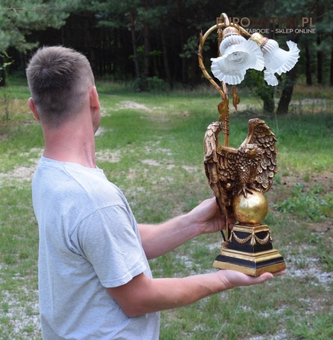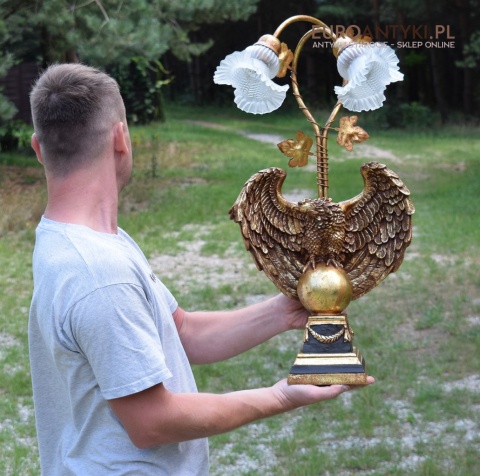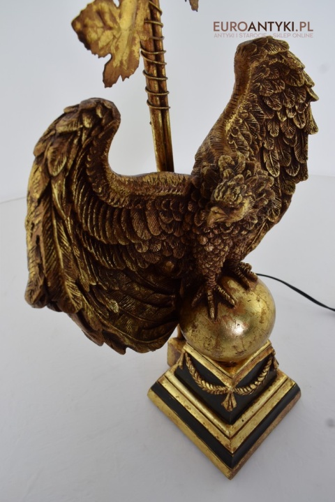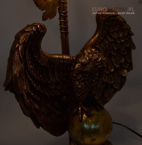 Prezentujemy wyjątkową sprowadzoną z Francji, monumentalną lampę z orłem na cokole, inspirowaną potęgą i majestatem Cesarstwa Rzymskiego. Ta duża i masywna lampa waży aż 4,5 kg, co podkreśla jej solidność i trwałość. Wykonana z wysokiej jakości tworzywa sztucznego i metalu + szklane klosze florystyczne w idealnym stanie. Od nowego została celowo postarzona na stare złoto, zarysowania i inne znaki starości, aby oddać autentyczny, antyczny charakter.