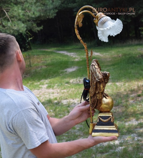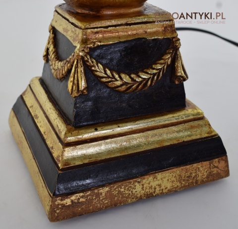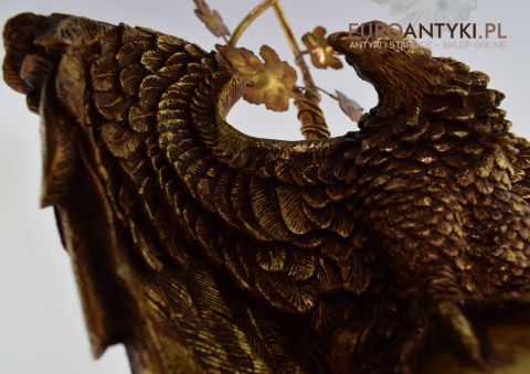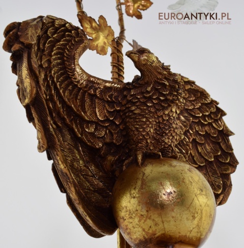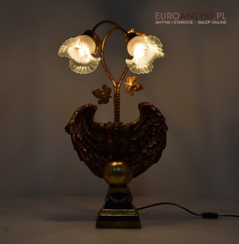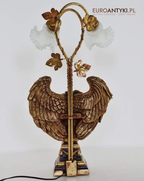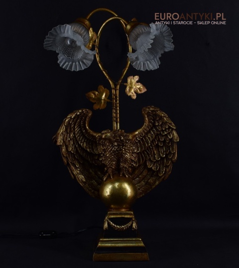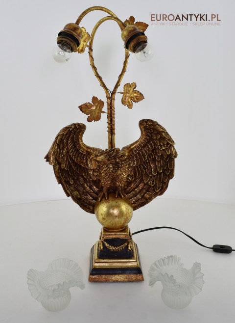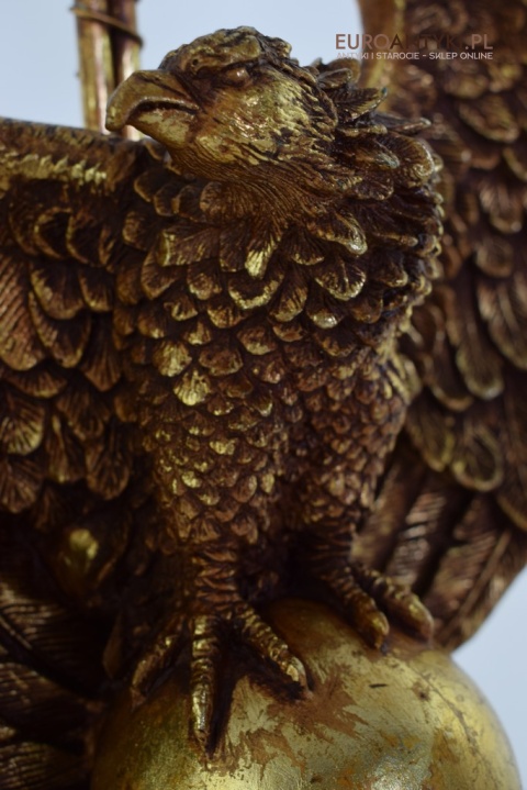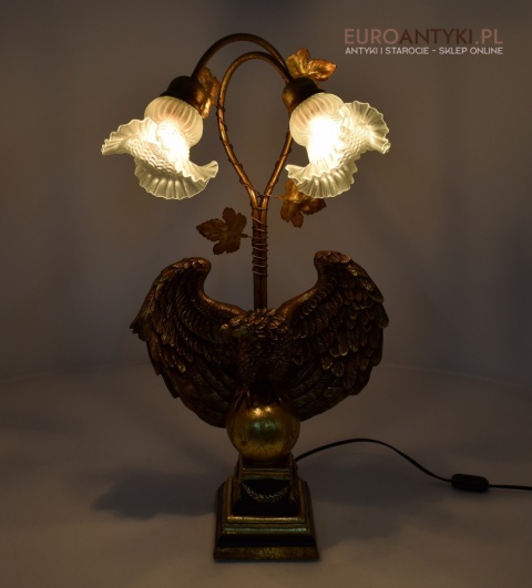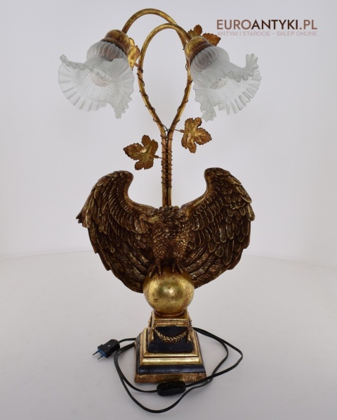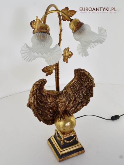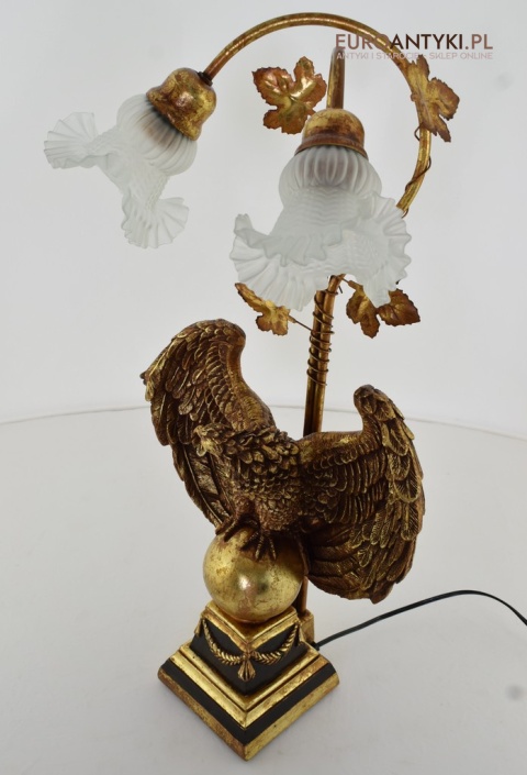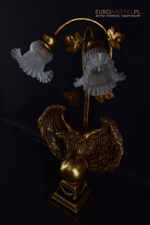 Prezentujemy wyjątkową sprowadzoną z Francji, monumentalną lampę z orłem na cokole, inspirowaną potęgą i majestatem Cesarstwa Rzymskiego. Ta duża i masywna lampa waży aż 4,5 kg, co podkreśla jej solidność i trwałość. Wykonana z wysokiej jakości tworzywa sztucznego i metalu + szklane klosze florystyczne w idealnym stanie. Od nowego została celowo postarzona na stare złoto, zarysowania i inne znaki starości, aby oddać autentyczny, antyczny charakter.
