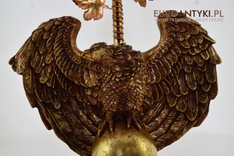 Lampa wyróżnia się imponującą rzeźbą orła, który jest symbolem władzy, siły i potęgi, nawiązującym bezpośrednio do tradycji starożytnego Rzymu. Orzeł był emblematem legionów rzymskich i symbolizował cesarza oraz jego boski mandat do rządzenia. W naszej lampie orzeł został przedstawiony w sposób majestatyczny, z rozpostartymi skrzydłami, co podkreśla jego dominację i potęgę.