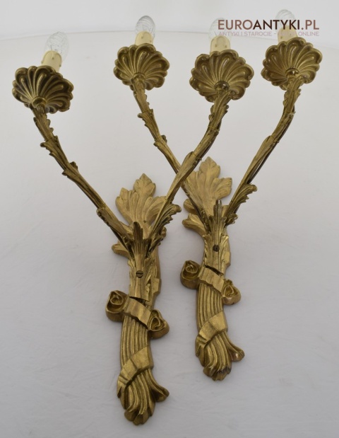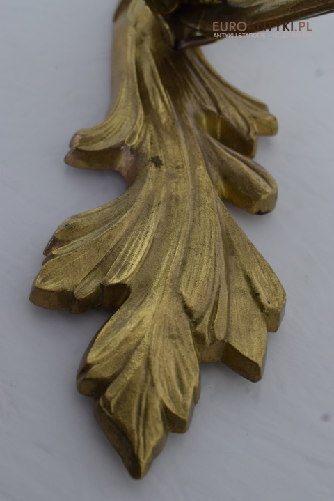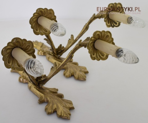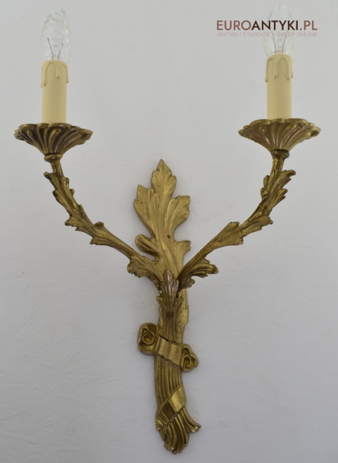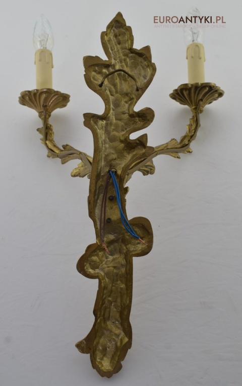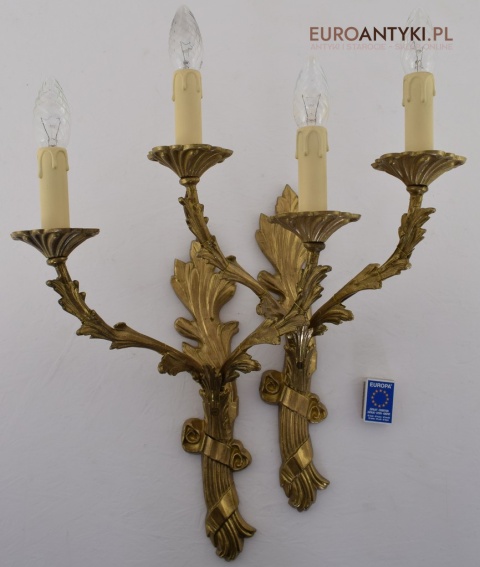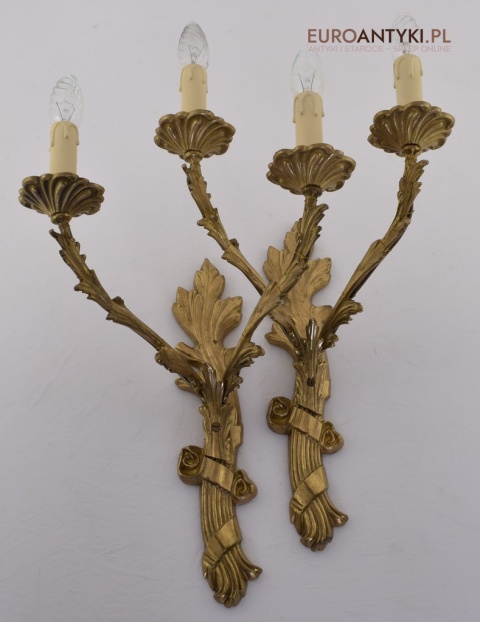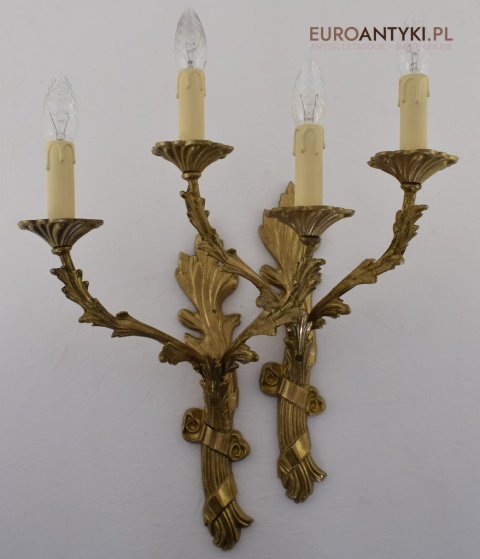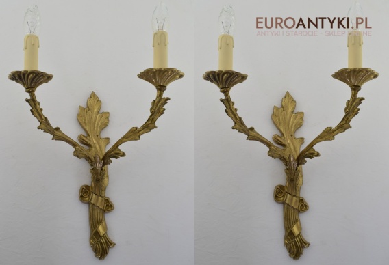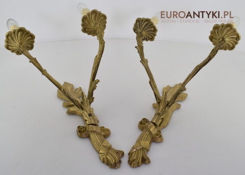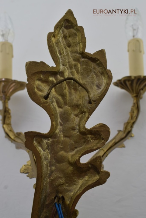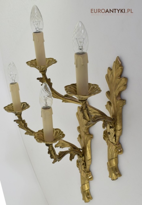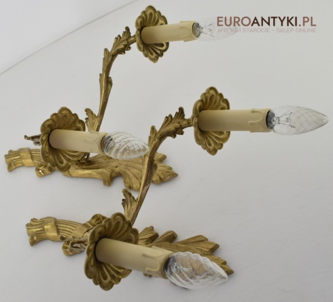 Kinkiety sprowadzone z Francji, pochodzą z drugiej połowy XX wieku. Wykonane z super-masywnych odlewów mosiężnych - waga 1 sztuki to 2 kg!!!