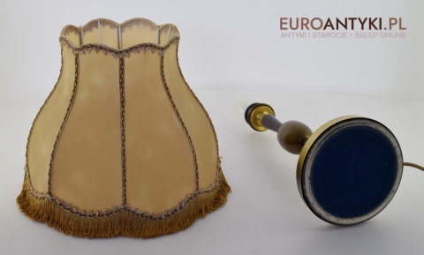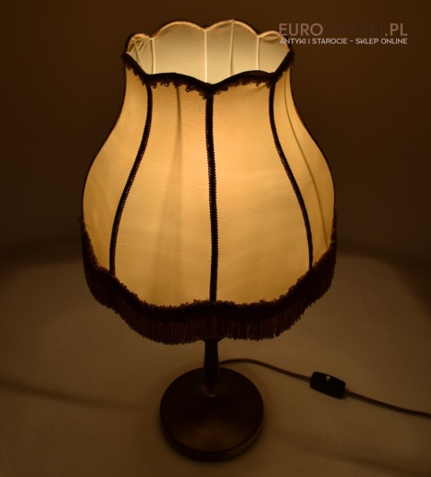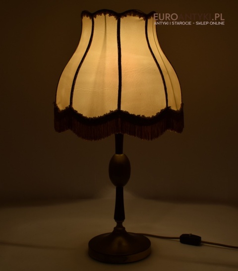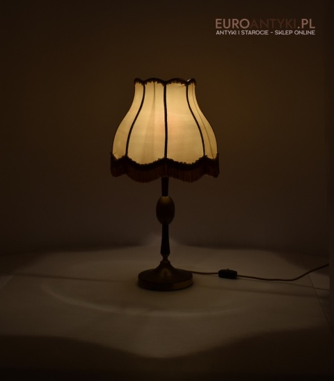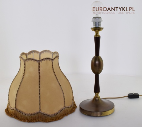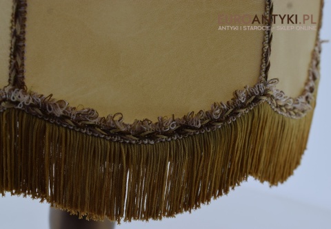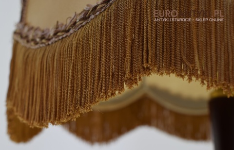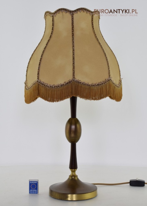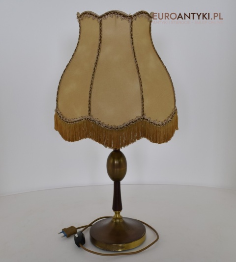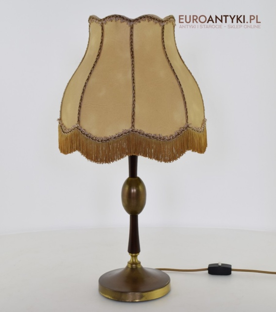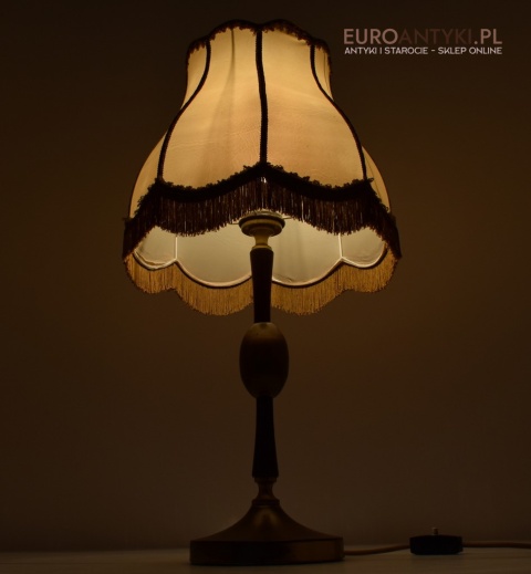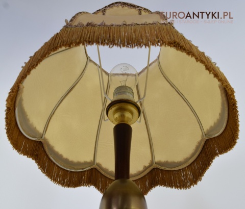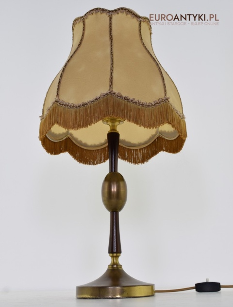 Lampa posiada abażur w kształcie korony, wykonany z delikatnej tkaniny, która pięknie rozprasza światło, tworząc przytulną atmosferę w pomieszczeniu. Abażur zdobią eleganckie, ciemne lamówki oraz dekoracyjne frędzle, co jeszcze bardziej podkreśla styl retro. Całość osadzona jest na solidnej nodze z drewna i mosiądzu, która z czasem nabrała pięknej patyny. Subtelne ślady użytkowania są widoczne na metalowych elementach, jednak tylko dodają one autentyczności i charakteru tej lampie.