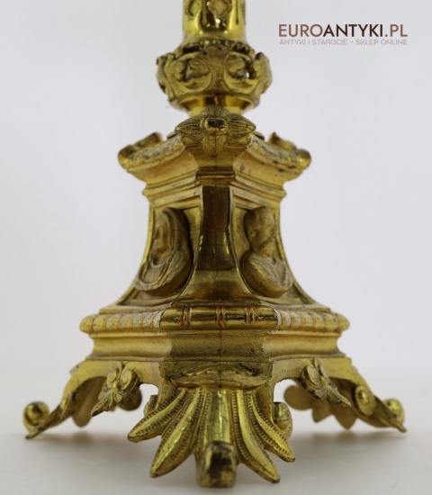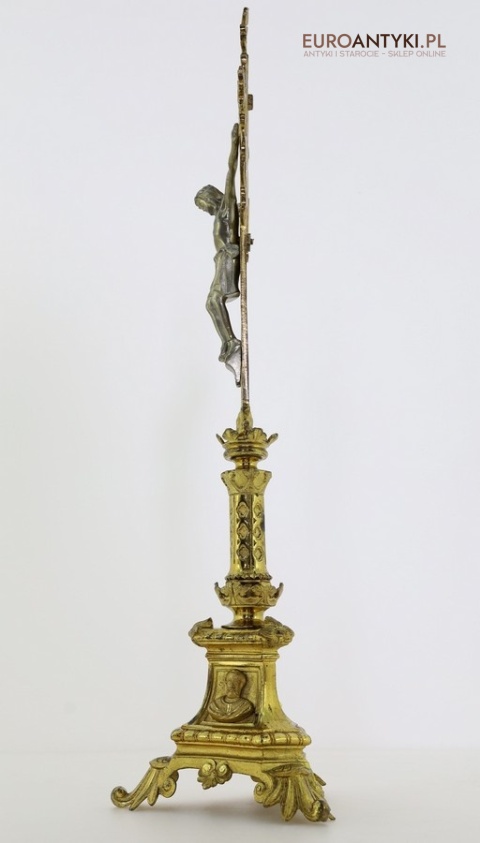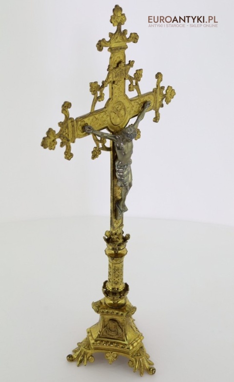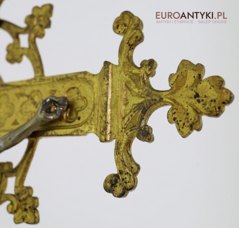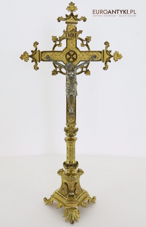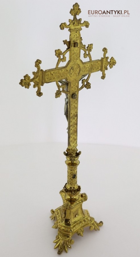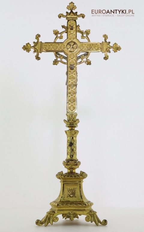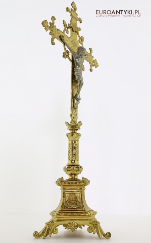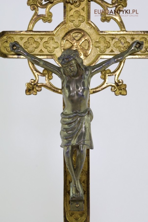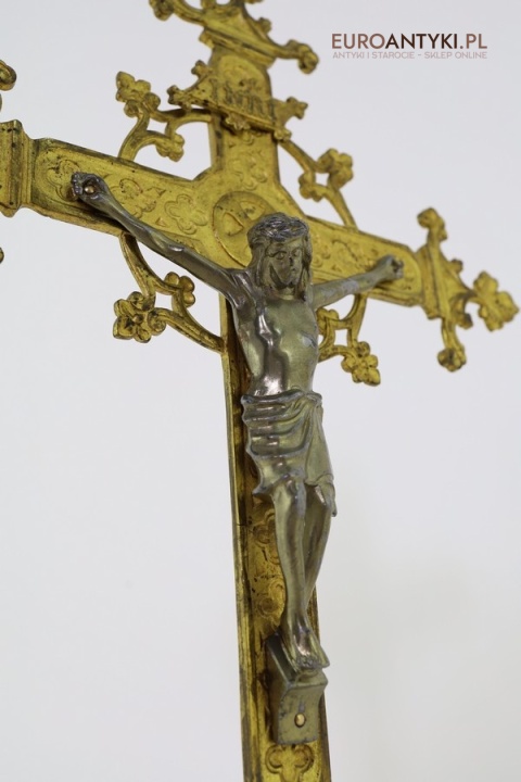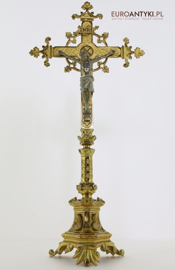 Przedmiotem oferty jest duży, zabytkowy krzyż ołtarzowy, wykonany z ciężkiego, masywnego mosiądzu, z wyrafinowanymi zdobieniami w stylu neogotyckim. Centralna postać Chrystusa została odlana ze szlachetnego, odpornego na korozję metalu – prawdopodobnie stopu cyny i srebra. Całość jest unikatem klasy muzealnej, sprowadzonym z Francji 🇫🇷