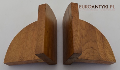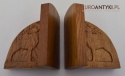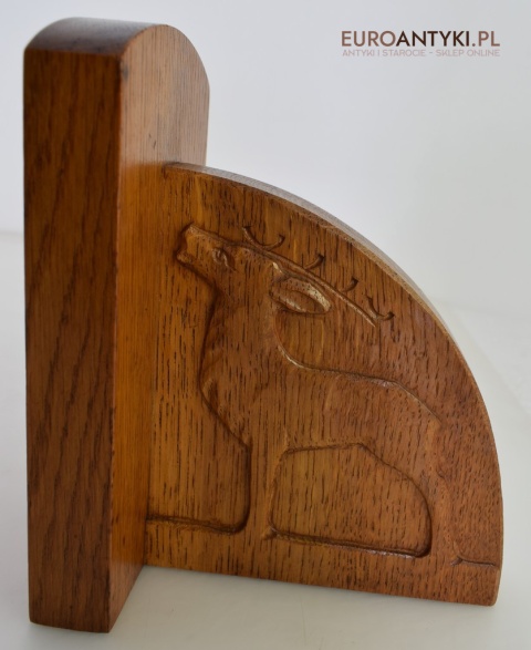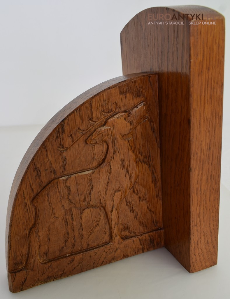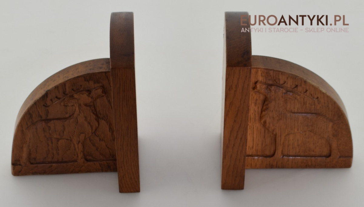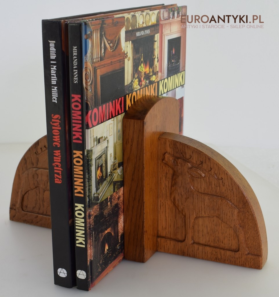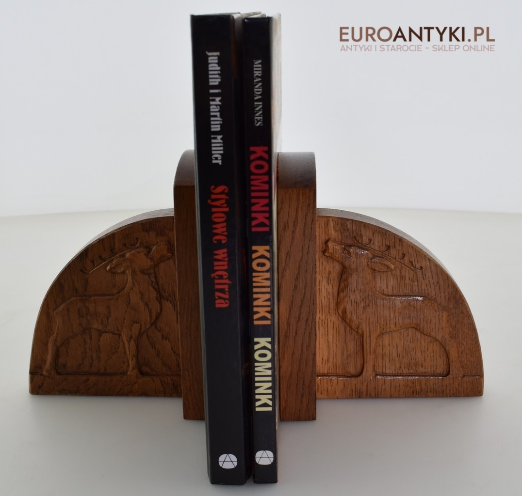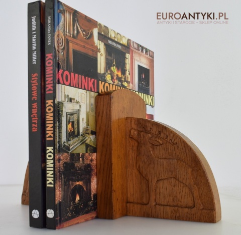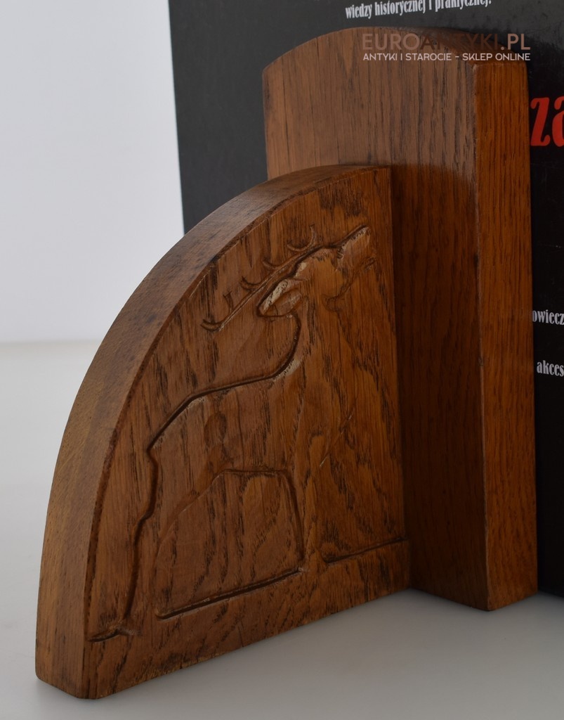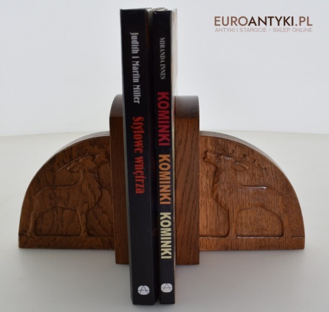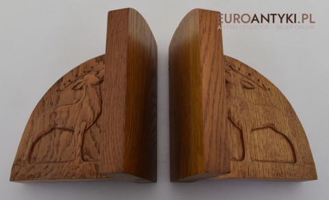 Zabytkowe dębowe podpórki do książek z jeleniami.
