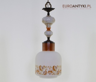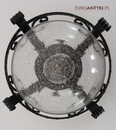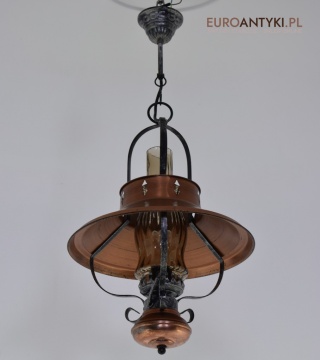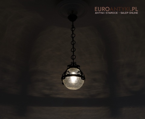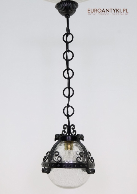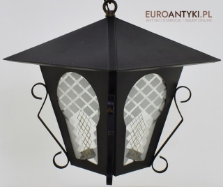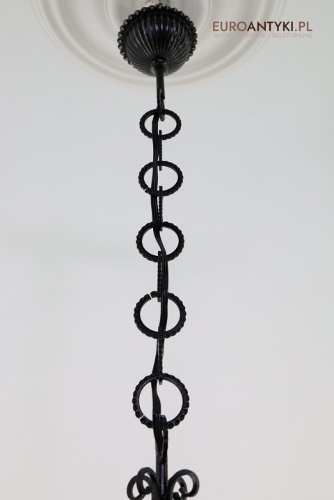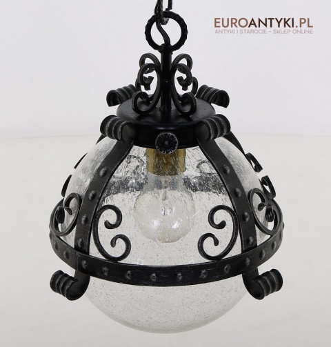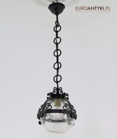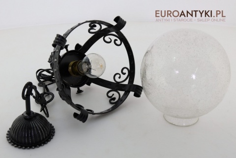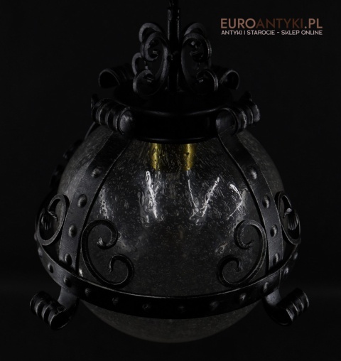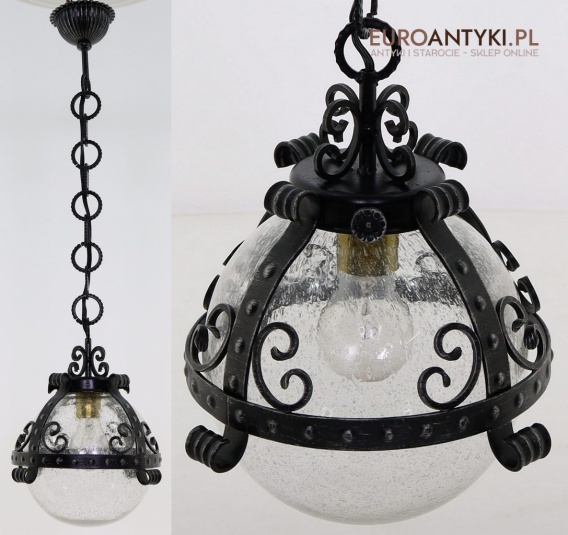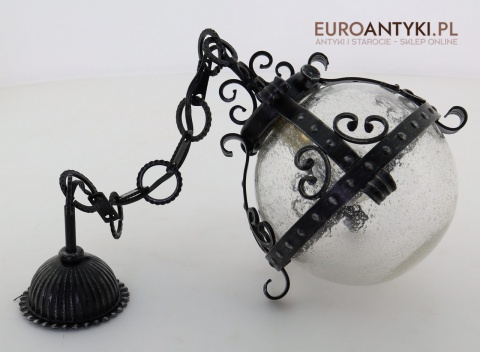 Lampa sprowadzona z Francji - pochodzi z lat 70. XX wieku, stanowi piękny przykład stylu zamkowego / rycerskiego, który nadaje się idealnie do wnętrz inspirowanych zamkowymi klimatami. Wyjątkowy design z dekoracyjnymi elementami metalowymi podkreśla solidność i historyczny charakter lampy, co czyni ją prawdziwą ozdobą.
