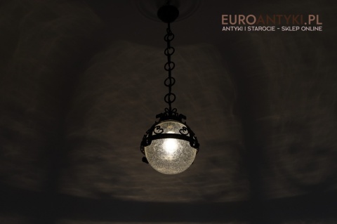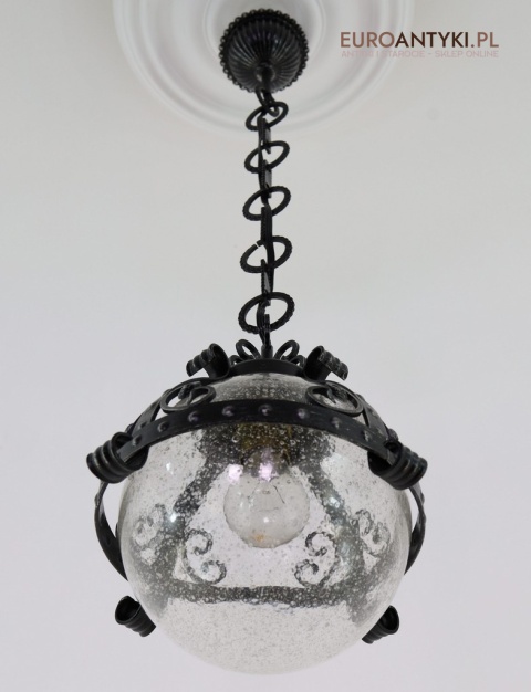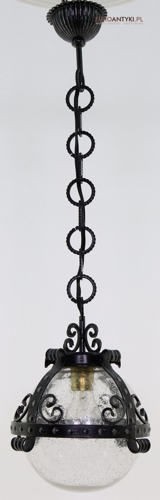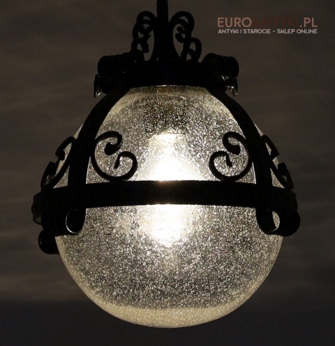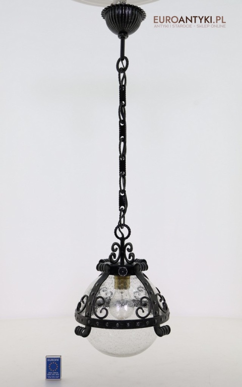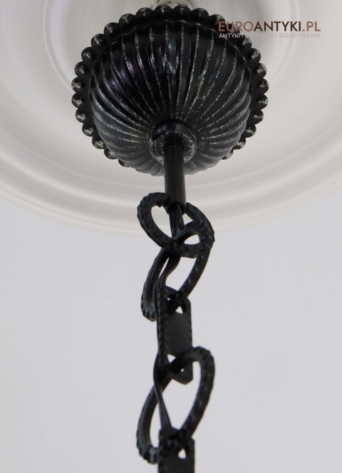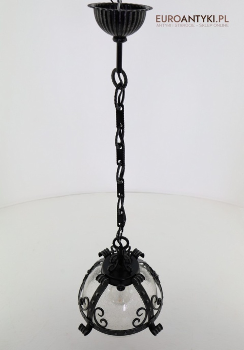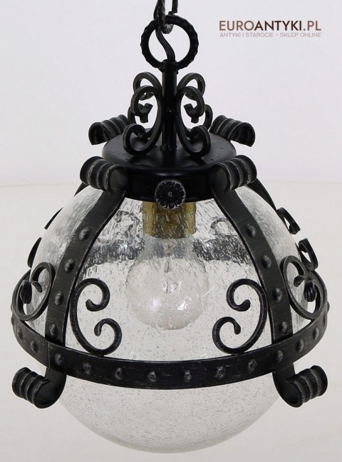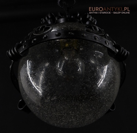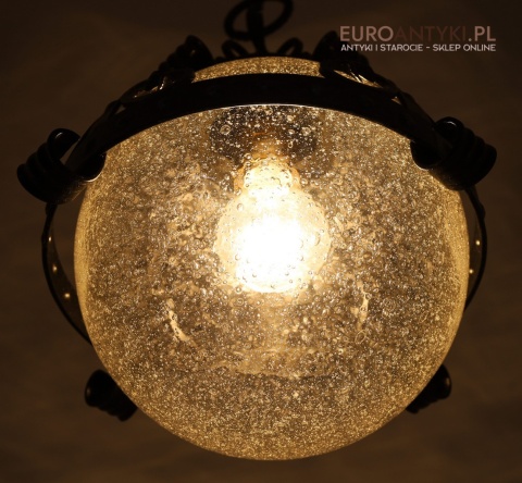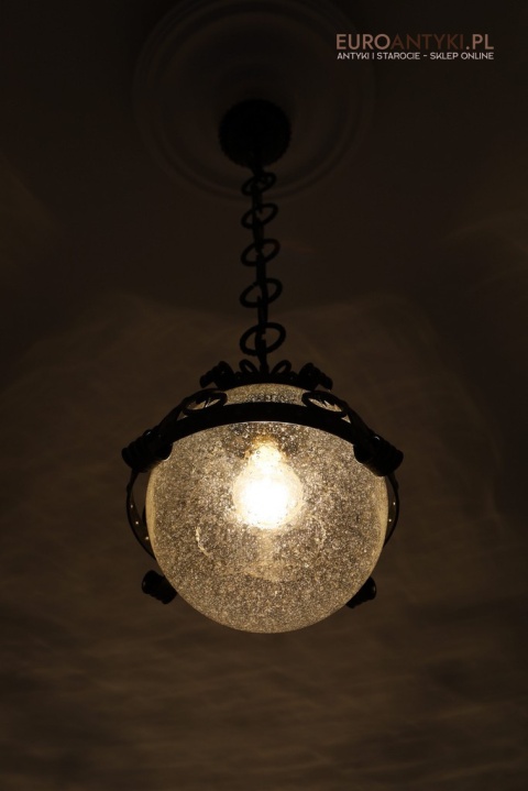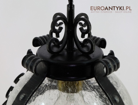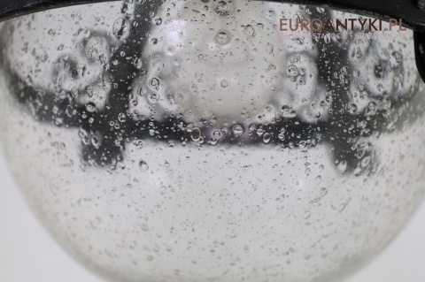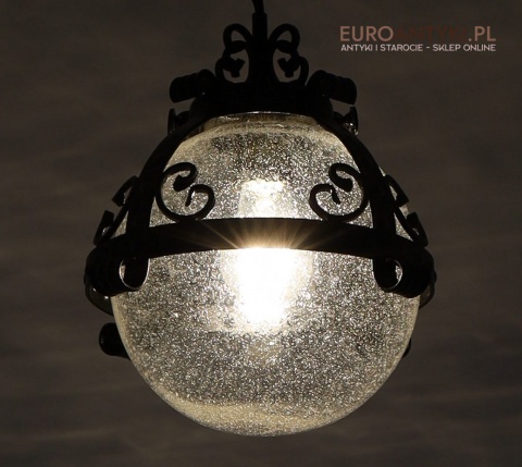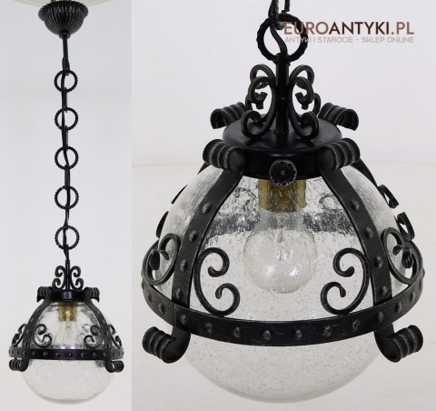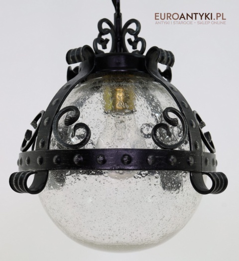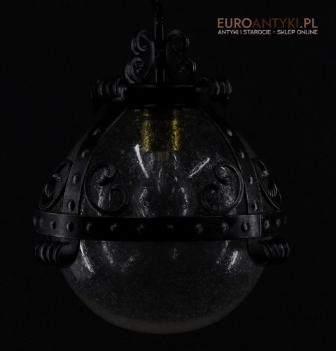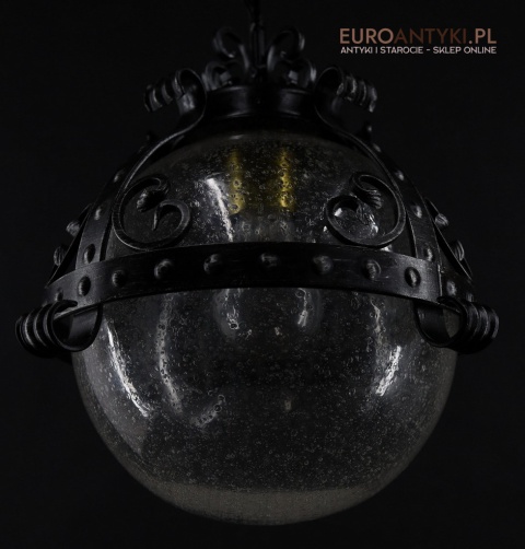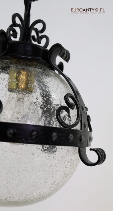 Prezentujemy zamkową lampę wiszącą wykonaną z kutego metalu, która przyciąga wzrok swoim czarnym wykończeniem z subtelnymi srebrnymi akcentami. Wyjątkowość tego przedmiotu podkreśla szklany klosz z charakterystycznymi bąbelkami powietrza w środku, które uzyskuje się dzięki specjalnej technice wytwarzania szkła. W procesie tym szkło jest ręcznie dmuchane i mieszane z drobnymi pęcherzykami powietrza, co daje efekt przydymionego, fakturowanego wyglądu.