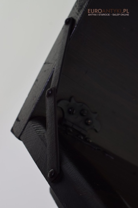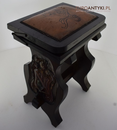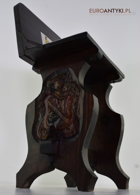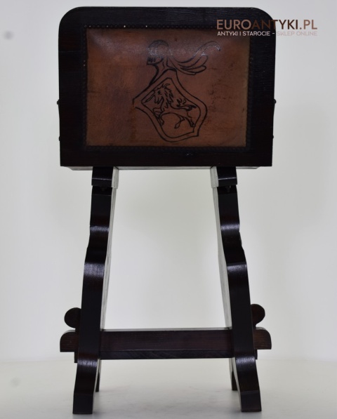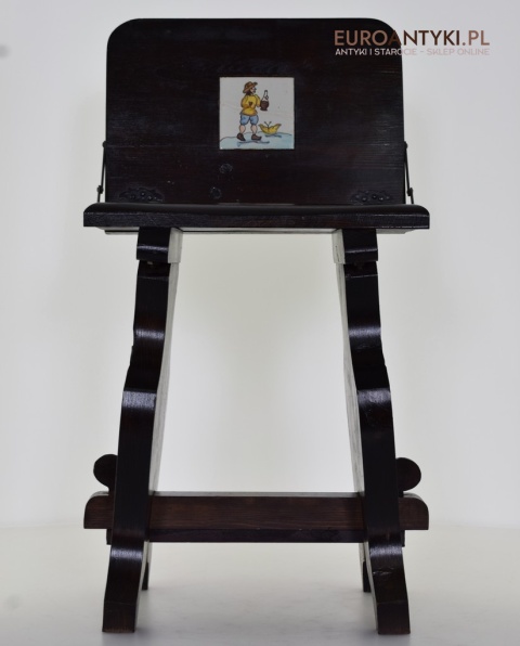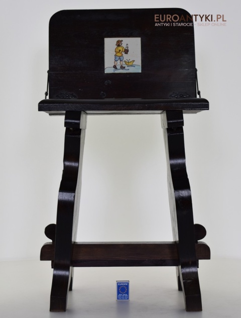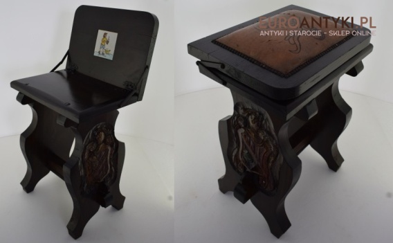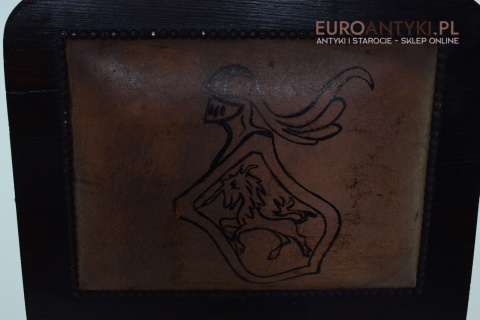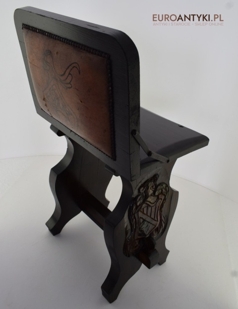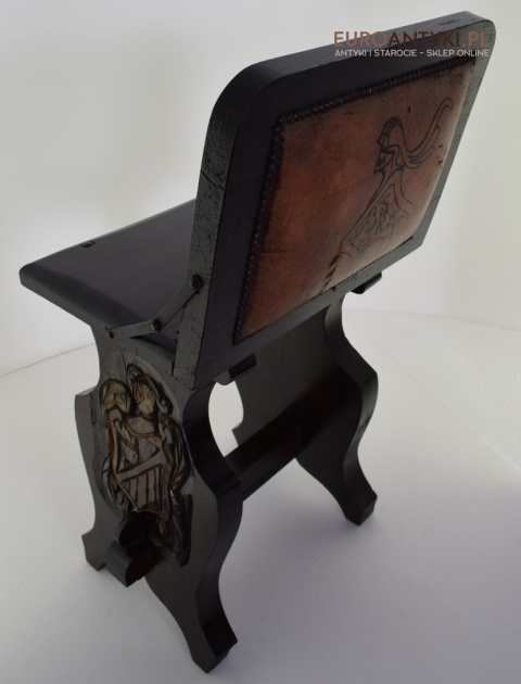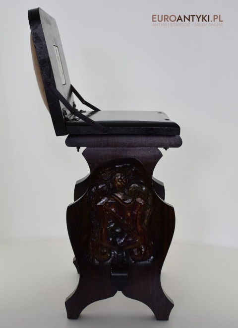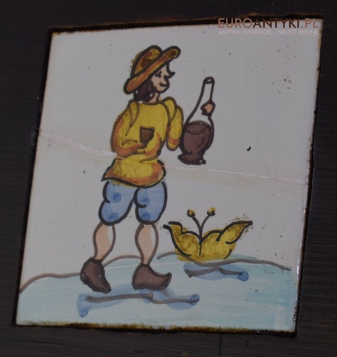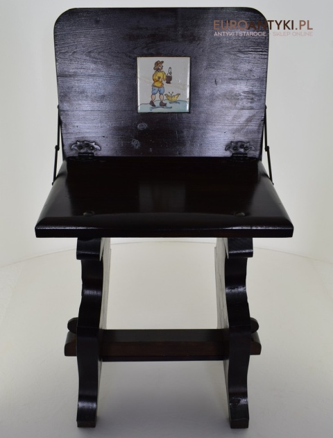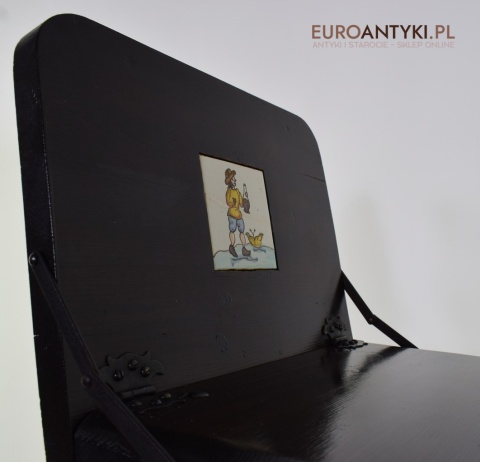 W górnej klapie oba siedziska posiadają ceramiczne kafle z motywem pijanego chłopa - kafelek był klejony. Na bokach ręcznie rzeźbienia rycerzy.