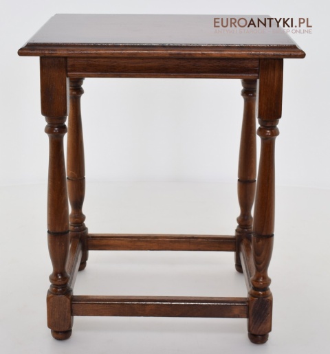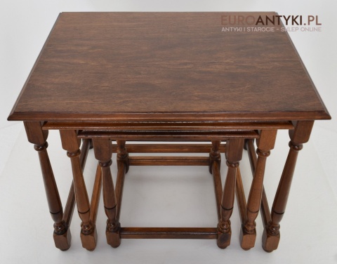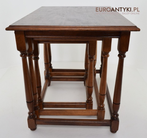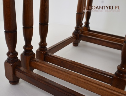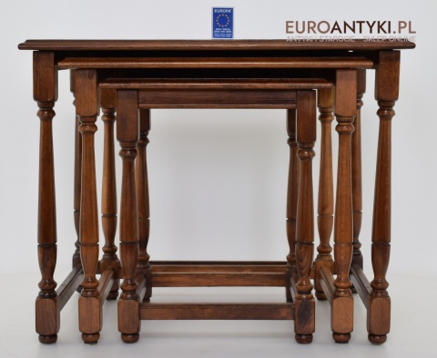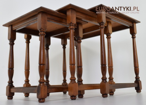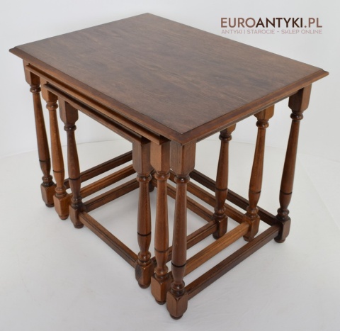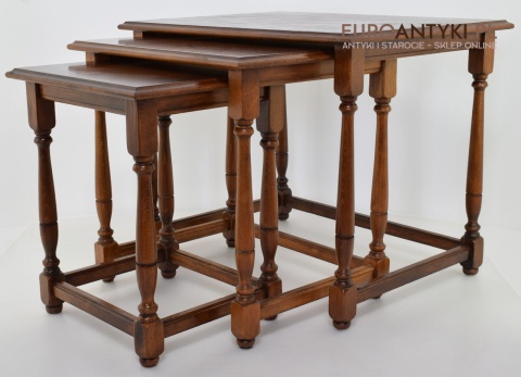 Stoliki są wolne od uszkodzeń i stanowią kompletny zestaw, gotowy do użycia w każdym eleganckim wnętrzu. Ich klasyczny design i funkcjonalność czynią je nie tylko praktycznym wyborem, ale również dekoracyjnym dodatkiem, który z łatwością wpisuje się w różnorodne aranżacje wnętrz. Każdy miłośnik antyków i stylowych rozwiązań znajdzie w nich coś dla siebie.