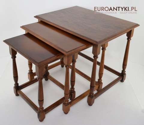 Prezentujemy Państwu wyjątkowy zestaw trzech drewnianych stolików, które doskonale oddają klasyczny urok stylu vintage. Stoliki te, sprowadzone z Francji, są idealnym przykładem rzemiosła połowy XX wieku, co gwarantuje ich autentyczność i wyjątkową jakość. Każdy element zestawu charakteryzuje się precyzyjnym wykonaniem z wysokiej jakości drewna, co zapewnia trwałość i stabilność konstrukcji.