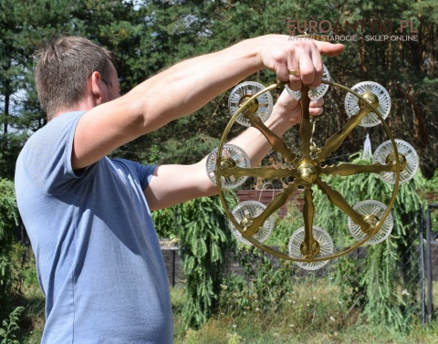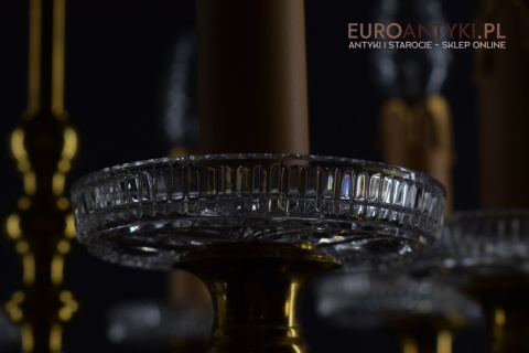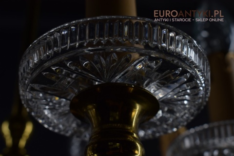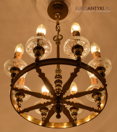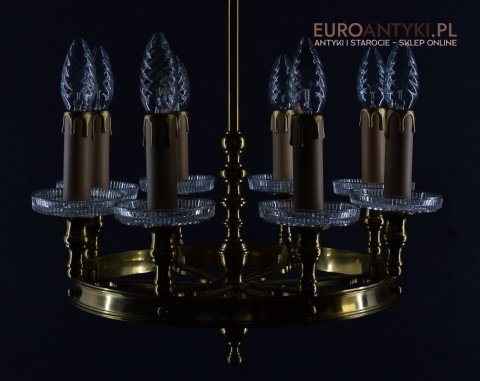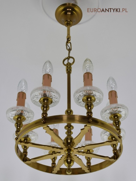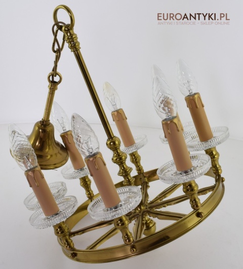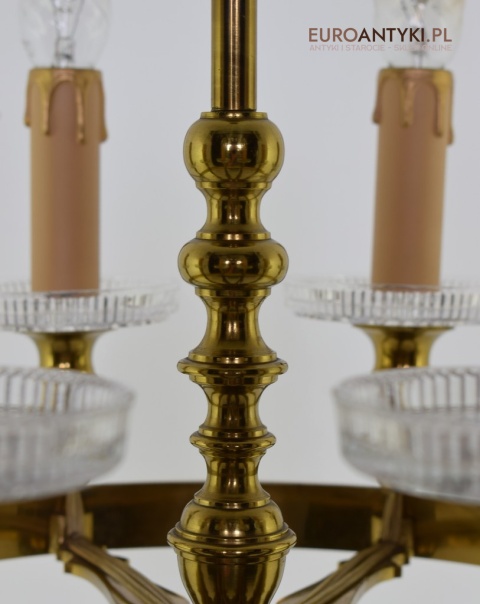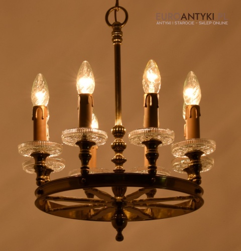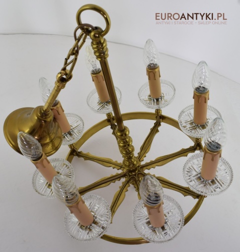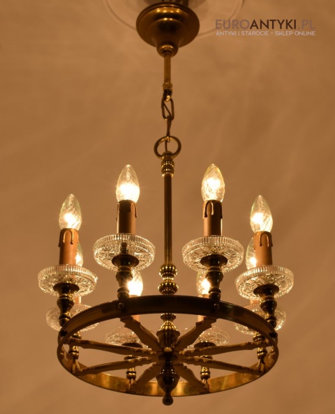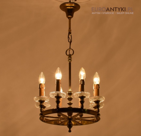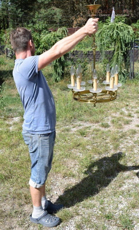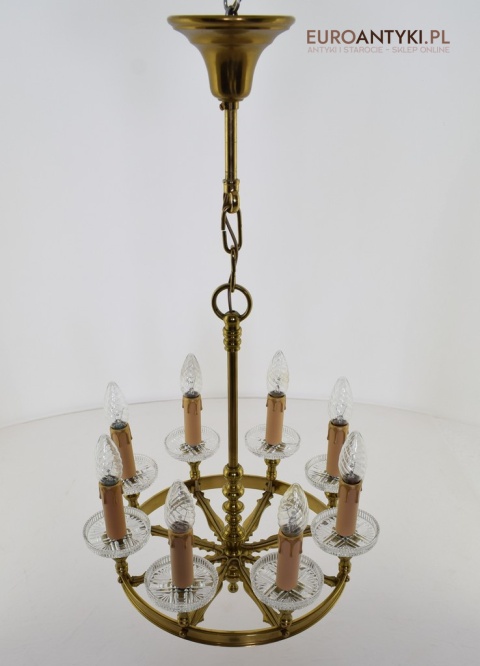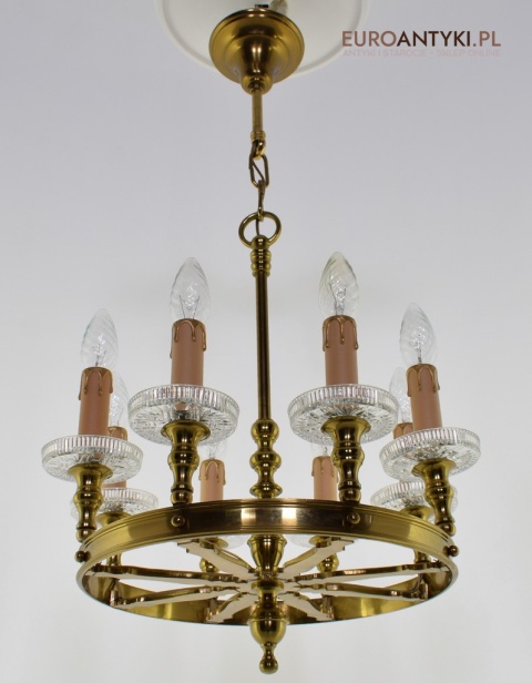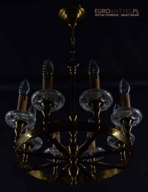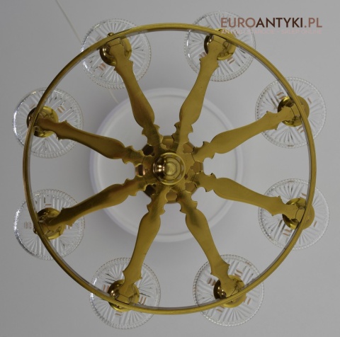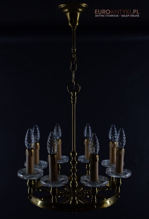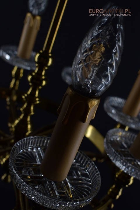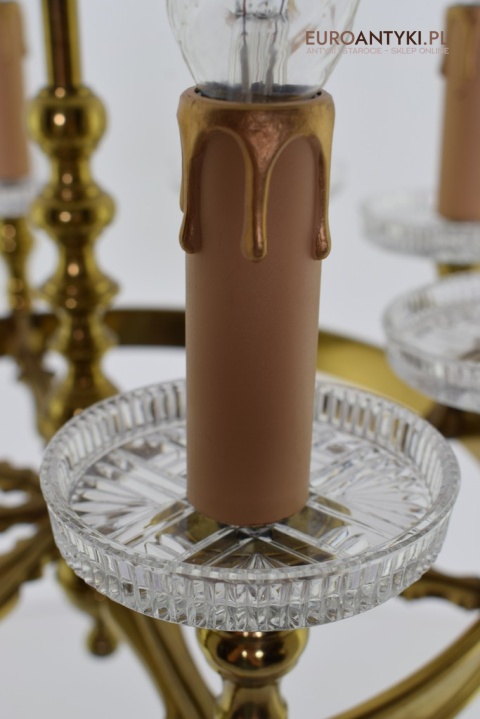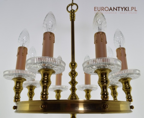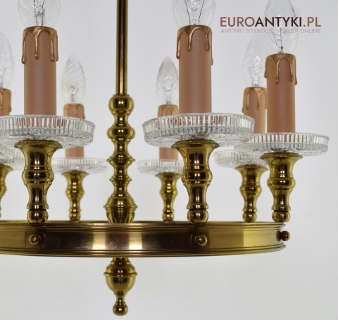 Ten masywny, złoty żyrandol wykonany z wysokiej jakości mosiądzu, to kwintesencja elegancji i stylu z drugiej połowy XX wieku. Charakterystyczny dla epoki retro design został wzbogacony o kryształowe talerzyki umieszczone pod gilzami, które pod wpływem światła mieniają się subtelnie barwami tęczy, tworząc niezwykle efektowną grę światła, ale trudną do uchwycenia na fotografii. Gilzy zostały wymienione na nowe, w stylu vintage, co podkreśla autentyczność i dbałość o szczegóły tego wyjątkowego żyrandola.