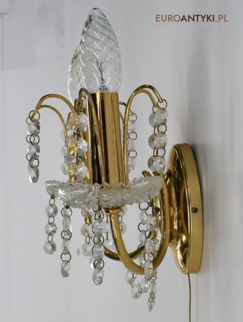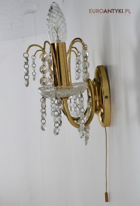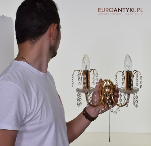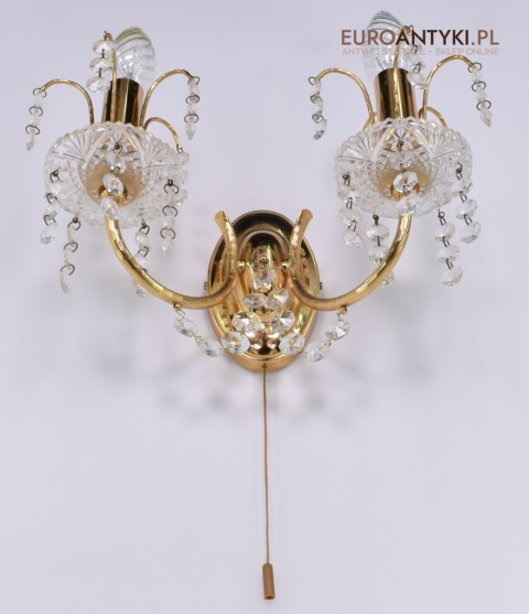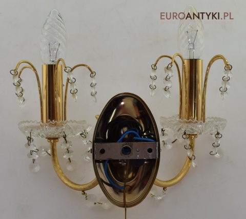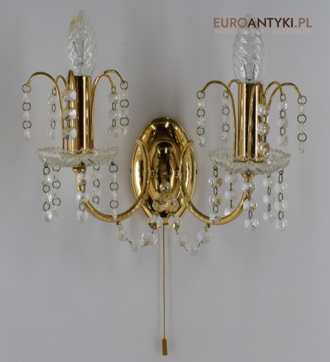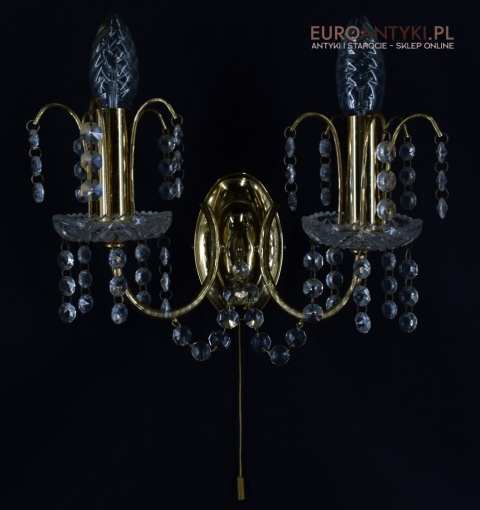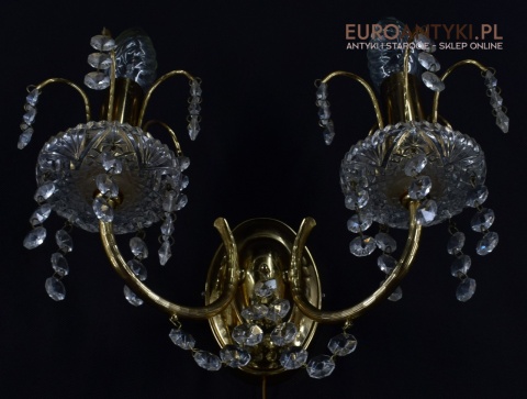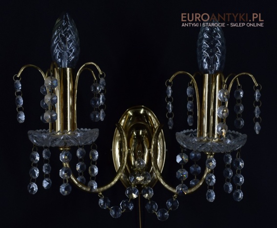 Starodawny kinkiet mosiężny z kryształowymi ozdobami.