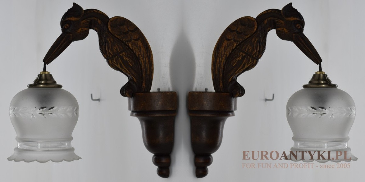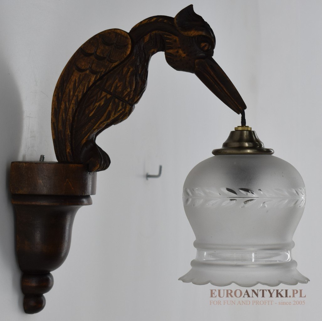 To zdjęcie pod spodem przedstawia rzeźbiony element w kształcie ptaka, który jest częścią antycznej lampy. Ptak ten ma długi, zakrzywiony dziób i jest przedstawiony w pozycji z głową zwróconą w dół, co może sugerować, że jest to orzeł lub inny drapieżny ptak, często używany jako motyw dekoracyjny w antykach i elementach oświetlenia z epoki wiktoriańskiej lub art deco. Długi, haczykowaty dziób i wyraziste pióra są charakterystyczne dla wielu drapieżnych ptaków, więc może to być stylizowana interpretacja takiego ptaka.